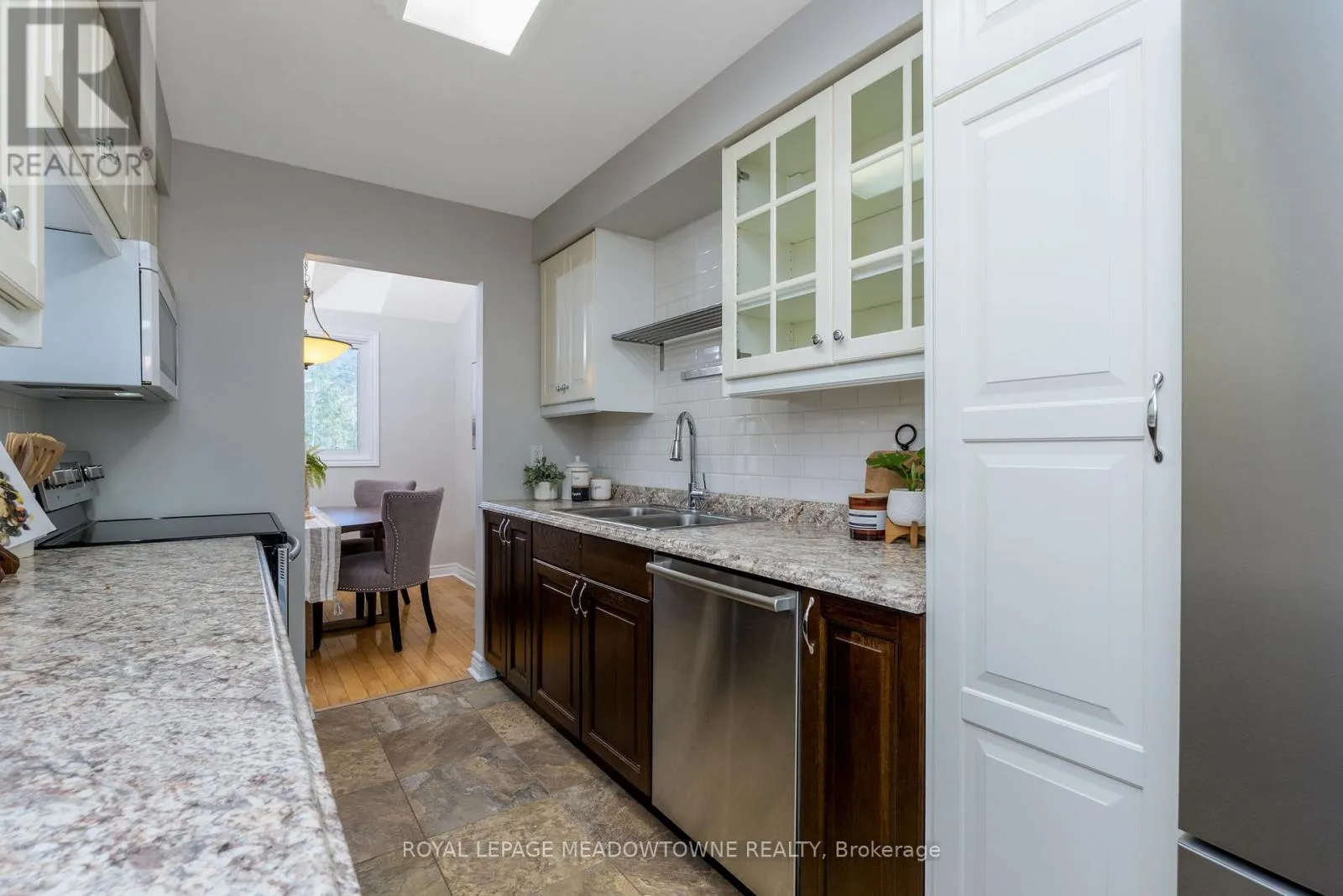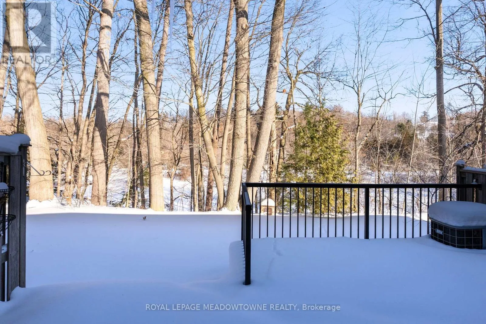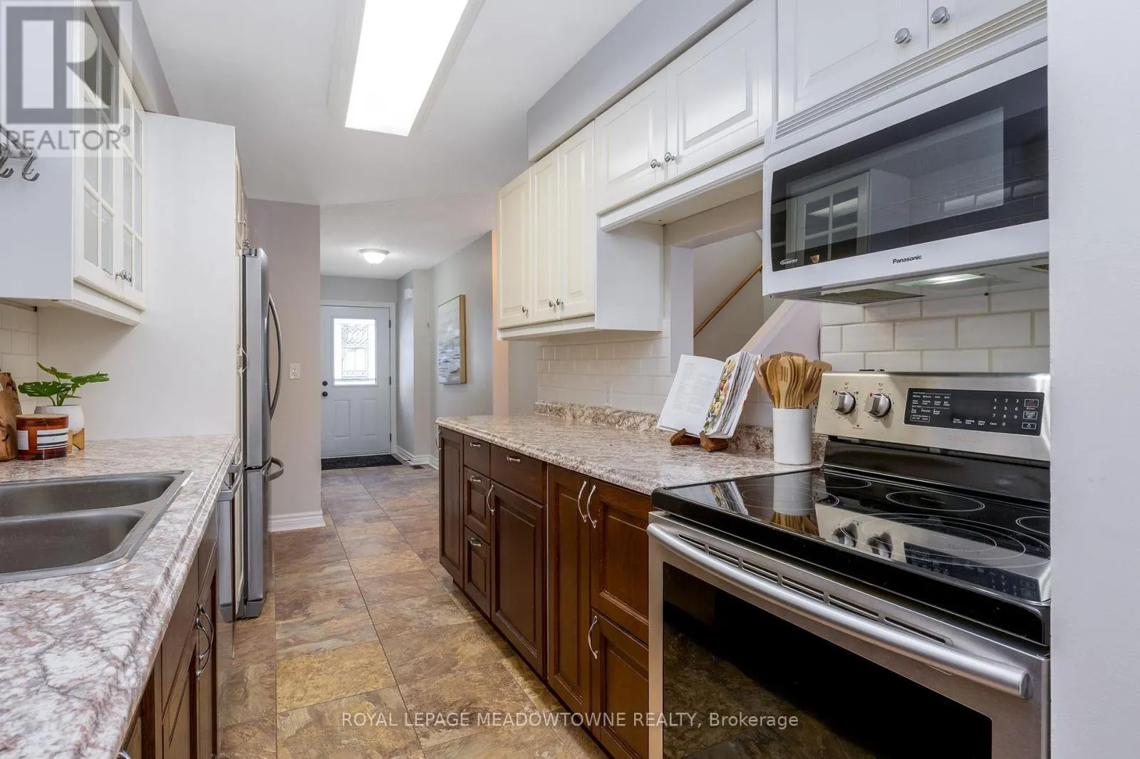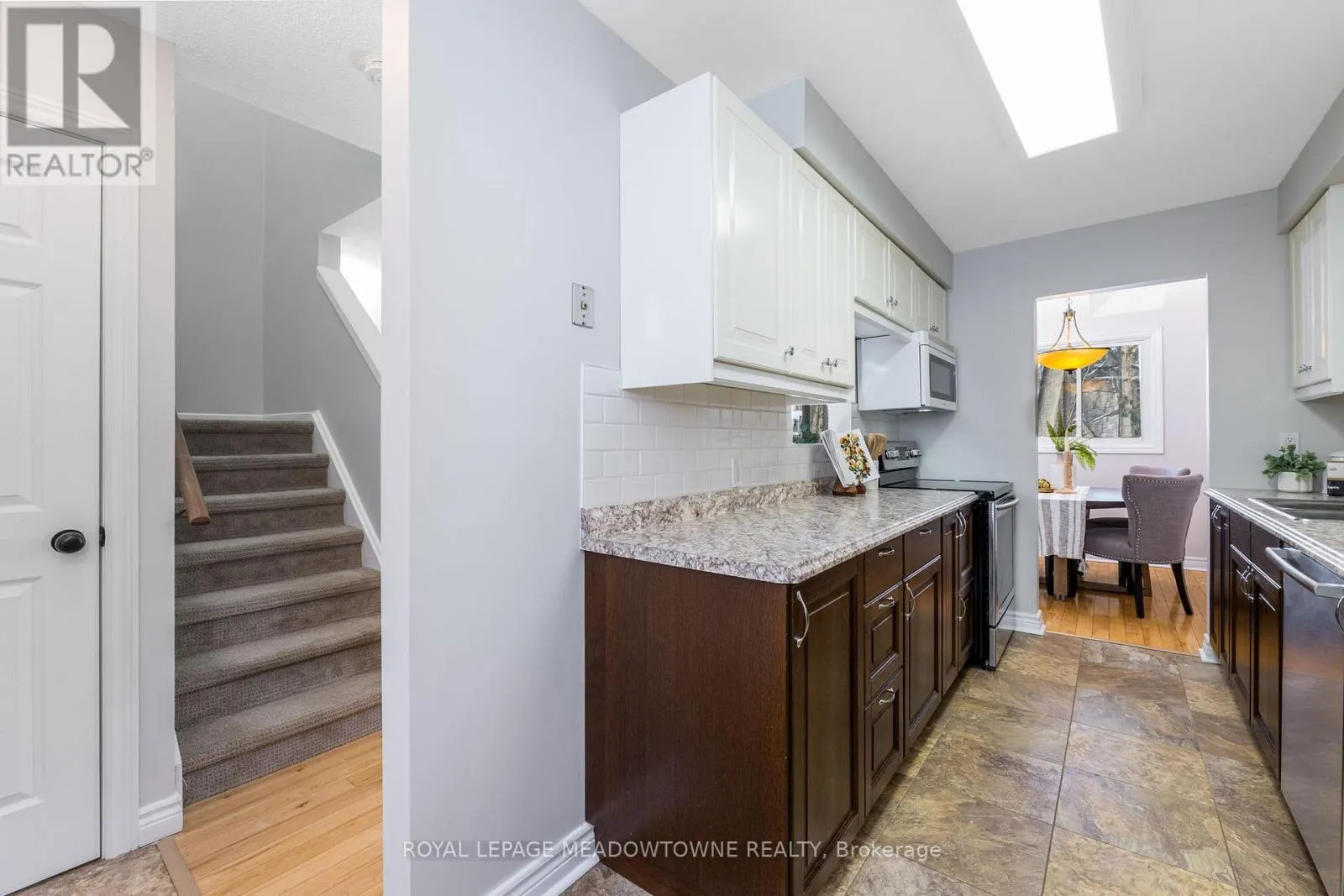 Cross Streets: River Dr/Mountainview Rd N. ** Directions: North on Mountainview Rd N, East on River Drive, North on John St, East on Lynden Circle. Move-in Ready 3 bedroom, 2 bathroom townhouse overlooking the serenity of the Credit River. Before stepping inside, take a moment to appreciate the stone porch and the curb appeal of the etched glass insert in the front door casting light into foyer. The living room with hardwood floors opens to a large deck guaranteed to provide a happy place for meals and gatherings. The updated kitchen with a pass-thru, glass cupboards, white tile backsplash and stainless steel appliances leads to the dining area which is illuminated by skylights. Upstairs there are three freshly painted bedrooms and a semi-ensuite 4-piece bathroom adjacent to the large primary bedroom with wall-to-wall closets. The finished rec room provides additional space to relax and play. (id:27476)
