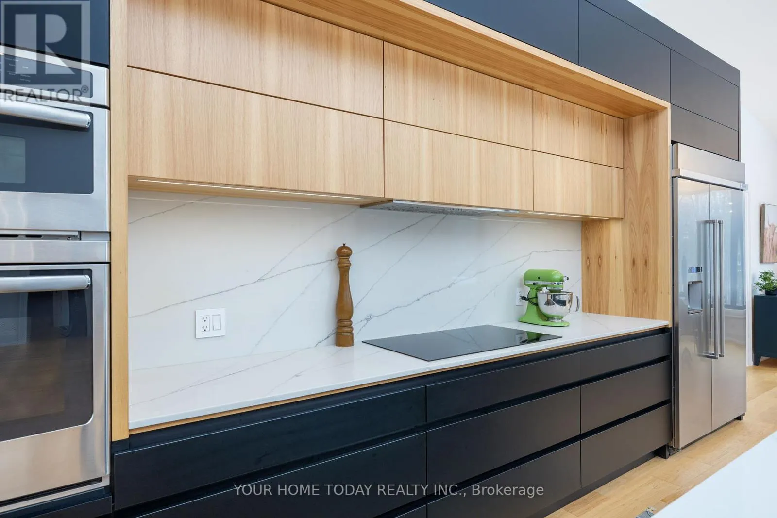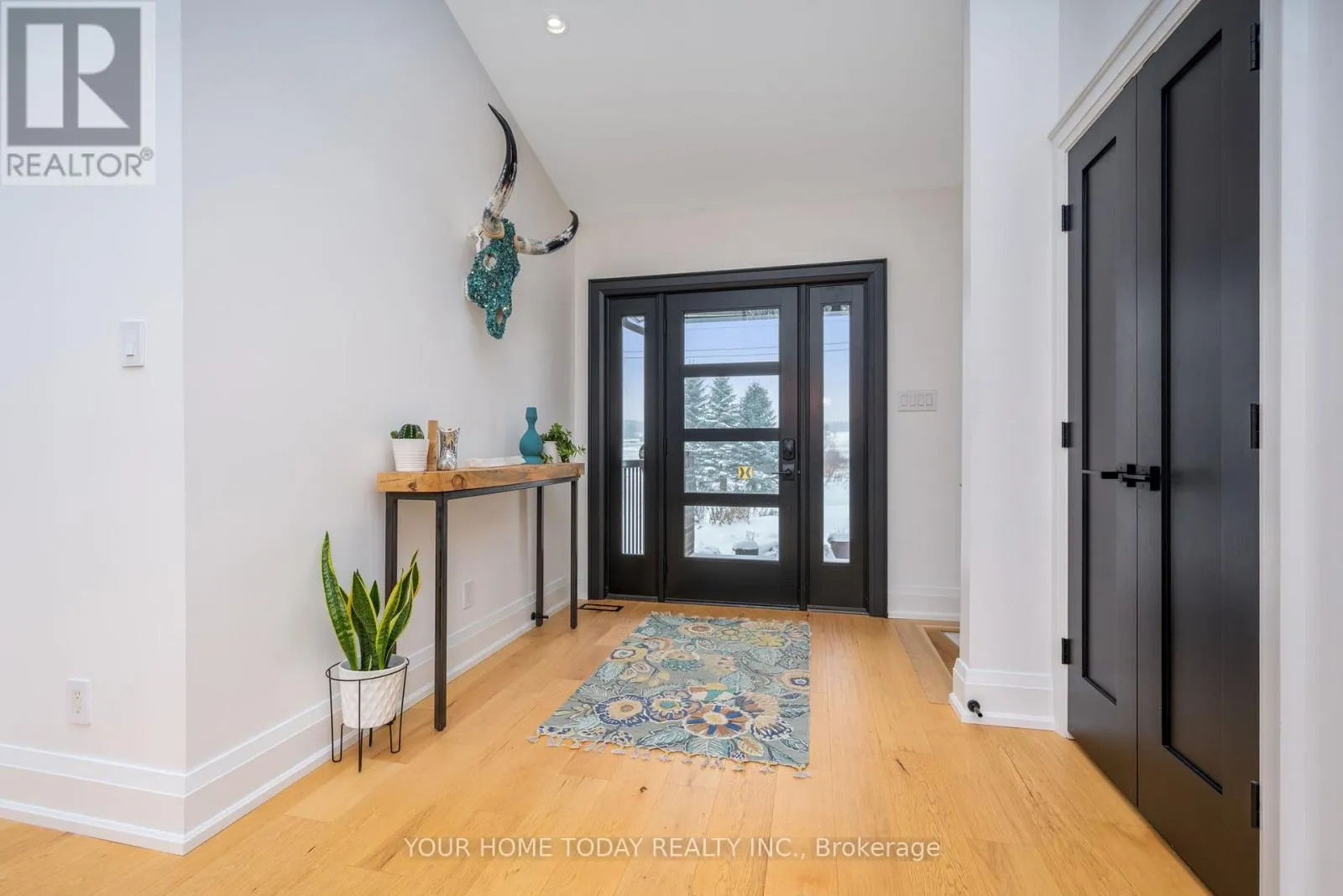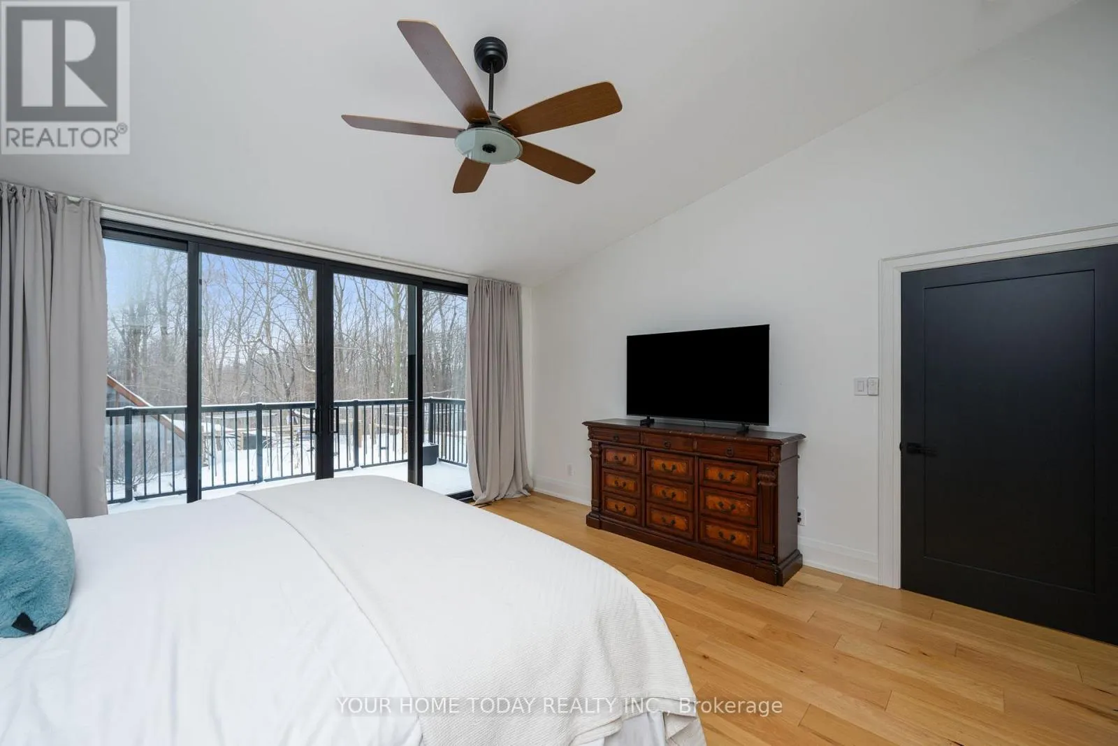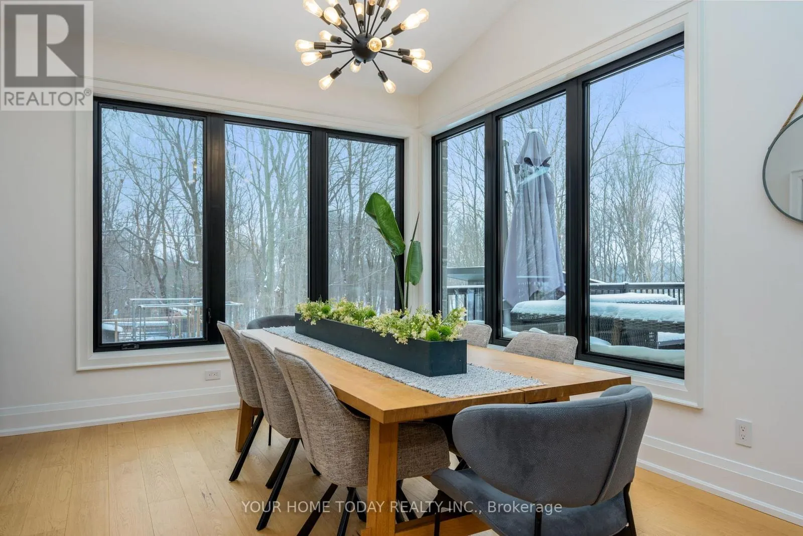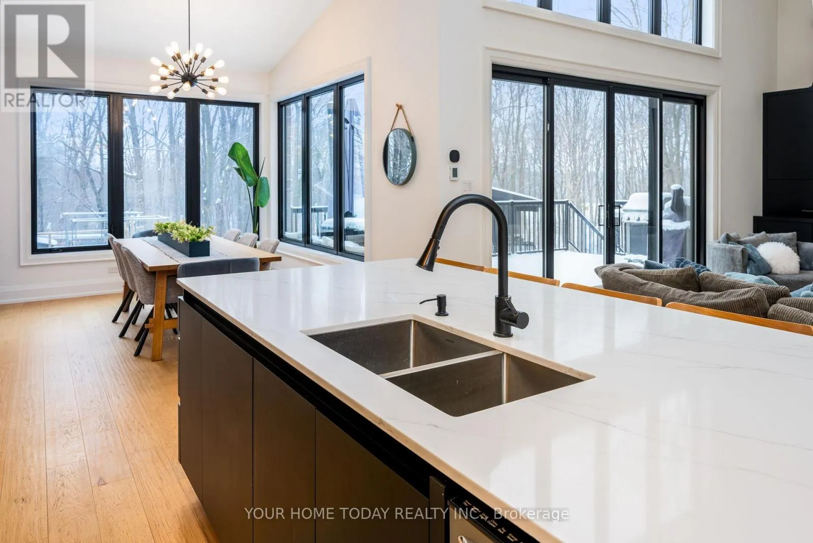 Cross Streets: Highway 25 & 15 Sdrd. ** Directions: Highway 24, 15 Sideroad, Third Line. Set on a rare and private half-acre lot surrounded by mature Niagara Escarpment trees, this architecturally distinctive home offers refined country living with the feel of a modern cottage, without the commute to cottage country. Located on an exclusive street where homes rarely come to market, this is a truly special offering. Rebuilt in 2021, the home is designed to embrace its natural setting. The open-concept great room features soaring 16-foot vaulted ceilings, engineered natural hickory floors, and a striking floor-to-ceiling wood-burning fireplace. Expansive floor-to-ceiling windows span the rear of the home, with forest views and filling the space with natural light. When the trees are in full bloom, the home enjoys complete privacy. The chef-inspired kitchen showcases a custom Euro-style design with quartz countertops, quartz backsplash, and an impressive 10' x 4' island-perfect for entertaining while enjoying uninterrupted views of nature from every angle of the kitchen, dining, and living areas. The primary suite is privately located off the dining area and offers a peaceful retreat with a spa-like ensuite featuring a freestanding soaker tub, oversized glass shower, double vanity, and a large custom walk-in closet. A separate wing, tucked behind a pocket door off the living room, includes two spacious bedrooms and a beautifully finished 3-piece bathroom, ideal for family living or hosting guests. Outdoor living is exceptional, with professionally landscaped stone patios, tiered gardens, and multiple seating areas set against a serene backdrop. Completing the property is a attached garage with a finished second-level studio and storage, ideal for a home office, creative space, or gym. A rare opportunity to enjoy private, nature-inspired luxury on a highly sought-after street. (id:27476)