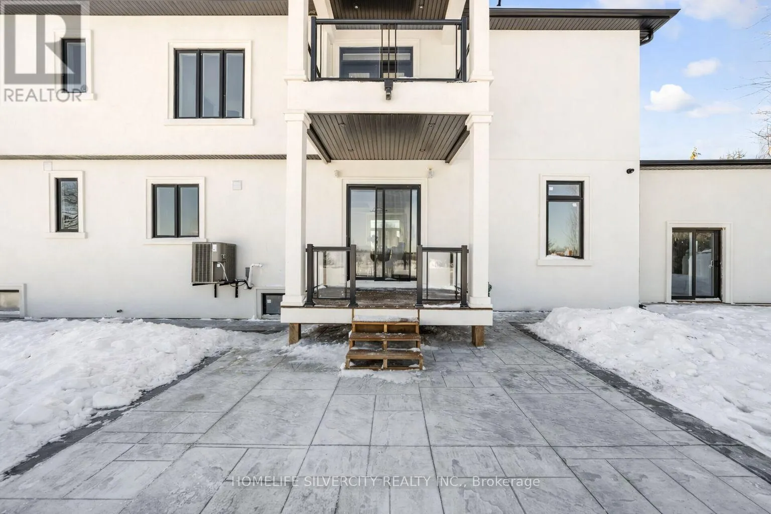 Ninth Line & Fallbrook This modern two-storey home offers striking curb appeal with a modern stone and stucco exterior, warm wood accents, and a grand columned entrance. The elevated entry and wide driveway enhance its impressive presence, showcasing quality craftsmanship and thoughtful contemporary design. Inside, the home opens to a bright layout with high soaring ceilings, recessed lighting, and large windows that flood the space with natural light. Light hardwood floors and elegant wall paneling add warmth and sophistication. A statement staircase with detailed paneling, vertical accent lighting, wood railings, and a modern chandelier creates a stunning focal point. The chef-inspired kitchen features sleek two-tone cabinetry, quartz countertops with waterfall edges, and an oversized island with stylish pendant lighting. Built-in stainless-steel appliances and glossy finishes make this space both functional and refined. The adjoining family room offers a coffered ceiling with pot lights, expansive windows, and a linear fireplace set against a contemporary feature wall. The dining area is finished with paneled walls and large sliding doors for seamless indoor-outdoor flow. A main floor bedroom with a full bath provides flexibility for guests or extended family. Upstairs, the primary suite includes a tray ceiling, accent wall, fireplace, spa-like ensuite, and covered balcony. All additional bedrooms feature spa like baths. The finished basement offers open recreation space, a modern washroom, and large windows, while the backyard and upper balcony provide generous outdoor living. The front and backyard feature stamped & gravel driveway in soft grey tones, creating a clean and modern space around the home. The natural veining and defined borders add a refined finish while offering durability and low maintenance for outdoor living. (id:27476)