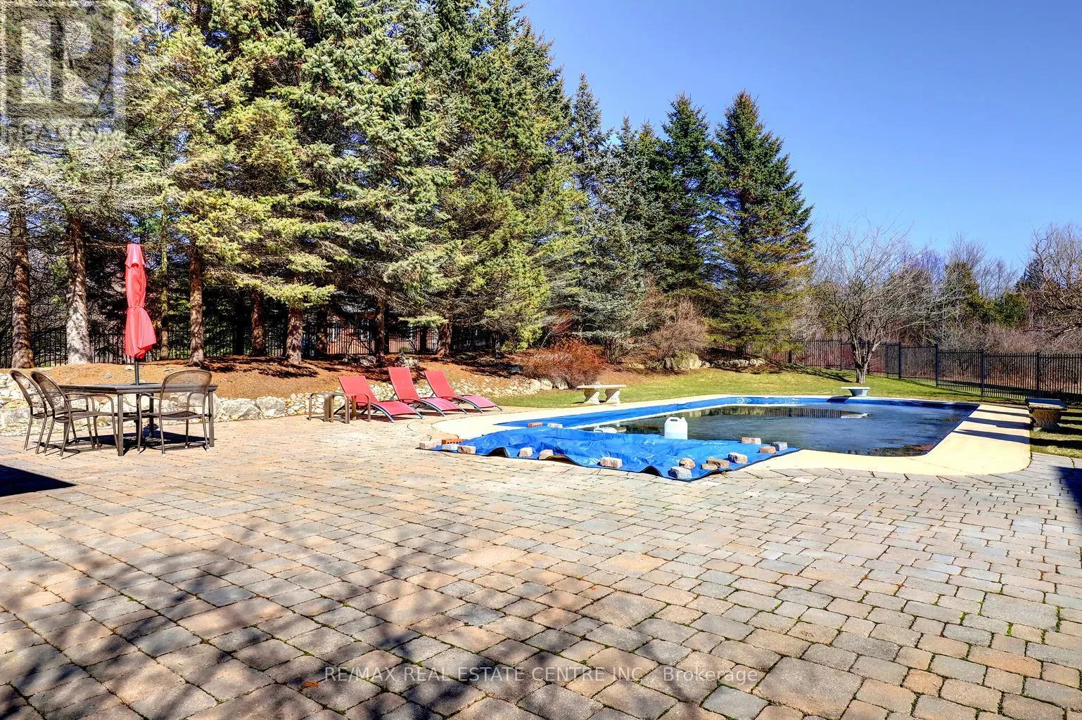 Cross Streets: Nassagaweya-Esquesing Townline & Deer Run Crescent. ** Directions: Hwy 25 to 17th Sideroad, Nassagaweya-Esquesing Townline to Deer Run Crescent. Welcome home. Set on a premium lot in a sought-after Halton Hills enclave, 8 Deer Run Crescent offers a rare opportunity to own a spacious executive residence in an established community. With timeless curb appeal and a private backyard featuring a pool, cabana, and mature trees, the exterior provides exceptional outdoor living. The property spans nearly 4 acres, including a portion of protected conservation land, offering a natural setting with added privacy. The home offers approximately 3,100 sq ft above grade, plus a finished walkout lower level, with a functional layout and generous principal rooms, presenting an opportunity to personalize the space. The main level features 9-ft ceilings, hardwood flooring, crown moulding, and a double-sided fireplace. The kitchen includes granite counters, travertine backsplash, built-in appliances, and walkout to a deck with gas BBQ hookup and awning. A mudroom with laundry and access to the oversized 3-car garage adds convenience. Upstairs offers four bedrooms, including a primary suite with fireplace, walk-in closet, and 5-piece ensuite. The finished walkout lower level provides additional living space with large windows, fireplace, wet bar, and bedroom with ensuite, suitable for extended family or guests. Additional features include a thermal-heated pool, pool house, landscaped grounds, irrigation system, and recent updates such as roof and eavestrough improvements. Conveniently located near Milton, Guelph, and Acton, with access to amenities, schools, and commuter routes. (id:27476)