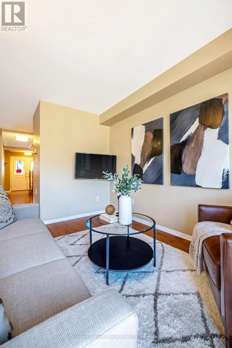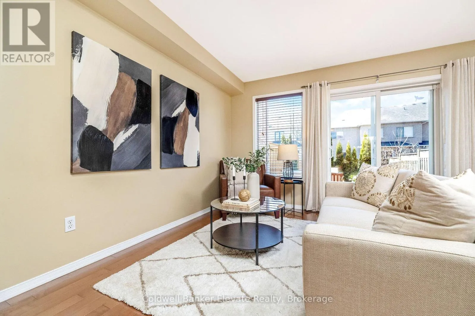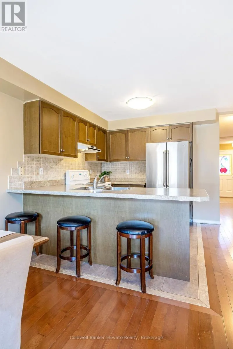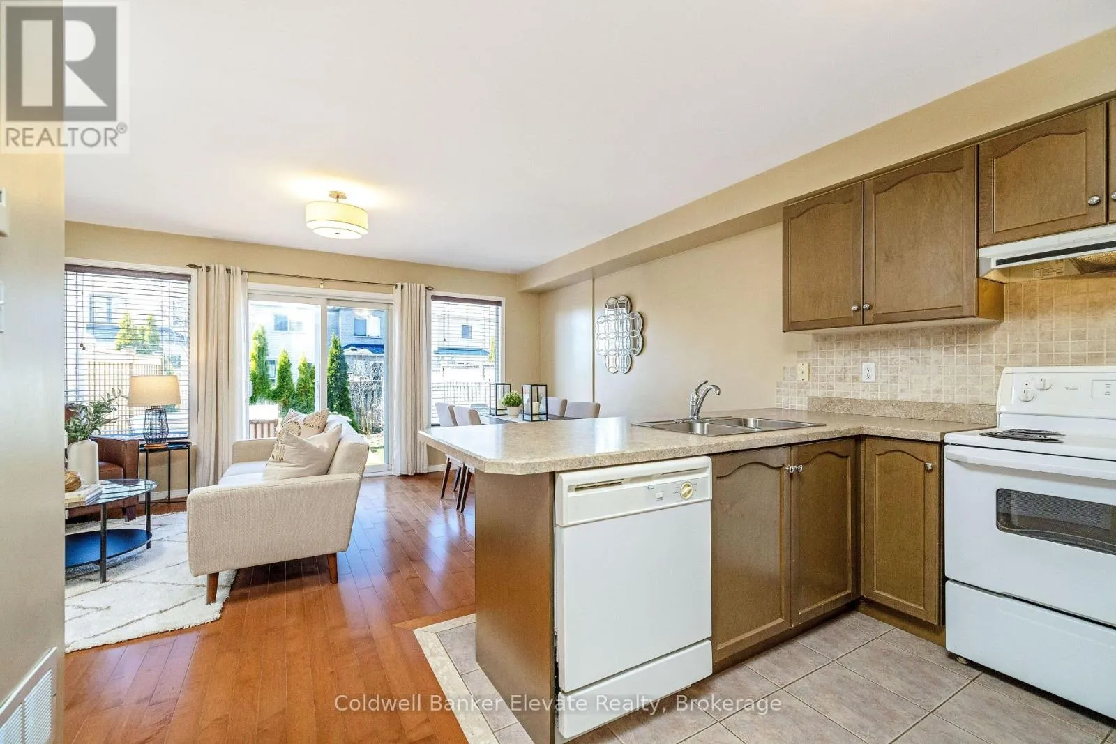 Cross Streets: Maple/Harding. ** Directions: Mountainview Rd N to Maple Ave or Dominion Gardens Dr to Harding Street. Welcome to this beautifully maintained freehold townhouse offering comfort, functionality, and thoughtful updates throughout. The landscaped front yard, stone walkway, and covered front porch create a warm and inviting first impression, complete with a private driveway with parking for two and an attached garage with overhead and hanging storage. Step inside to a bright and welcoming main level featuring solid 3/4 inch hardwood flooring through the hallway, living room, and breakfast area. The open concept layout is ideal for both everyday living and entertaining, with large windows and a double sliding glass door walkout that fills the space with natural light and provides seamless access to the backyard. The kitchen is both functional and inviting, offering warm brown cabinetry with curved panel detailing, a tile backsplash with multiple outlets, stainless steel appliances, and a breakfast bar with comfortable seating. Upstairs, the spacious primary bedroom offers a peaceful retreat with two windows overlooking the backyard, a chandelier, and two double closets for ample storage. The semi-ensuite 3 piece bathroom features a tub and shower combination, built-in vanity, and convenient access from both the bedroom and hallway. A second bedroom with front yard views, broadloom flooring, and a double closet completes this level. The unfinished basement presents excellent potential, with framing and electrical already completed, offering a great opportunity to create additional living space, a recreation area, or a home office. The private backyard is a true highlight, featuring a brand new spruce deck (2025), new fencing (2025), and beautifully landscaped gardens filled with mature perennials including hydrangeas, lilies, and magnolias, creating a peaceful outdoor setting to enjoy. A wonderful opportunity to own a move-in ready home in a family friendly neighbourhood with space to grow and make it your own. (id:27476)