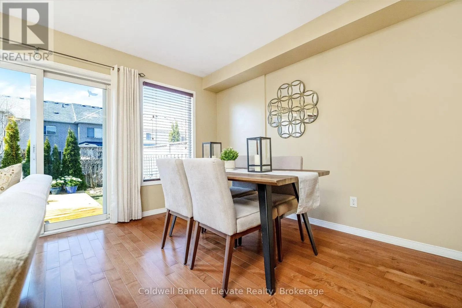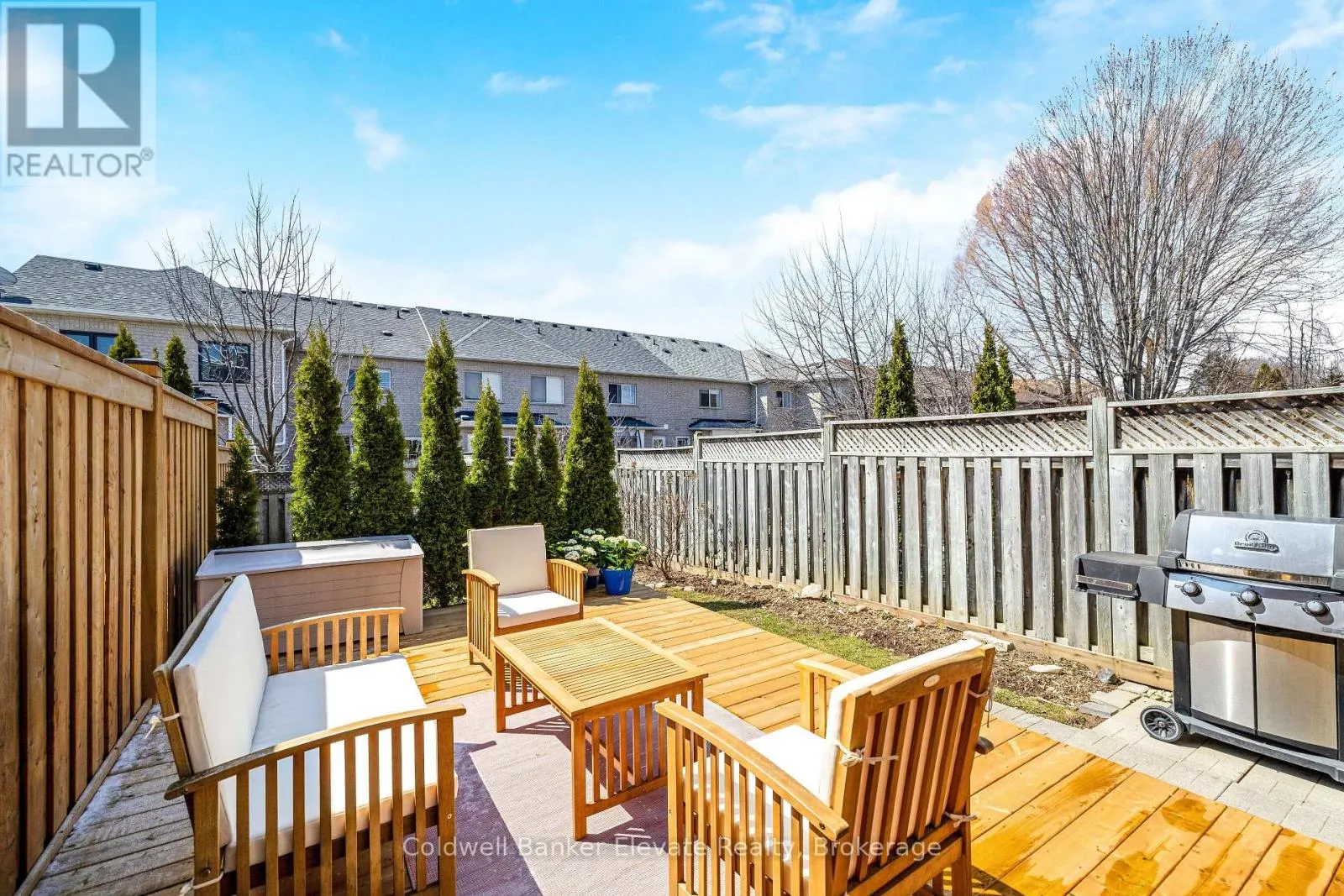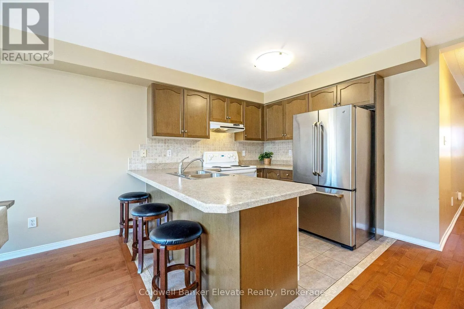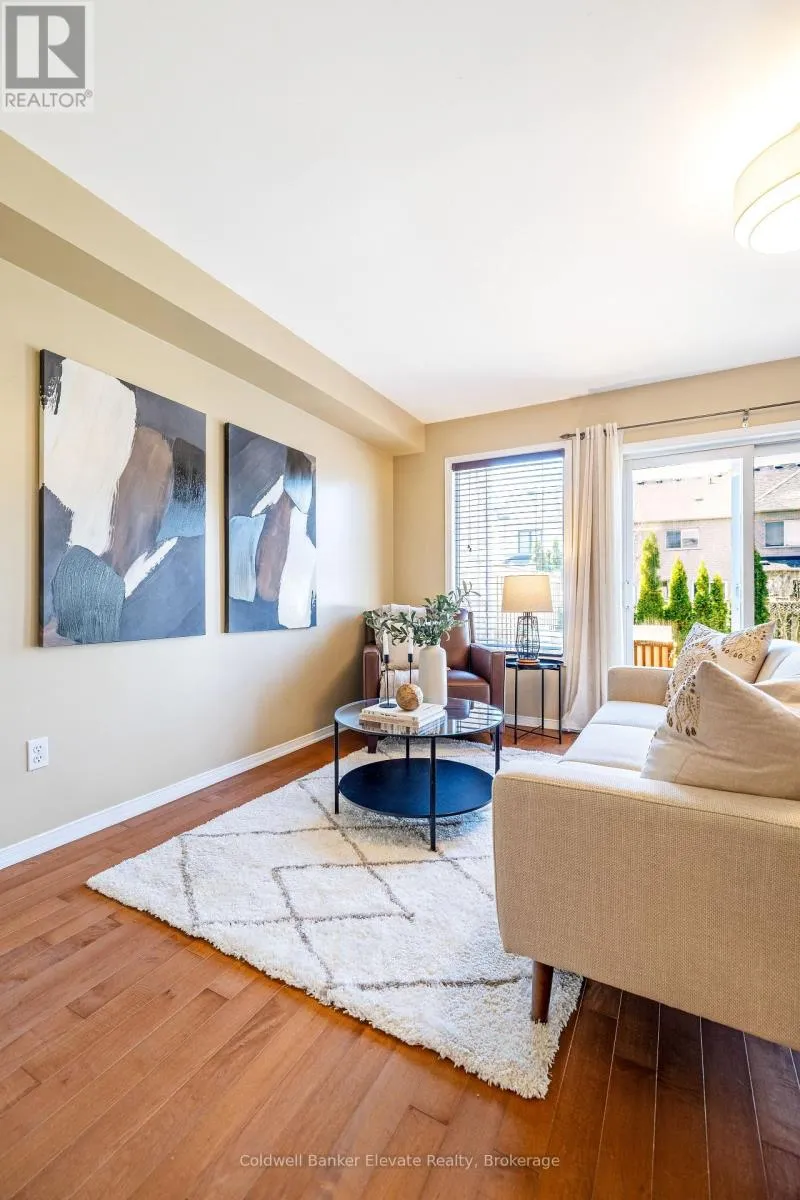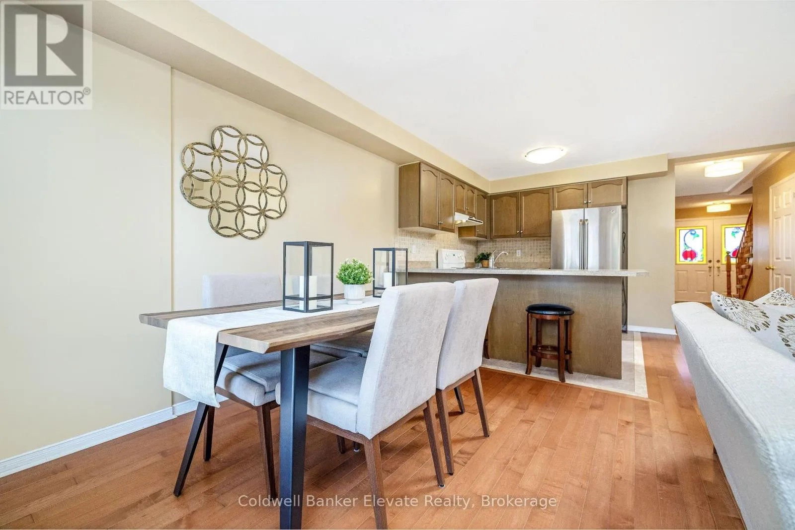 Cross Streets: Maple/Harding. ** Directions: Mountainview Rd N to Maple Ave or Dominion Gardens Dr to Harding Street. Welcome to this beautifully maintained freehold townhouse offering comfort, functionality, and thoughtful updates throughout. The landscaped front yard, stone walkway, and covered front porch create a warm and inviting first impression, complete with a private driveway with parking for two and an attached garage with overhead and hanging storage. Step inside to a bright and welcoming main level featuring solid 3/4 inch hardwood flooring through the hallway, living room, and breakfast area. The open concept layout is ideal for both everyday living and entertaining, with large windows and a double sliding glass door walkout that fills the space with natural light and provides seamless access to the backyard. The kitchen is both functional and inviting, offering warm brown cabinetry with curved panel detailing, a tile backsplash with multiple outlets, stainless steel appliances, and a breakfast bar with comfortable seating. Upstairs, the spacious primary bedroom offers a peaceful retreat with two windows overlooking the backyard, a chandelier, and two double closets for ample storage. The semi-ensuite 3 piece bathroom features a tub and shower combination, built-in vanity, and convenient access from both the bedroom and hallway. A second bedroom with front yard views, broadloom flooring, and a double closet completes this level. The unfinished basement presents excellent potential, with framing and electrical already completed, offering a great opportunity to create additional living space, a recreation area, or a home office. The private backyard is a true highlight, featuring a brand new spruce deck (2025), new fencing (2025), and beautifully landscaped gardens filled with mature perennials including hydrangeas, lilies, and magnolias, creating a peaceful outdoor setting to enjoy. A wonderful opportunity to own a move-in ready home in a family friendly neighbourhood with space to grow and make it your own. (id:27476)