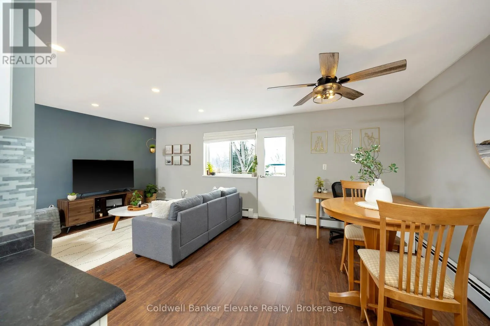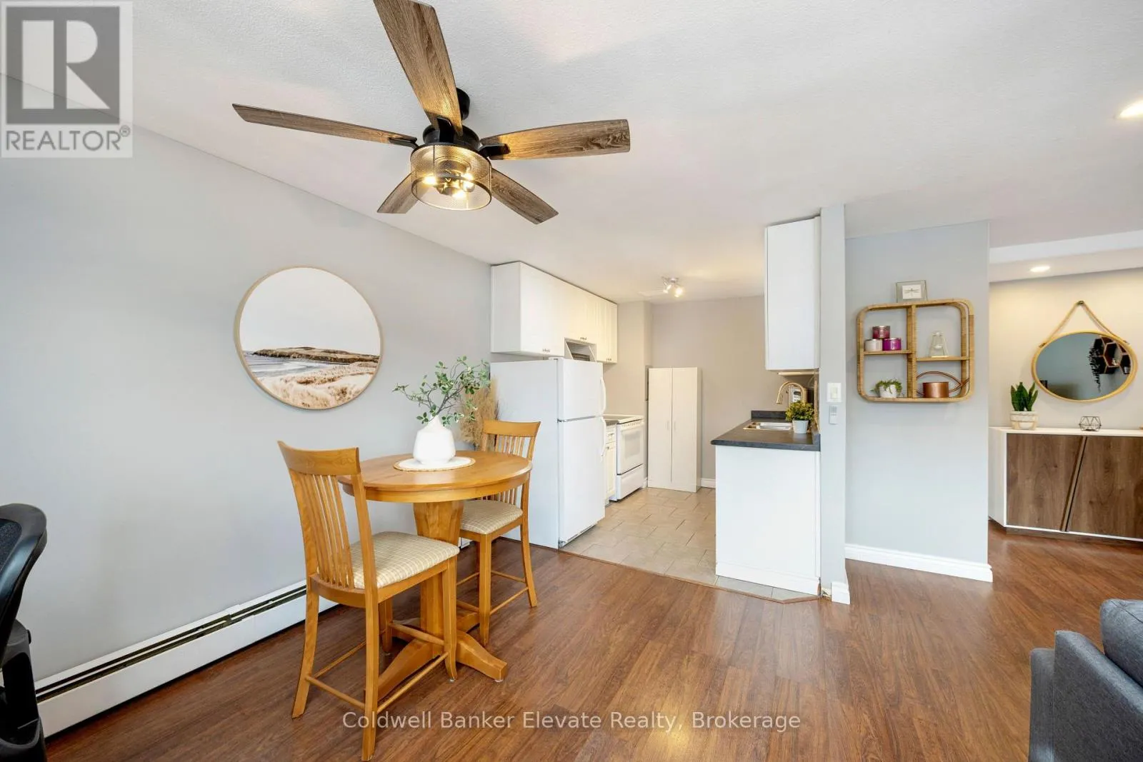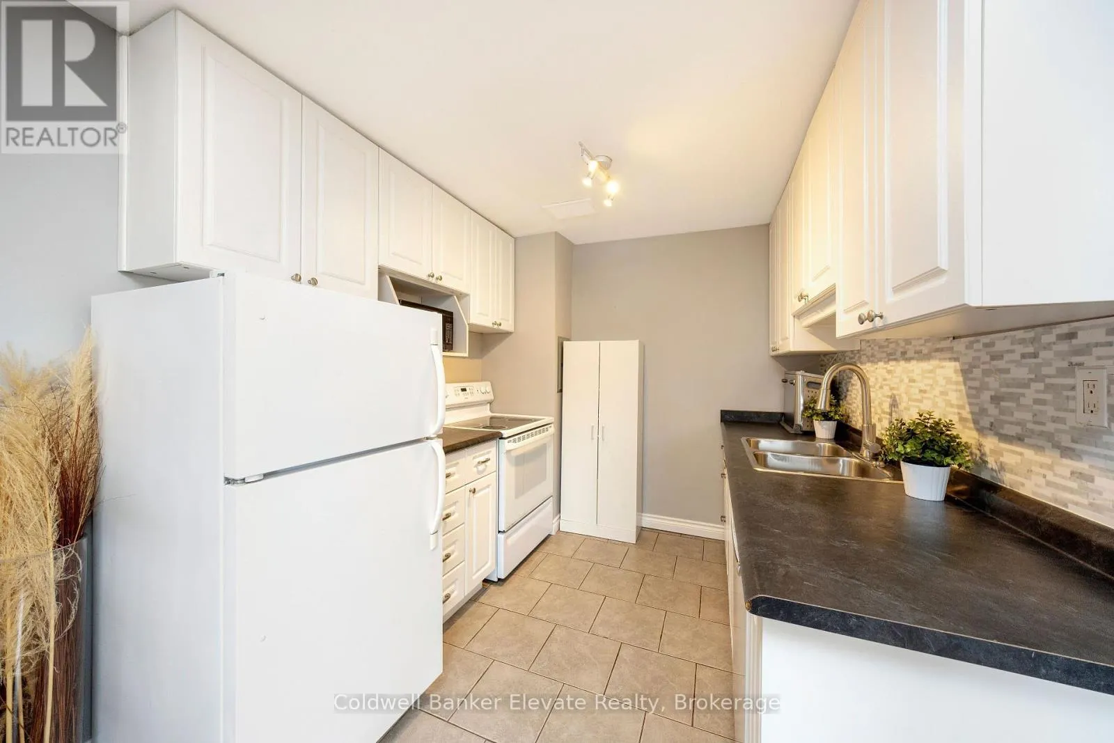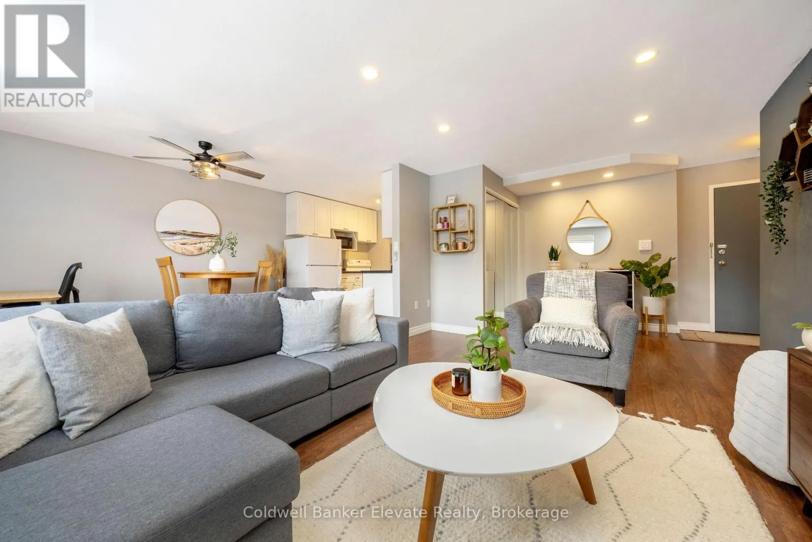 Mill & Main Street Cute as a button and completely move-in ready, this 1 bedroom, 1 bathroom condo is ideally located in one of the best spots in town, just steps to downtown Georgetown, shops, and the local Farmers' Market. The bright and functional layout begins with a welcoming front foyer featuring ceramic tile flooring, a flush mount light, and a double mirrored closet offering ample storage. The living room showcases laminate flooring, recessed pot lights, a sunny south facing window, and a walk out to the balcony with open south facing views. The open concept dining area continues the laminate flooring, features a ceiling fan with integrated light, and shares access to the balcony, creating a seamless indoor outdoor living experience. The kitchen offers ceramic flooring, a mosaic tile backsplash, laminate countertops, a double stainless-steel sink, track lighting, and an open concept design ideal for everyday living. The spacious primary bedroom includes laminate flooring and a south facing window that fills the room with natural light. The renovated four-piece bathroom features a modern vanity with sink, updated vanity lighting, and a tub and shower combination with sliding glass doors. Ensuite laundry adds everyday convenience with a Bosch front load washer and dryer included. Additional highlights include one exclusive parking space, visitor parking, bike storage and a private storage locker located in the building. Maintenance fees are all inclusive, covering hydro, heat, and water. Ideally located close to schools, parks, and minutes to GO, this is the perfect opportunity for first time home buyers. (id:27476)