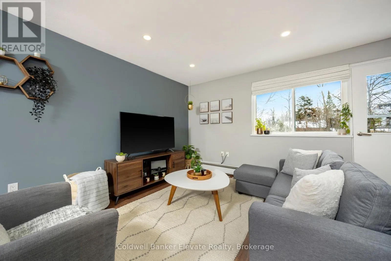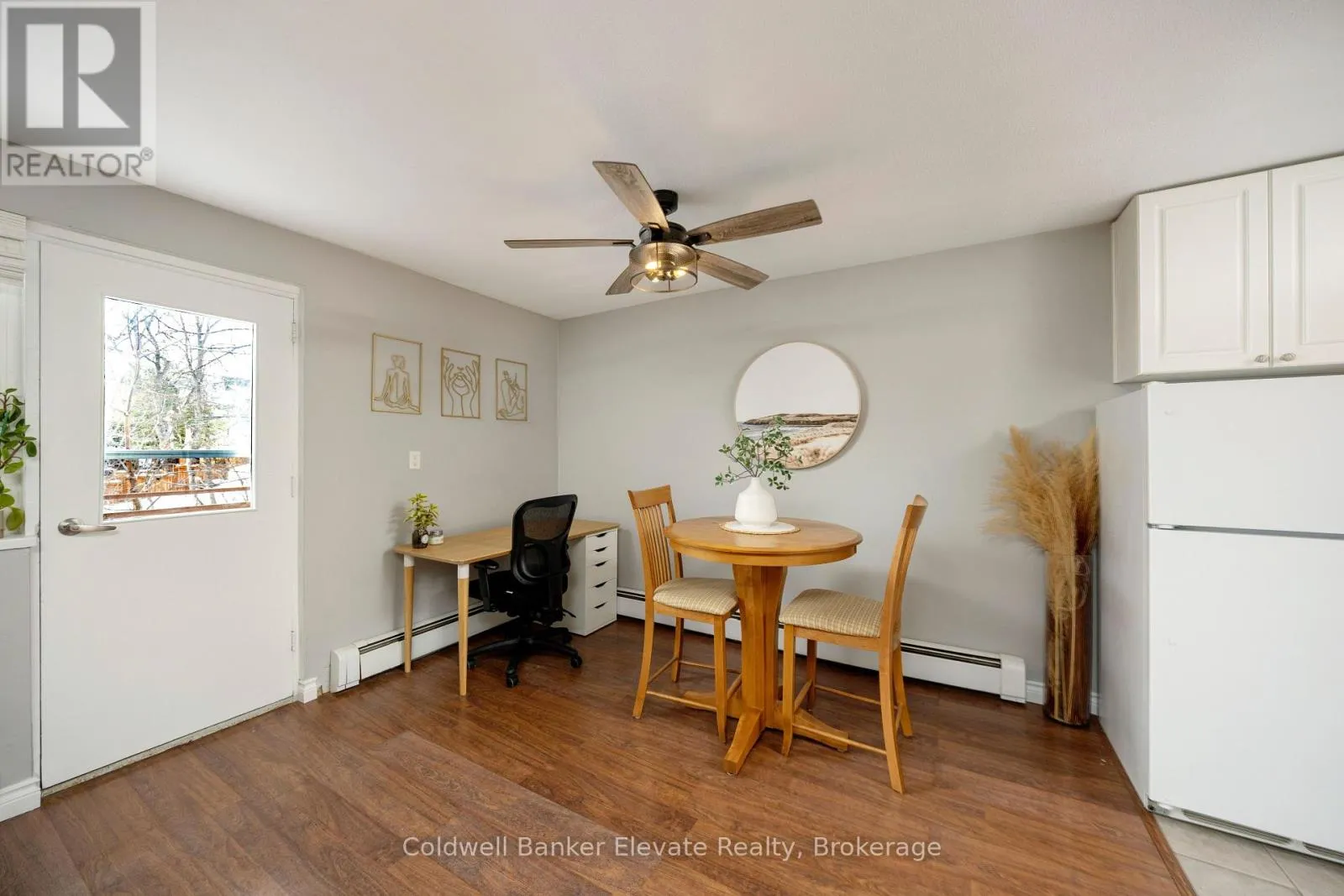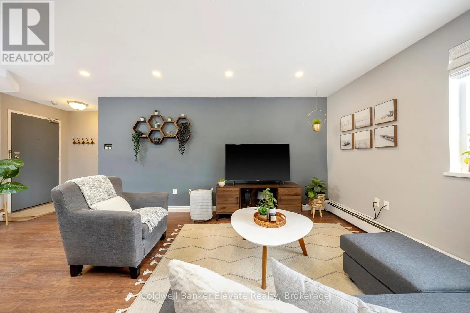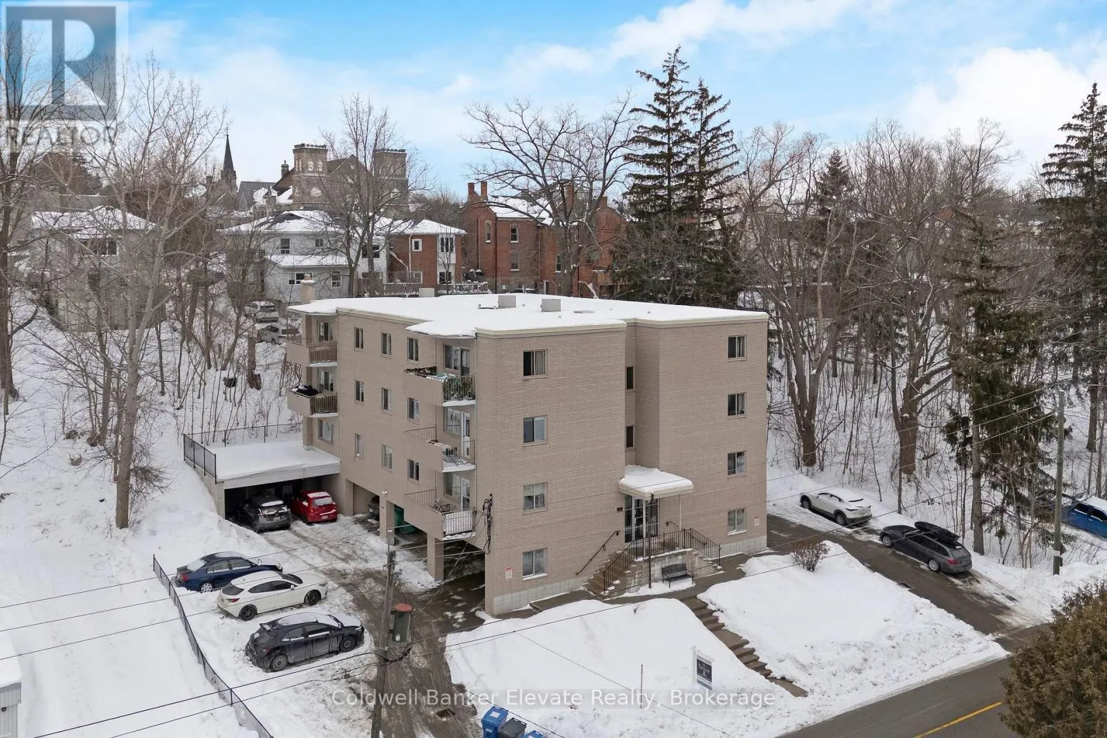 Mill & Main Street Cute as a button and completely move-in ready, this 1 bedroom, 1 bathroom condo is ideally located in one of the best spots in town, just steps to downtown Georgetown, shops, and the local Farmers' Market. The bright and functional layout begins with a welcoming front foyer featuring ceramic tile flooring, a flush mount light, and a double mirrored closet offering ample storage. The living room showcases laminate flooring, recessed pot lights, a sunny south facing window, and a walk out to the balcony with open south facing views. The open concept dining area continues the laminate flooring, features a ceiling fan with integrated light, and shares access to the balcony, creating a seamless indoor outdoor living experience. The kitchen offers ceramic flooring, a mosaic tile backsplash, laminate countertops, a double stainless-steel sink, track lighting, and an open concept design ideal for everyday living. The spacious primary bedroom includes laminate flooring and a south facing window that fills the room with natural light. The renovated four-piece bathroom features a modern vanity with sink, updated vanity lighting, and a tub and shower combination with sliding glass doors. Ensuite laundry adds everyday convenience with a Bosch front load washer and dryer included. Additional highlights include one exclusive parking space, visitor parking, bike storage and a private storage locker located in the building. Maintenance fees are all inclusive, covering hydro, heat, and water. Ideally located close to schools, parks, and minutes to GO, this is the perfect opportunity for first time home buyers. (id:27476)