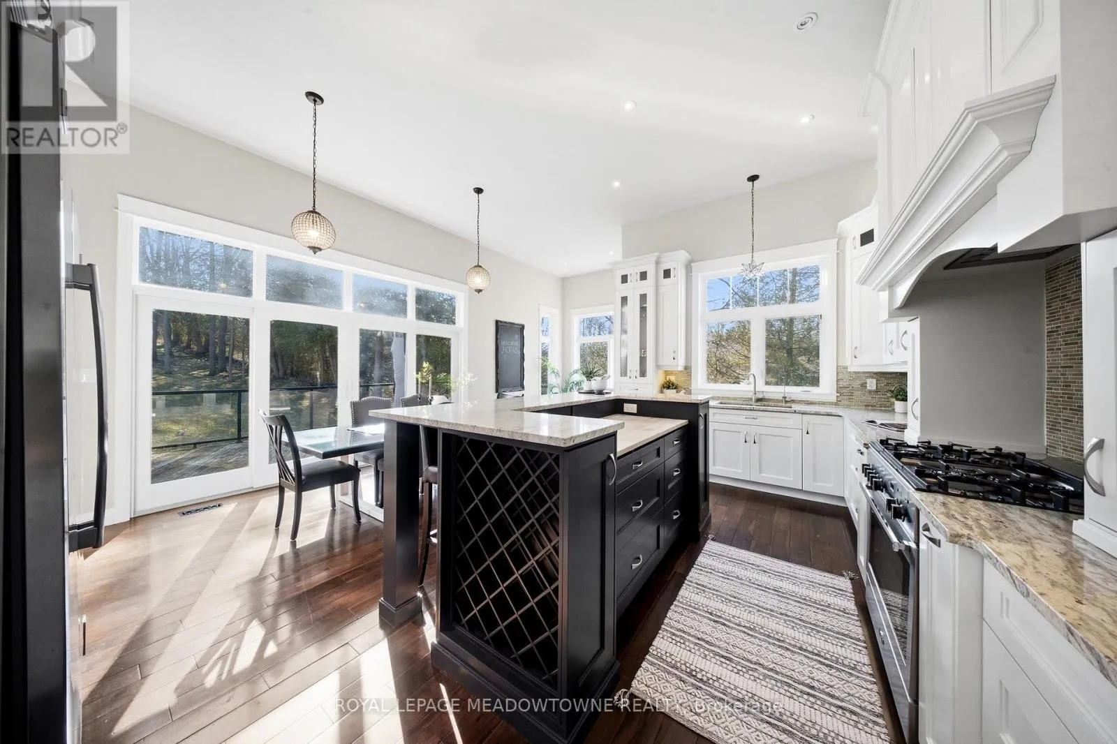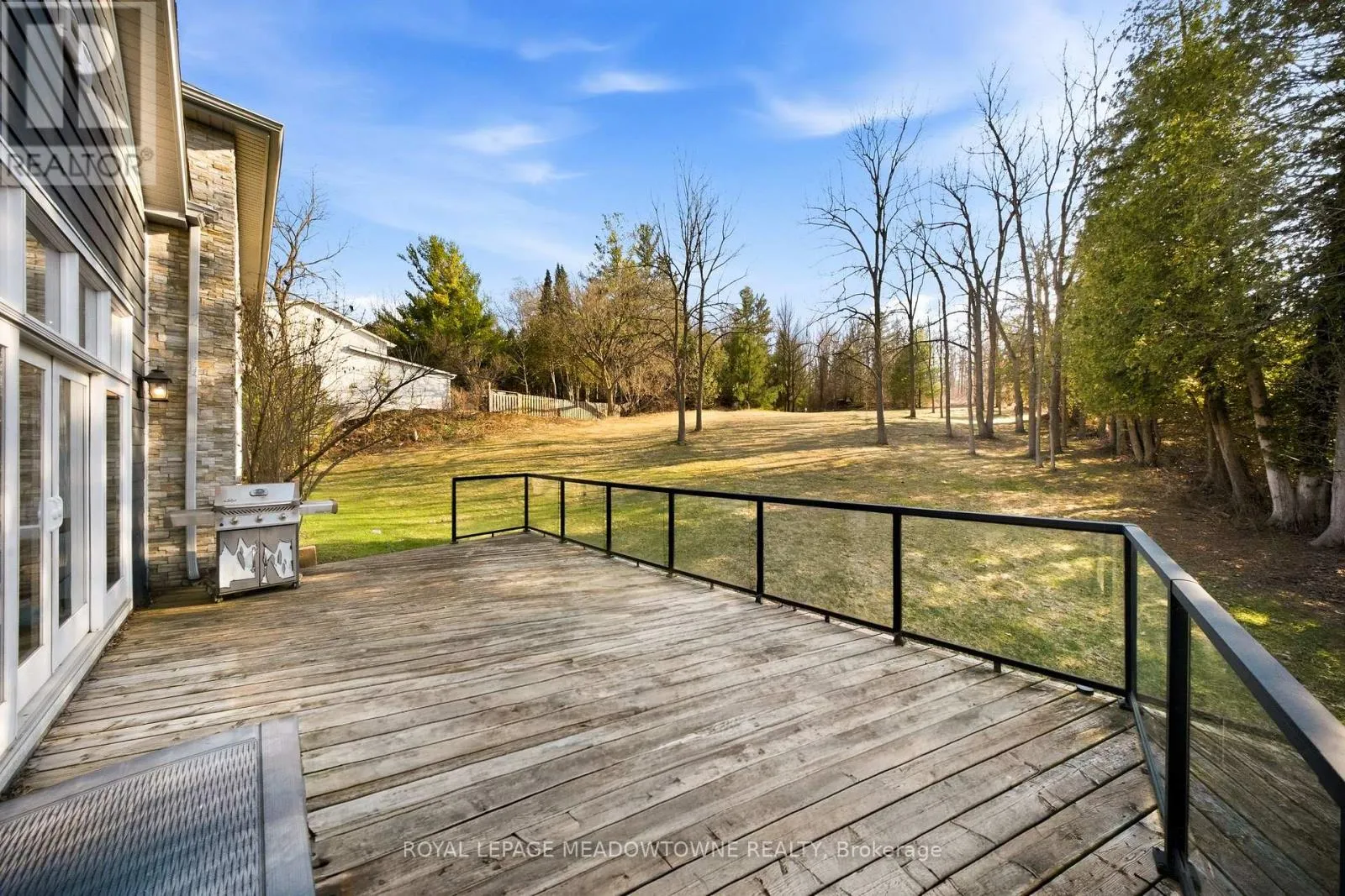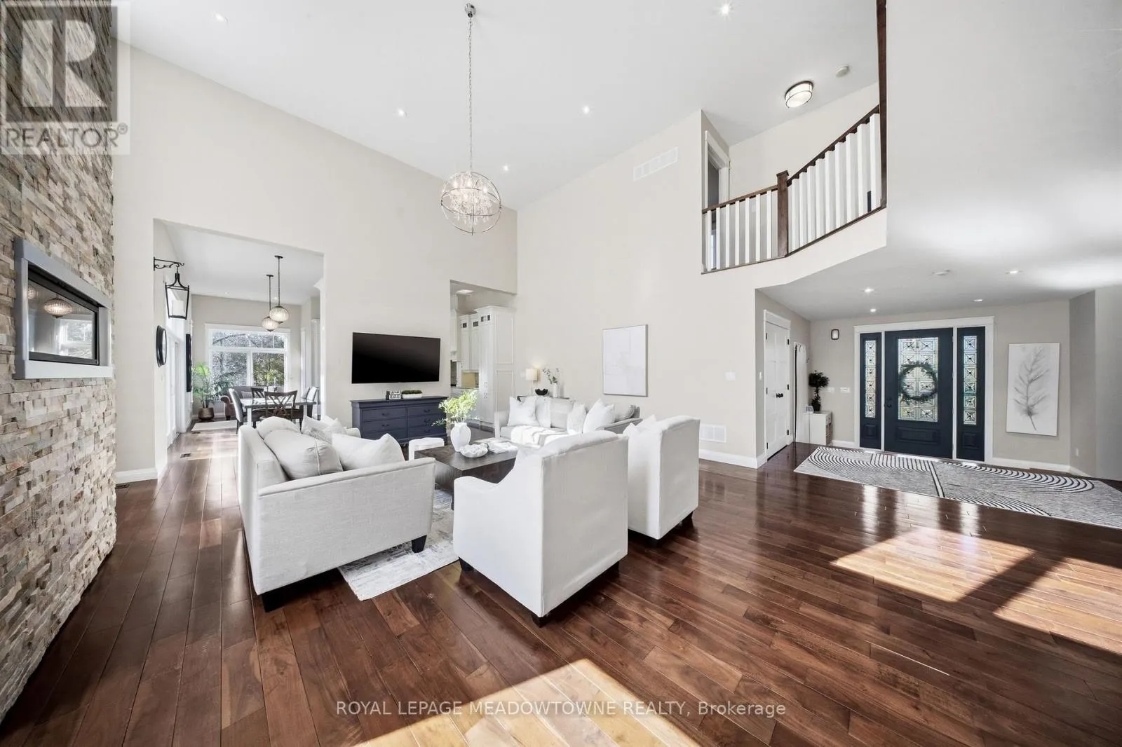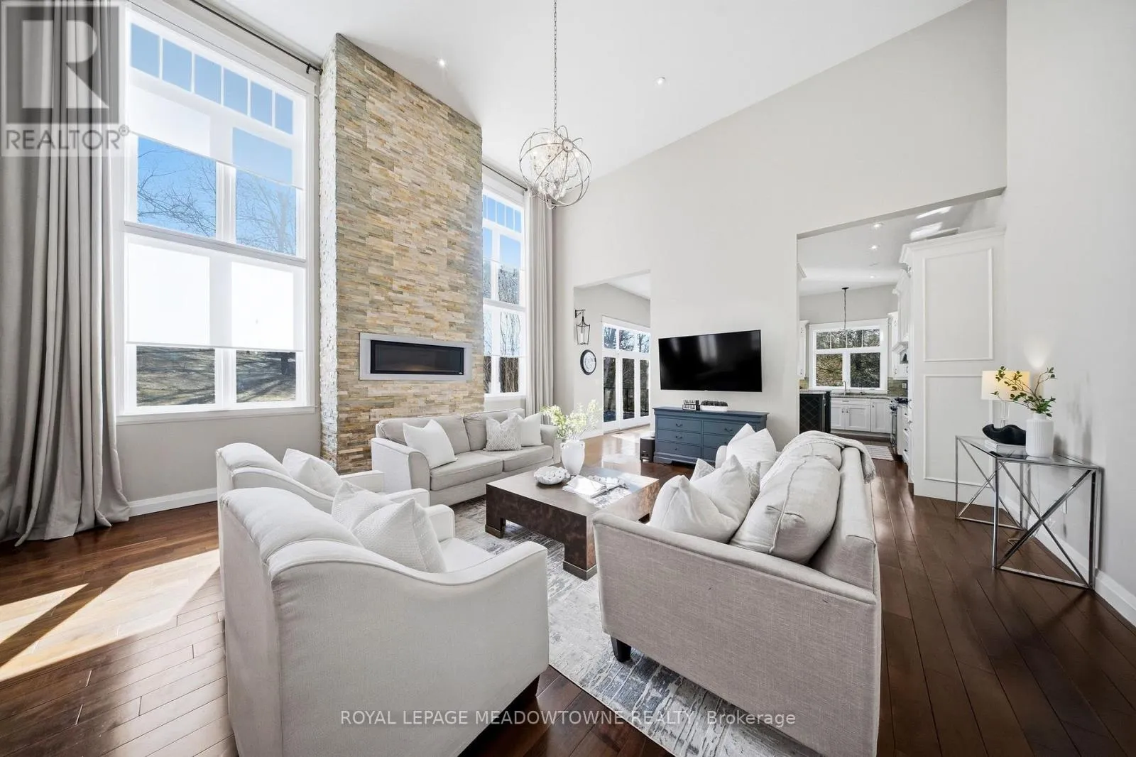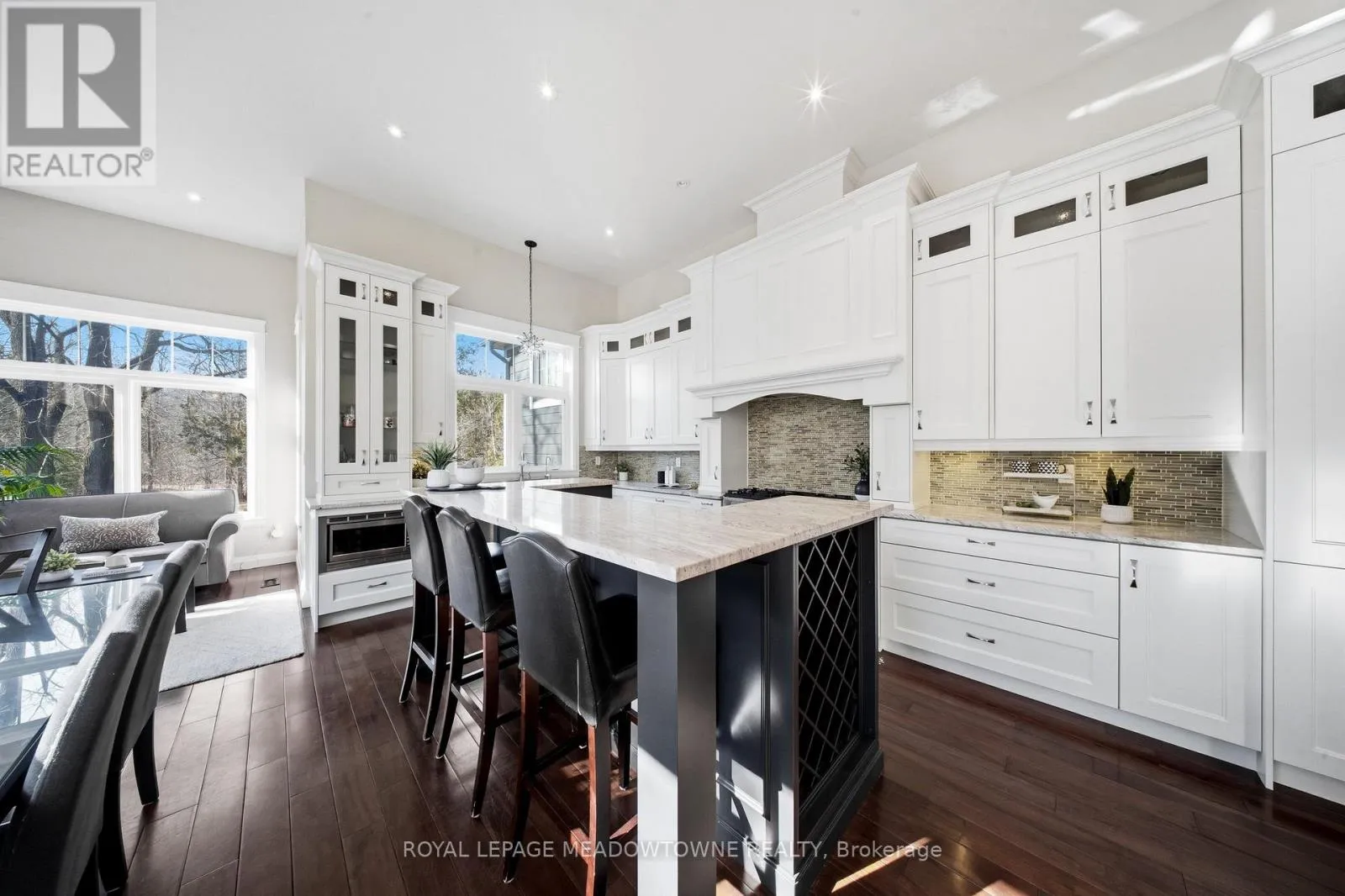 Main Street & Arborglen Drive Custom-built detached home set on a picturesque 1-acre lot backing onto conservation, offering exceptional privacy and natural views. A circular driveway provides ample parking and leads to a built-in two-car garage plus covered parking area. Welcoming covered front porch opens to a sunken foyer.The open-concept great room impresses with soaring 17-ft ceilings, a striking stone fireplace, and expansive windows that flood the space with natural light. The gourmet kitchen features high-end stainless steel appliances, a centre island with built-in wine rack and breakfast bar, and is combined with the dining area with walkout to a large raised deck-ideal for entertaining.Main floor highlights include a private office, perfect for working from home, and a spacious primary retreat with his and hers closets, a 5-piece ensuite, and serene ravine views. Above the garage, a separate living space offers a family room with cathedral ceiling, bedroom, and ensuite-perfect for guests or extended family.The second level is accessed by an open staircase overlooking the great room and features three additional bedrooms, all with ensuite access. A fully finished walk-out lower level includes an in-law suite with its own bedroom, kitchen, and bathroom, providing excellent multi-generational living potential.Ideally located in the heart of Georgetown, close to the hospital, fairgrounds, The Club at North Halton, and an abundance of scenic paths and trails. (id:27476)