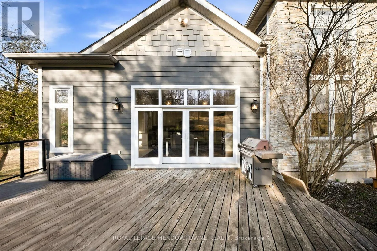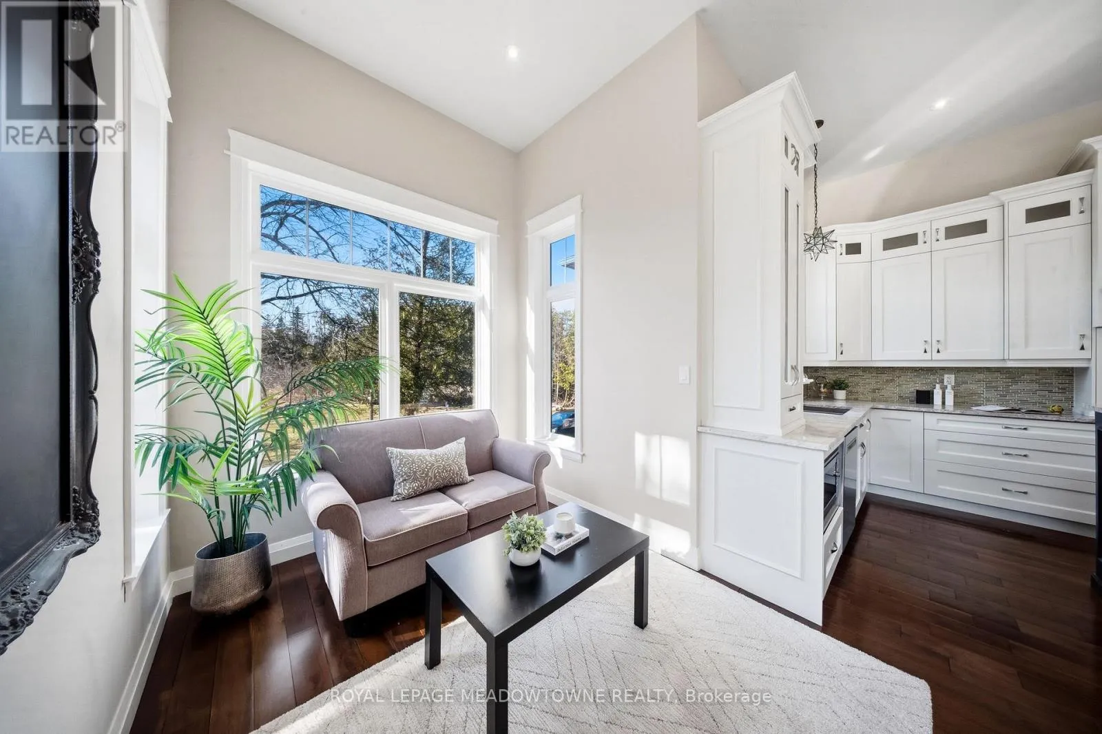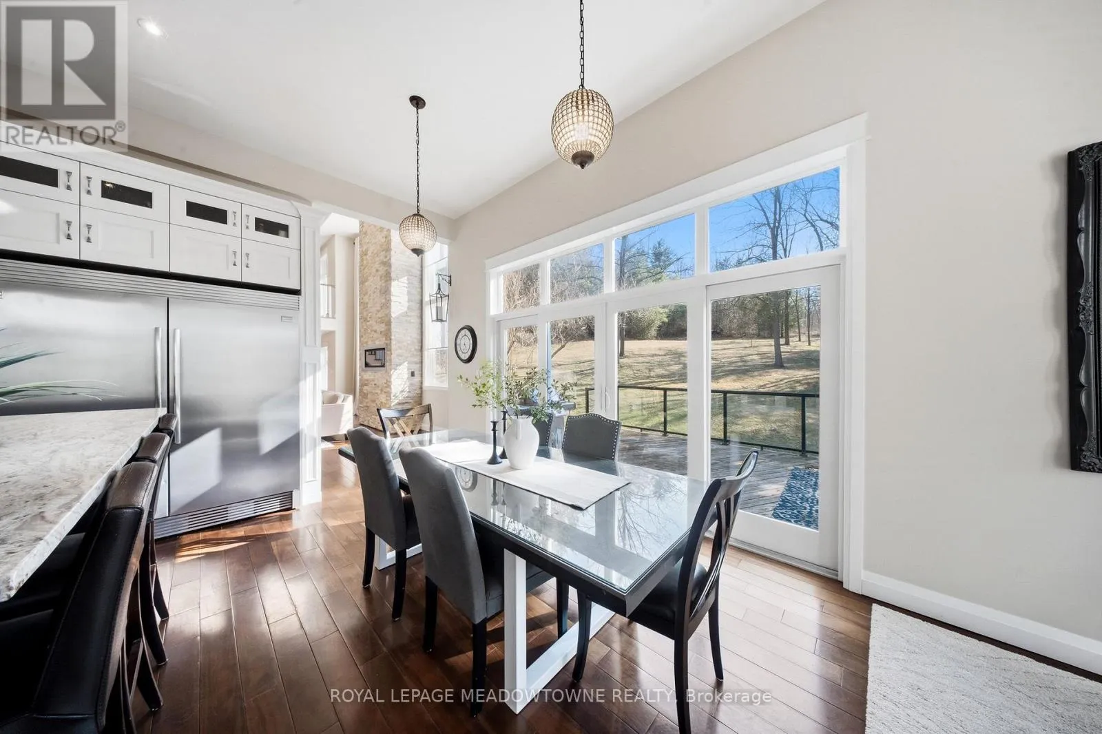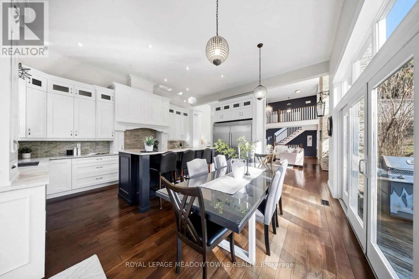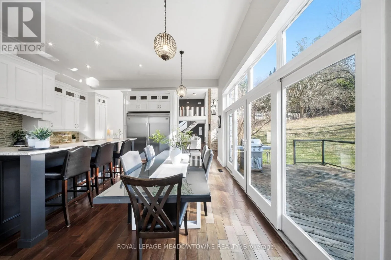 Main Street & Arborglen Drive Custom-built detached home set on a picturesque 1-acre lot backing onto conservation, offering exceptional privacy and natural views. A circular driveway provides ample parking and leads to a built-in two-car garage plus covered parking area. Welcoming covered front porch opens to a sunken foyer.The open-concept great room impresses with soaring 17-ft ceilings, a striking stone fireplace, and expansive windows that flood the space with natural light. The gourmet kitchen features high-end stainless steel appliances, a centre island with built-in wine rack and breakfast bar, and is combined with the dining area with walkout to a large raised deck-ideal for entertaining.Main floor highlights include a private office, perfect for working from home, and a spacious primary retreat with his and hers closets, a 5-piece ensuite, and serene ravine views. Above the garage, a separate living space offers a family room with cathedral ceiling, bedroom, and ensuite-perfect for guests or extended family.The second level is accessed by an open staircase overlooking the great room and features three additional bedrooms, all with ensuite access. A fully finished walk-out lower level includes an in-law suite with its own bedroom, kitchen, and bathroom, providing excellent multi-generational living potential.Ideally located in the heart of Georgetown, close to the hospital, fairgrounds, The Club at North Halton, and an abundance of scenic paths and trails. (id:27476)