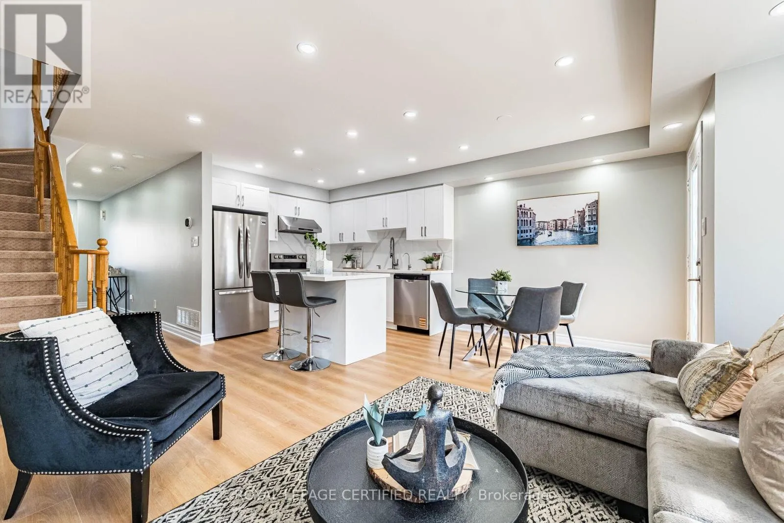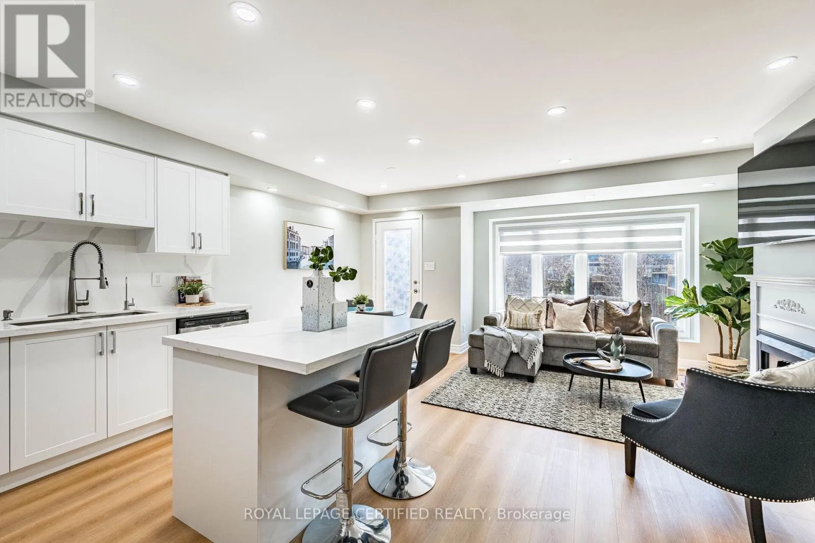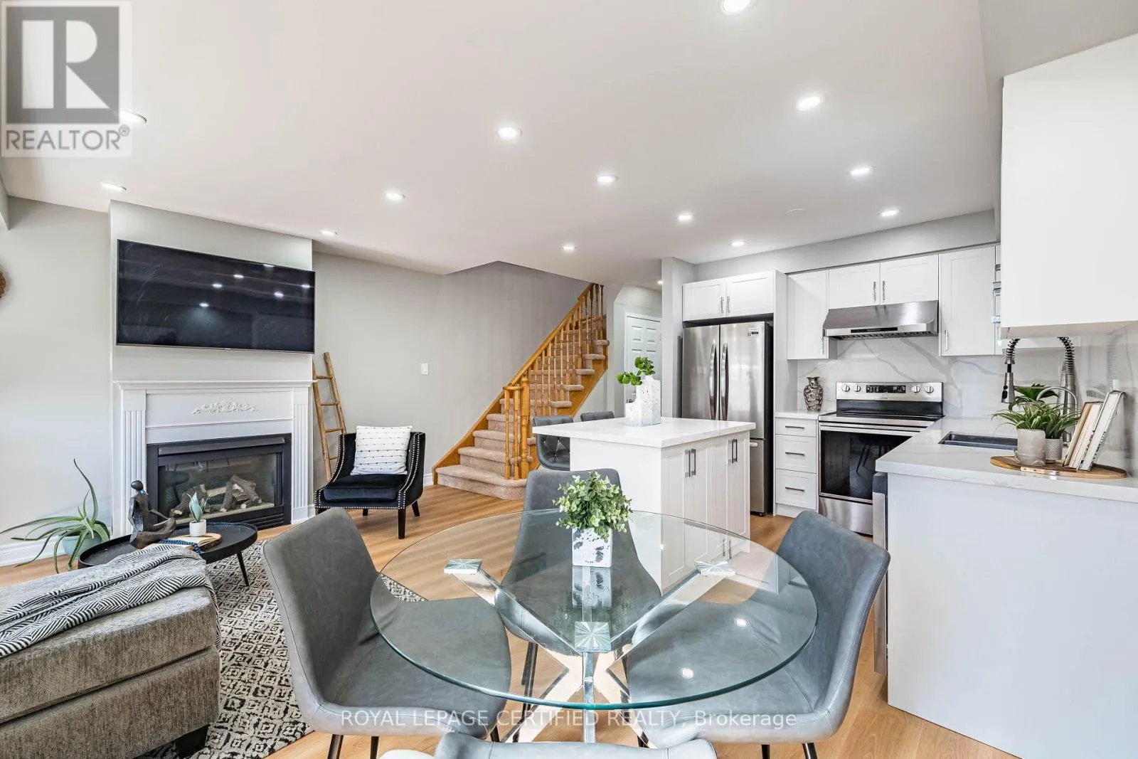Cross Streets: Maple Avenue & Mountainview Road. ** Directions: Maple Ave to Harding St. Welcome to this beautifully maintained freehold townhome (no condo or POTL fees) in Georgetown's sought-after Dominion Gardens-offering stylish, move-in-ready living with extensive recent upgrades throughout. The open-concept main floor features new flooring (2026), a cozy natural gas fireplace, and a fully renovated kitchen(2026) with modern cabinetry, quartz countertops & backsplash, and new stainless steel appliances. Pot lights on all three levels provide a bright, modern ambiance throughout the home. Upstairs, the spacious primary bedroom offers semi-ensuite access to an updated main bathroom, complemented by two additional well-sized bedrooms, including one with a walkout to a front balcony. Custom zebra blinds add a sleek, contemporary finish. The finished basement adds valuable living space-ideal for a family room, home office, or gym + additional storage space. Enjoy a fully fences backyard with mature landscaping, plus a private driveway for two cars plus a single-car garage with no side walk. Extensive Upgrades Include: AC (2024), furnace (2025), renovated kitchen & appliances fridge (2026), dishwasher (2026), main floor flooring (2026), staircase carpet (2026), clothes washer (2026), water Softner & reverse osmosis system (2024) owned, and pot lights throughout all three levels. Located within walking distance to parks, splash pad, trails, shopping, restaurants, outlet mall, and GO Train. Close to excellent schools in a family-friendly neighbourhood-an exceptional opportunity to own a turnkey freehold home. Freehold Townhome - No Condo Fees. Fully Renovated Kitchen (2026)+ Cabinets+Quartz Countertop & Backsplash + Island. Pot Lights on All 3 Levels. New Flooring Main (2026) + Stair Carpet(2026). Finished Basement (Family Room/Office/Gym). AC(2024) & Furnace(2025). Water Softener + Reverse Osmosis(2024). Private Driveway(2 cars) + Garage. No sidewalk. Fully Fences Backyard with Mature Trees. Walking Distance to GO Train, Parks, Trails, Shopping & Schools. (id:27476)