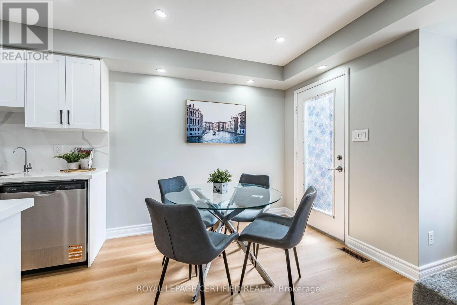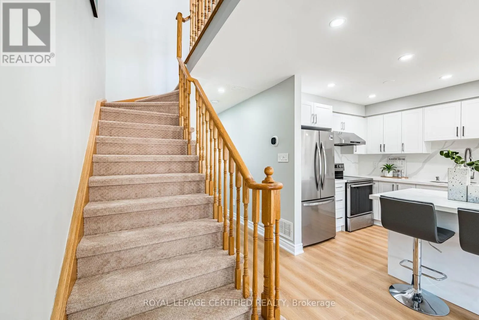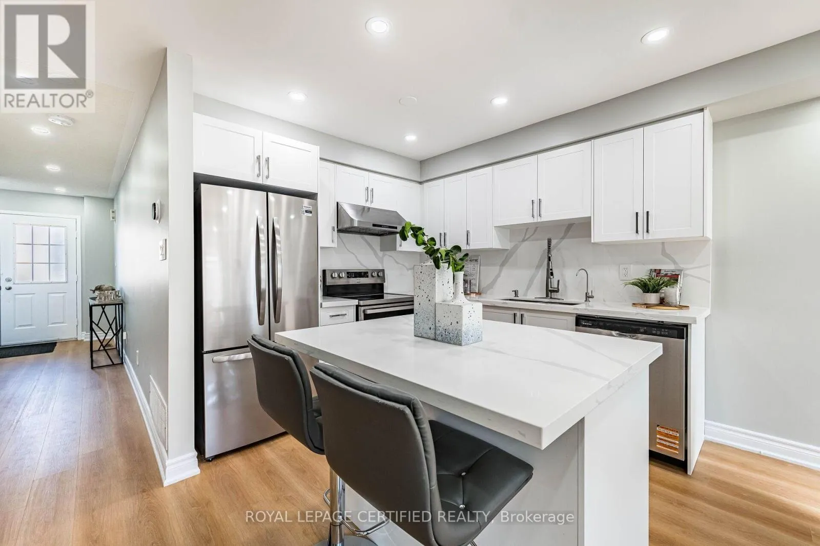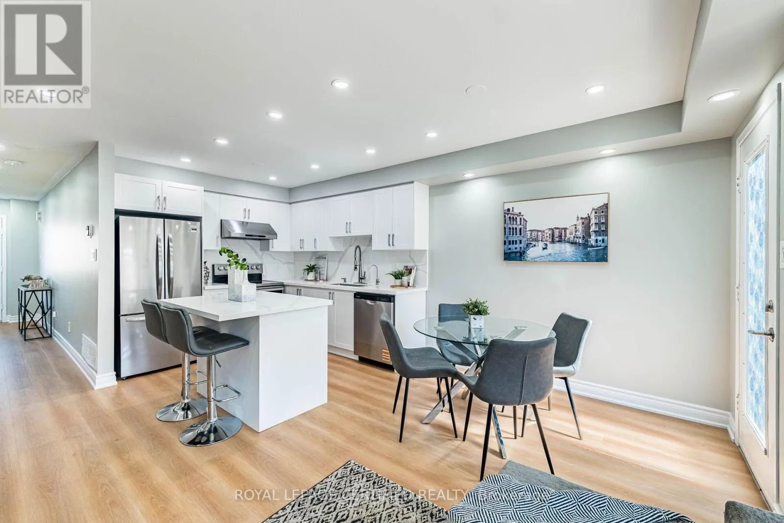 Cross Streets: Maple Avenue & Mountainview Road. ** Directions: Maple Ave to Harding St. Welcome to this beautifully maintained freehold townhome (no condo or POTL fees) in Georgetown's sought-after Dominion Gardens-offering stylish, move-in-ready living with extensive recent upgrades throughout. The open-concept main floor features new flooring (2026), a cozy natural gas fireplace, and a fully renovated kitchen(2026) with modern cabinetry, quartz countertops & backsplash, and new stainless steel appliances. Pot lights on all three levels provide a bright, modern ambiance throughout the home. Upstairs, the spacious primary bedroom offers semi-ensuite access to an updated main bathroom, complemented by two additional well-sized bedrooms, including one with a walkout to a front balcony. Custom zebra blinds add a sleek, contemporary finish. The finished basement adds valuable living space-ideal for a family room, home office, or gym + additional storage space. Enjoy a fully fences backyard with mature landscaping, plus a private driveway for two cars plus a single-car garage with no side walk. Extensive Upgrades Include: AC (2024), furnace (2025), renovated kitchen & appliances fridge (2026), dishwasher (2026), main floor flooring (2026), staircase carpet (2026), clothes washer (2026), water Softner & reverse osmosis system (2024) owned, and pot lights throughout all three levels. Located within walking distance to parks, splash pad, trails, shopping, restaurants, outlet mall, and GO Train. Close to excellent schools in a family-friendly neighbourhood-an exceptional opportunity to own a turnkey freehold home. Freehold Townhome - No Condo Fees. Fully Renovated Kitchen (2026)+ Cabinets+Quartz Countertop & Backsplash + Island. Pot Lights on All 3 Levels. New Flooring Main (2026) + Stair Carpet(2026). Finished Basement (Family Room/Office/Gym). AC(2024) & Furnace(2025). Water Softener + Reverse Osmosis(2024). Private Driveway(2 cars) + Garage. No sidewalk. Fully Fences Backyard with Mature Trees. Walking Distance to GO Train, Parks, Trails, Shopping & Schools. (id:27476)