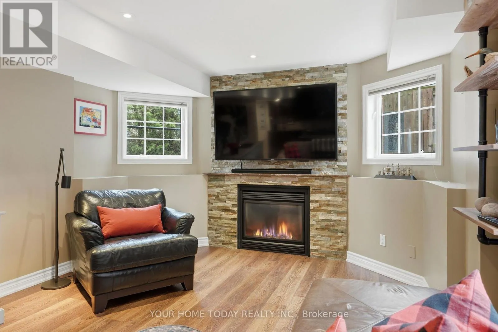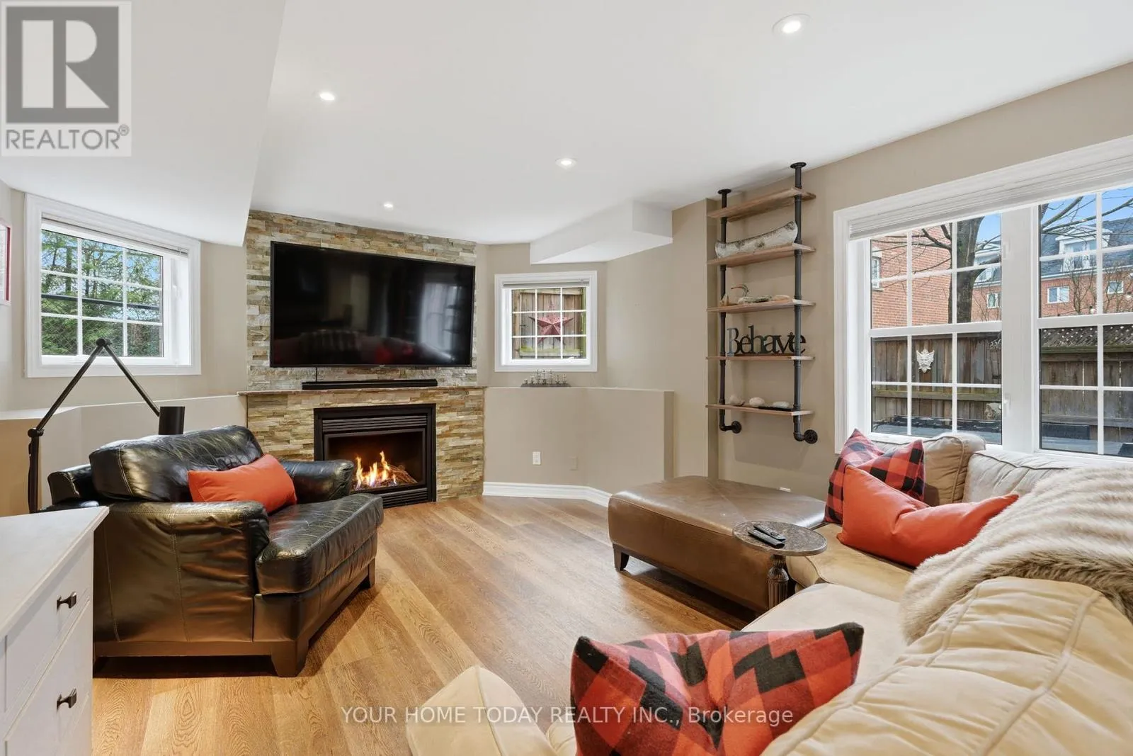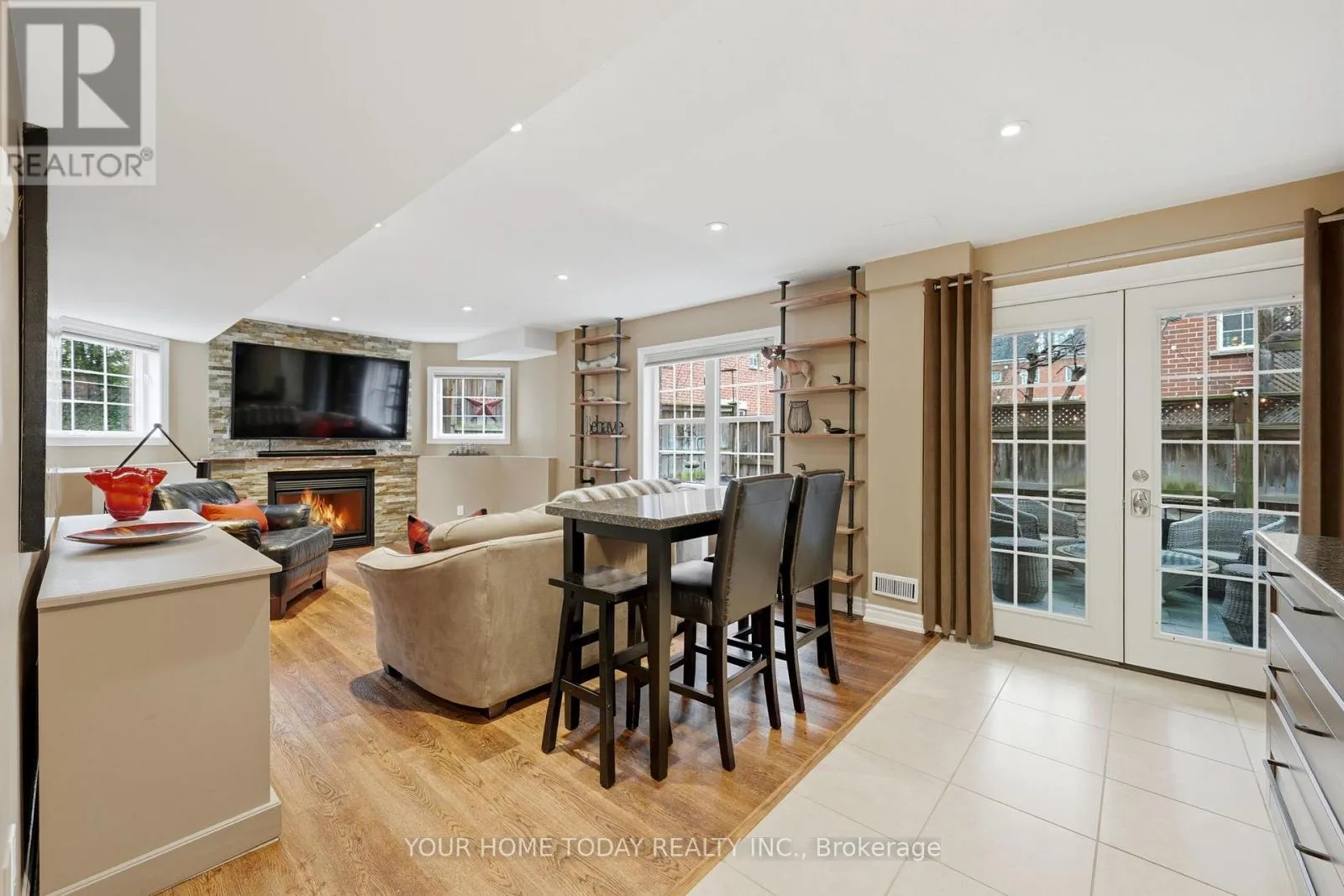 Cross Streets: Guelph and Main. ** Directions: Guelph, Main, Wesleyan. Exquisite End-Unit Townhome in Sought-After Downtown/Park District! Beautifully appointed & ideally situated, this elegant turnkey townhome offers an exceptional blend of comfort, style & convenience. Just steps to farmer market, shops, restaurants, library, theatre & close to parks, schools (highly rated Montessori school), golf & the hospital - everything you need is right at your doorstep. The main level offers an elegant & functional layout, featuring 9' ceilings, crown molding thru-out & a bright O/C design. The eat-in kitchen is a standout with dark custom cabinetry, granite counters, stone backsplash, pantry, S/S appliances & breakfast bar, along with a W/O to a private deck with a full coverage awning - perfect for morning coffee or summer BBQs. The adjoining bright family room is anchored by a striking gas f/p with marble surround, creating a warm & welcoming focal point. A private ground-level office/library with custom B/I oak shelving provides the perfect work-from-home or study space. Step down to a stylish powder room & garage access adds both character & functionality to the level. Upstairs, you'll find 3 spacious bedrooms, including a luxurious primary suite designed as a true retreat. The spa-inspired ensuite features heated floors, a freestanding designer tub, glass-enclosed shower & H/E fixtures for a touch of everyday indulgence. The bright W/O lower level extends the living space, offering a rec room with gas f/p, 2nd kitchen & direct access to a large private patio & lush gardens. This level also includes a 4th bedroom, 3-pc bath, laundry room with stove, fridge & ample storage. With a private exterior entrance, it's ideal for guests, extended family or multi-generational living. Additional highlights include an attached garage with house access, driveway parking for three cars & a large private patio area for outdoor enjoyment. Spacious, stylish, & beautifully finished, this exceptional home delivers comfort, charm & an unbeatable setting. (id:27476)