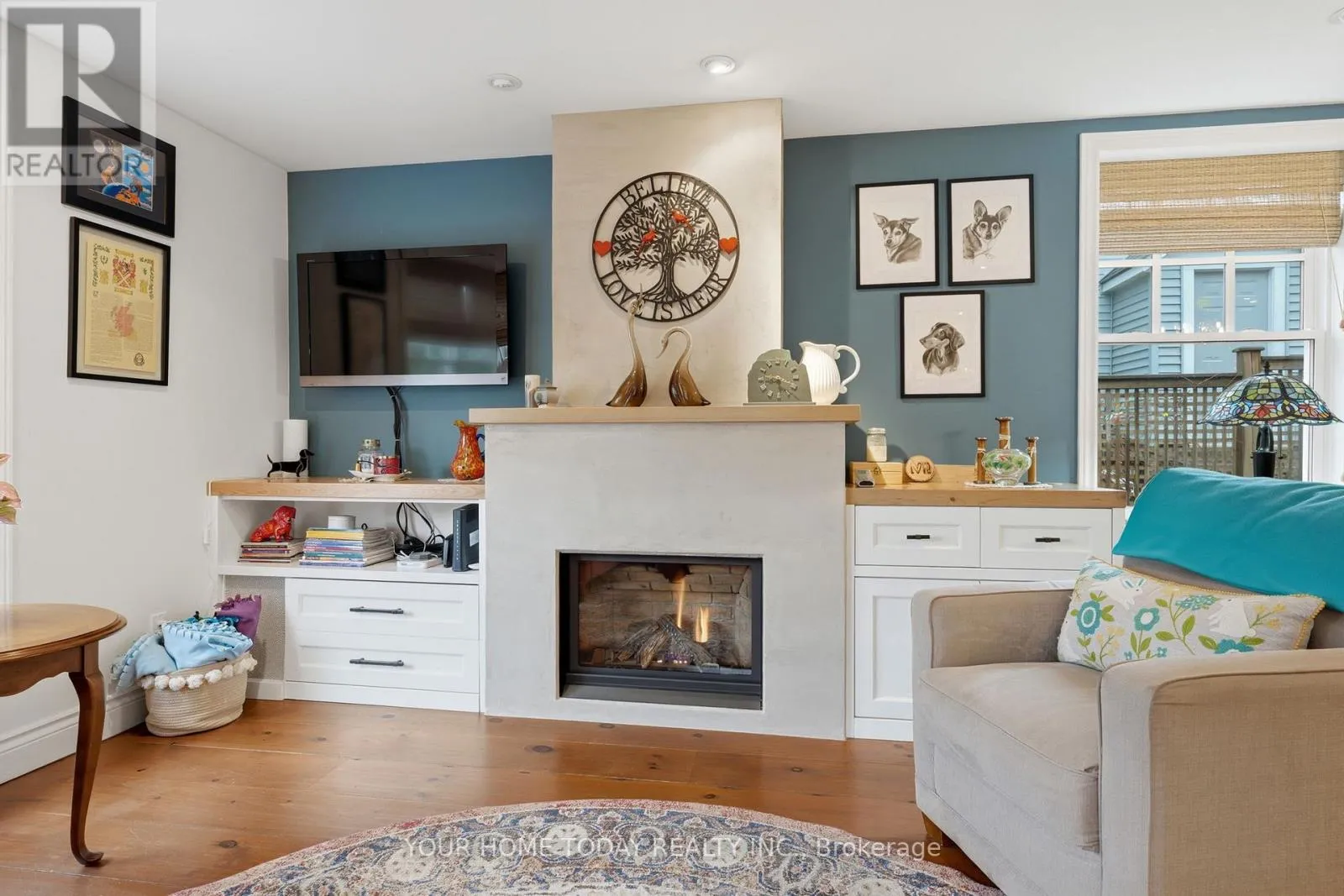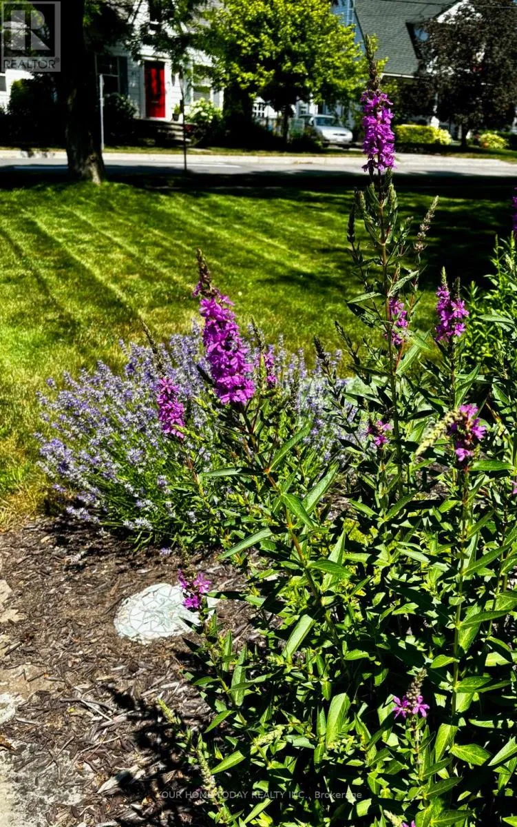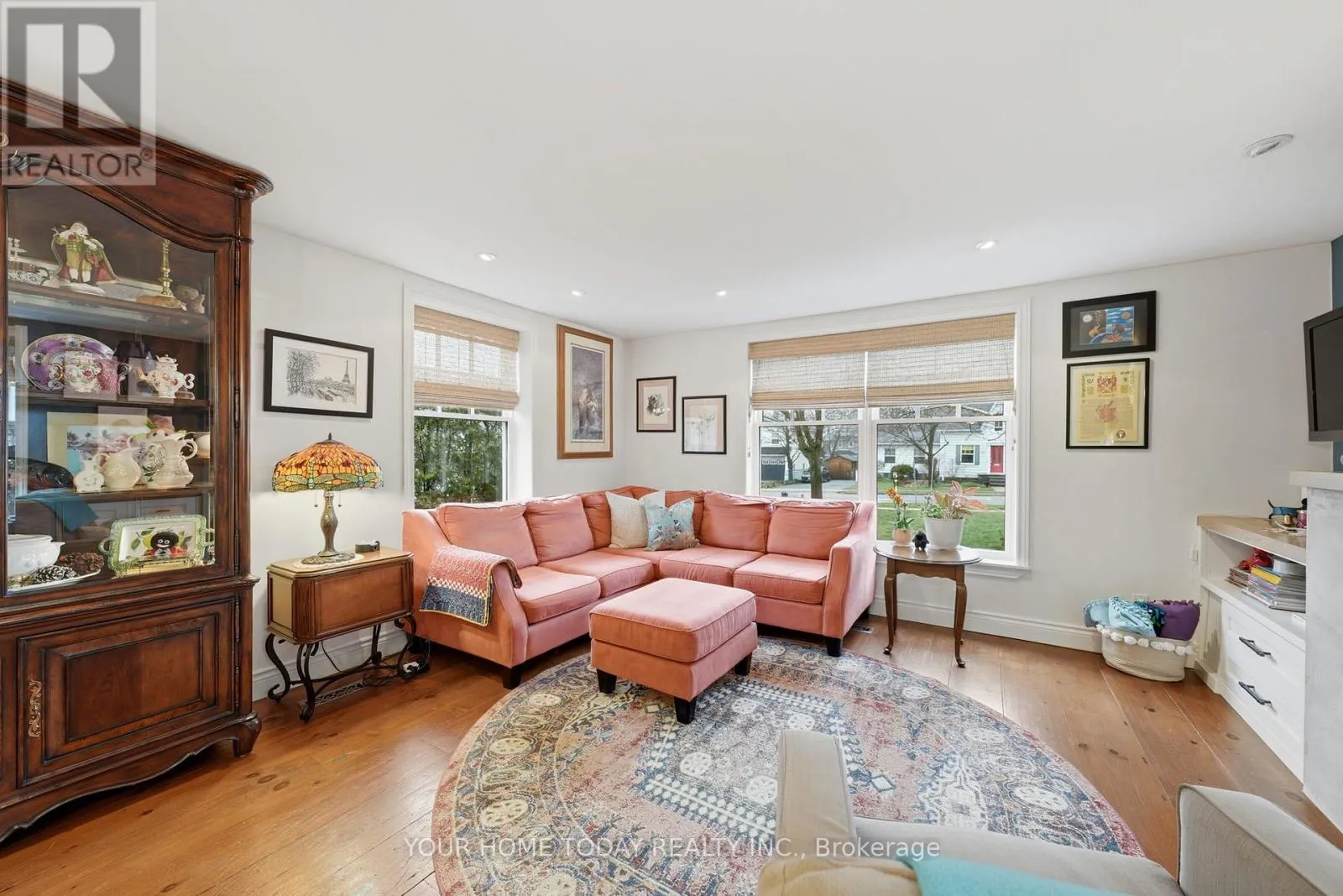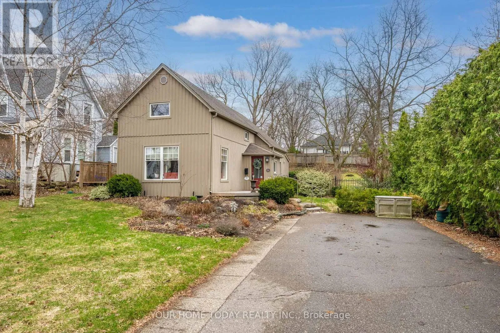 Highway 7 and Queen Century Charm, Huge Lot and Amazing Location - a Win, Win, Win! Set well back from the road on a huge mature lot of almost 1/3 of an acre, this charming and beautifully updated home offers privacy, character and an unbeatable location just steps to the GO. A large double driveway with parking for up to 6 cars adds rare convenience for the area. Enjoy easy access to downtown shops, seasonal farmers market, restaurants, library, fairgrounds, parks, schools and more. Inside, timeless charm meets thoughtful updates. The sun-filled living and dining room showcases original pine plank flooring and a striking gas fireplace with stone façade and mantle, beautifully anchored by built-in cabinets. The well-equipped kitchen features white shaker-style cabinetry and an island with seating, making it both functional and inviting. The main level also offers a bedroom with a distressed wood barn door and garden door walkout to the incredible private backyard - a true outdoor retreat with flagstone patio, fabulous perennial gardens and plenty of space to relax, entertain or let kids and pets roam. A combined laundry and 3-piece bathroom complete the level. Upstairs, you'll find two character-filled bedrooms, a lovely 3-piece bathroom, and a unique family room with vaulted beamed ceiling, adding warmth and personality you just don't get in a cookie-cutter house. The unfinished basement provides additional storage and utility space. (id:27476)