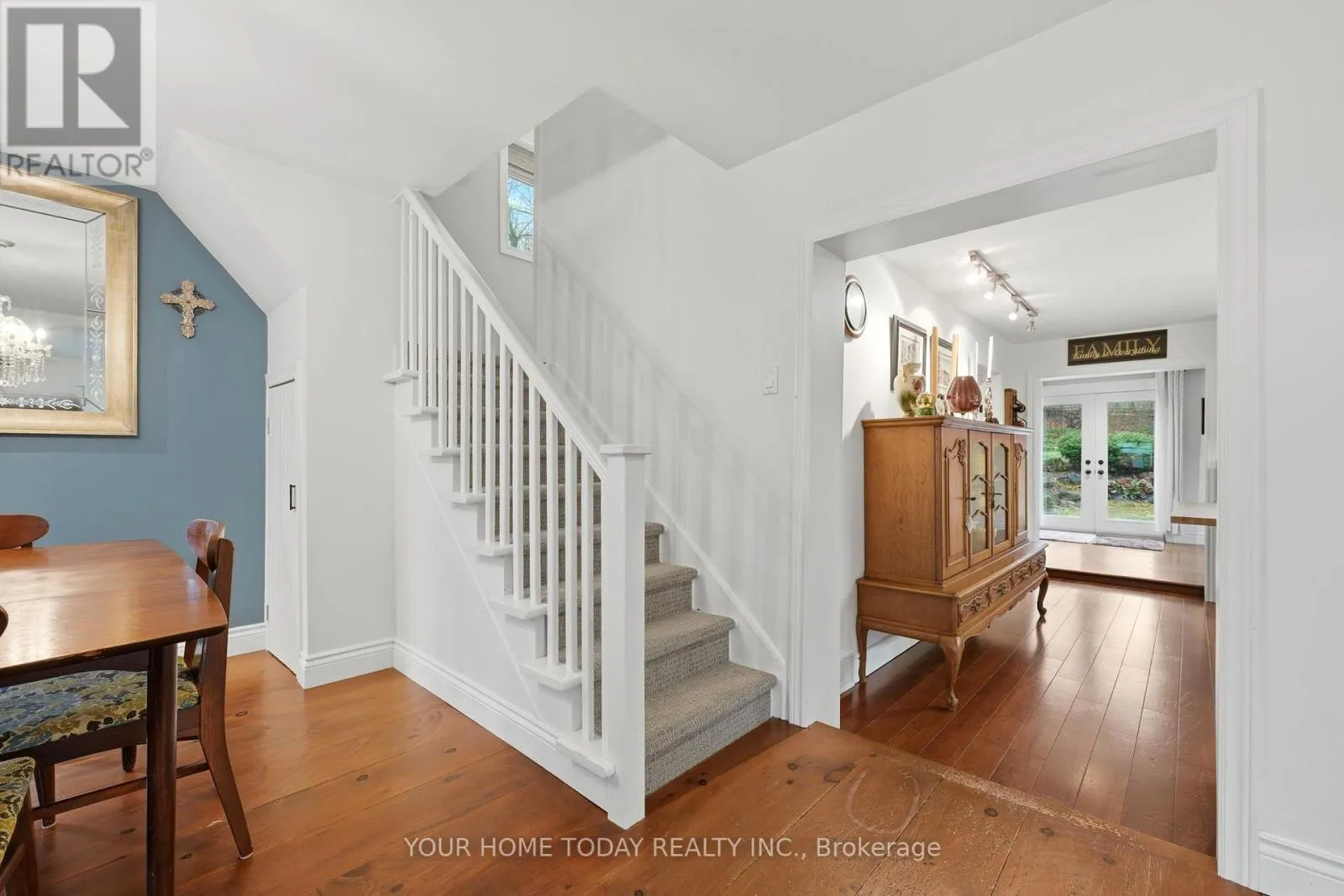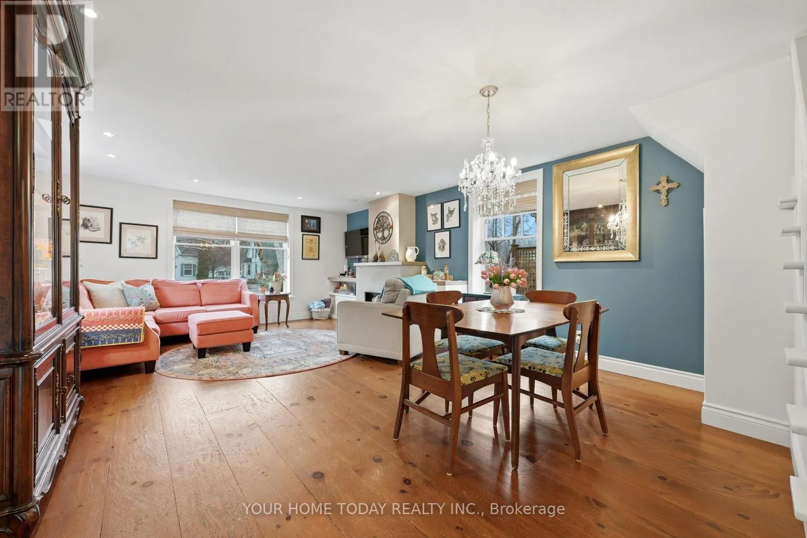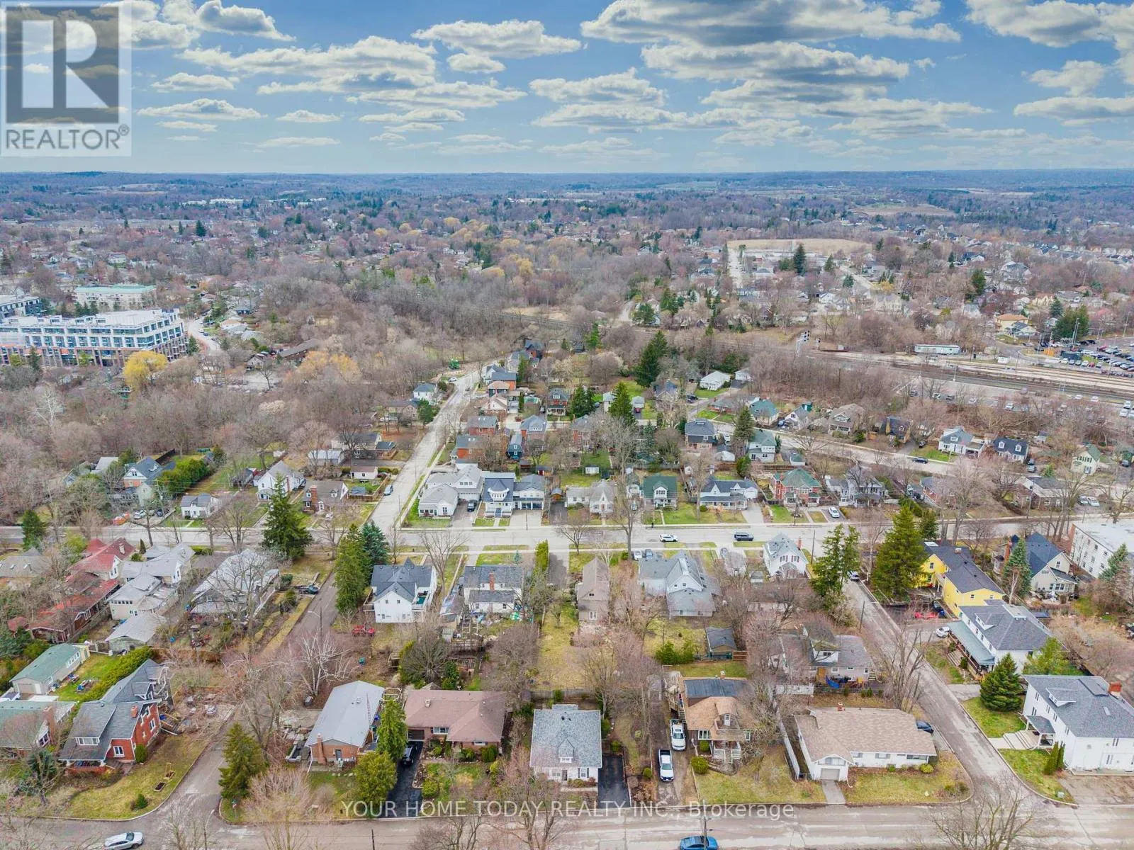 Highway 7 and Queen Century Charm, Huge Lot and Amazing Location - a Win, Win, Win! Set well back from the road on a huge mature lot of almost 1/3 of an acre, this charming and beautifully updated home offers privacy, character and an unbeatable location just steps to the GO. A large double driveway with parking for up to 6 cars adds rare convenience for the area. Enjoy easy access to downtown shops, seasonal farmers market, restaurants, library, fairgrounds, parks, schools and more. Inside, timeless charm meets thoughtful updates. The sun-filled living and dining room showcases original pine plank flooring and a striking gas fireplace with stone façade and mantle, beautifully anchored by built-in cabinets. The well-equipped kitchen features white shaker-style cabinetry and an island with seating, making it both functional and inviting. The main level also offers a bedroom with a distressed wood barn door and garden door walkout to the incredible private backyard - a true outdoor retreat with flagstone patio, fabulous perennial gardens and plenty of space to relax, entertain or let kids and pets roam. A combined laundry and 3-piece bathroom complete the level. Upstairs, you'll find two character-filled bedrooms, a lovely 3-piece bathroom, and a unique family room with vaulted beamed ceiling, adding warmth and personality you just don't get in a cookie-cutter house. The unfinished basement provides additional storage and utility space. (id:27476)