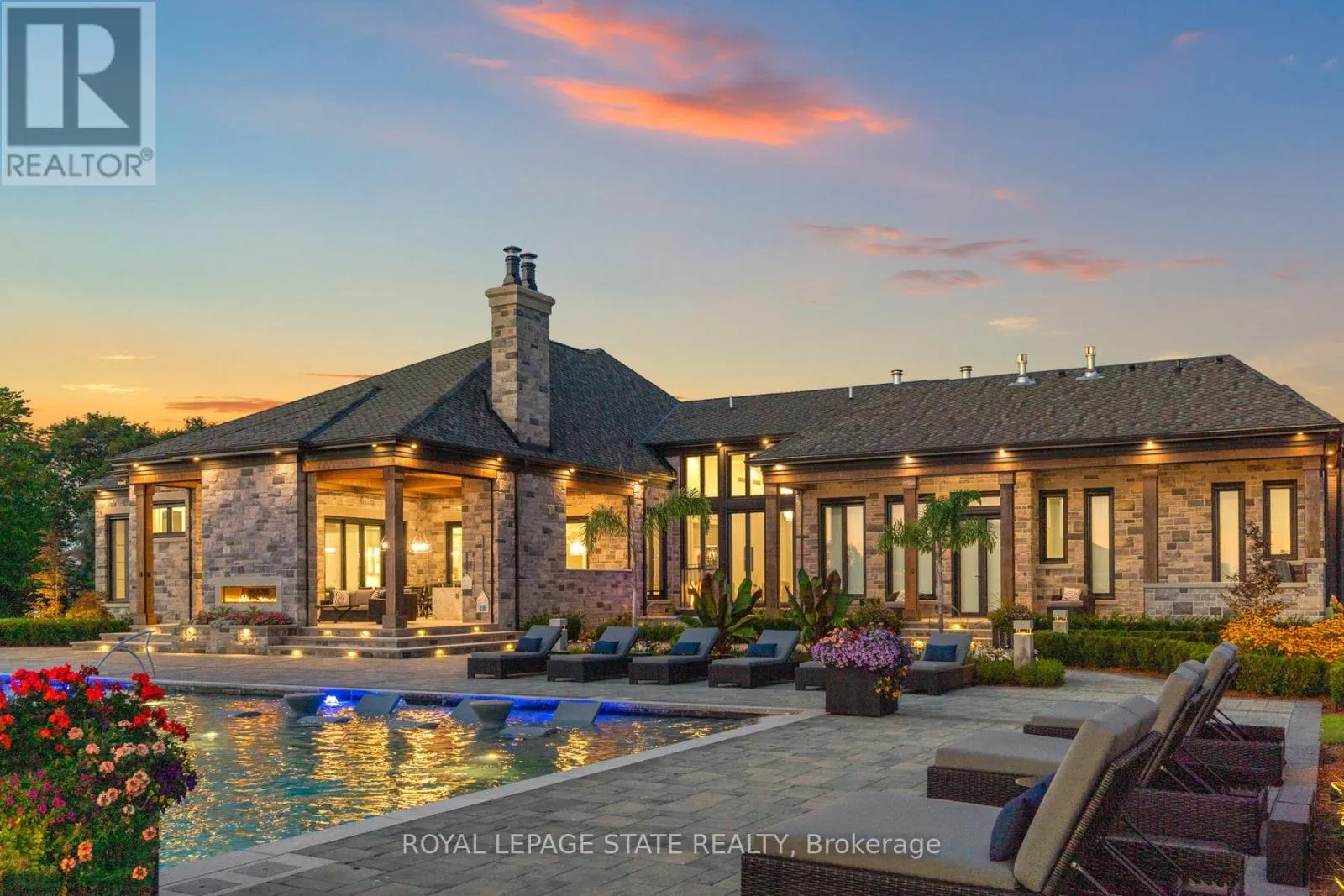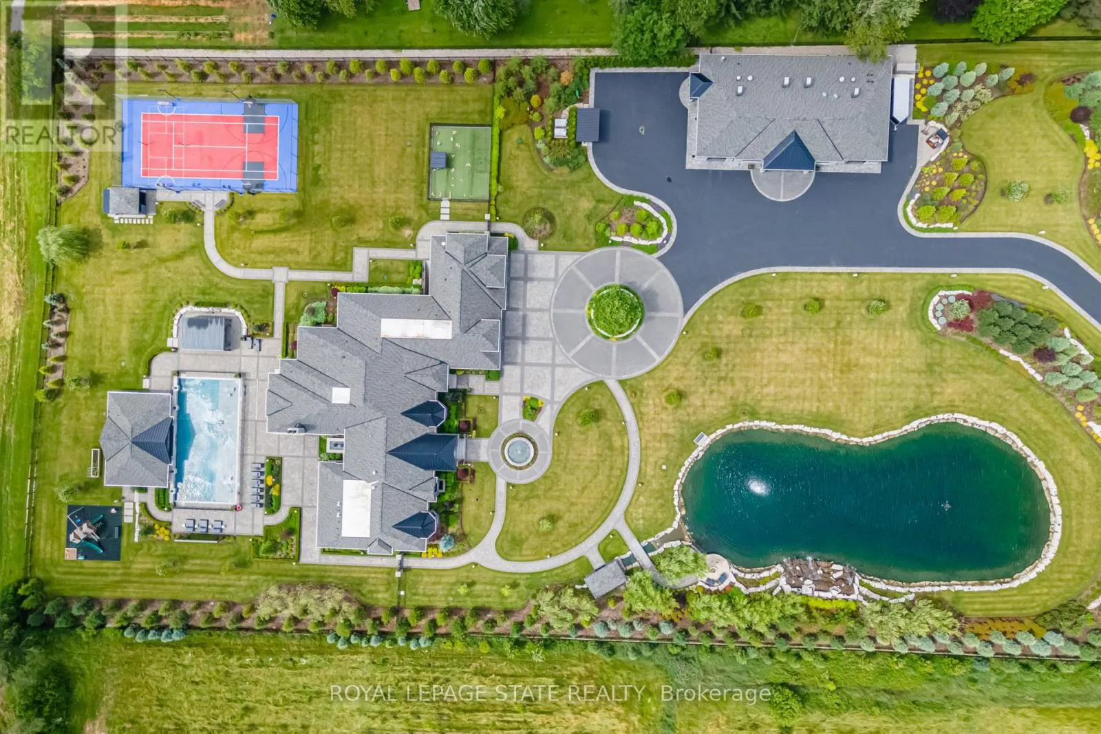 Cross Streets: Book Or Butter Rd. ** Directions: Highway 403 or Garner Road to Fiddlers Green Road. Set amidst a 5.2-acre estate, this extraordinary 26,000+ sq ft mansion offers unparalleled luxury and privacy. The gated and secured property features a stunning 1/3-acre aerated pond leading to a sprawling contemporary bungalow with lofted in-law quarters and a 5,210 sq ft detached garage with lounge, wash bay, and private gas pumpideal for car enthusiasts.Surrounded by serene countryside, yet minutes from the heart of Ancaster, the renowned Hamilton Golf & Country Club, and Highway 403, offering both seclusion and convenience. Inside, every room showcases soaring 14 to 18-foot custom moulded ceilings, 32-inch porcelain flooring, and the highest quality materials and craftsmanship. The state-of-the-art home features whole-home automation by Control4. Spacious living areas feature custom granite walls with Town & Country fireplaces. A gourmet kitchen is equipped with top-tier appliances, including Sub-Zero, Thermador, and Miele. The luxurious lanai is perfect for entertaining, with heated Eramosa flagstone, a full outdoor kitchen, 72 Woods gas fireplace, and phantom screens. The opulent primary suite includes a private patio with hot tub and an expansive dressing room. The ensuite features heated herringbone floors, a soaker tub with fireplace, towel warmer drawers and a digital rain shower. The opposite wing offers three additional bedroom suites, each with walk-in closets and ensuites. A Cambridge elevator provides access to the entertainers dream basement, with a party room, full bar, professional gym with sauna and steam shower, games room, and a state-of-the-art home theatre. This 24-seat Dolby Atmos theatre features a 254-inch screen, 24-foot ceiling height, and a Kaleidoscope movie server for the ultimate cinematic experience. Outdoor amenities include a 35 x 75 heated pool, a 14-person hot tub, and an entertainment cabana with a media area and hosting bar. A regulation-size sports court and a childrens playground complete this family-friendly estate. (id:27476)