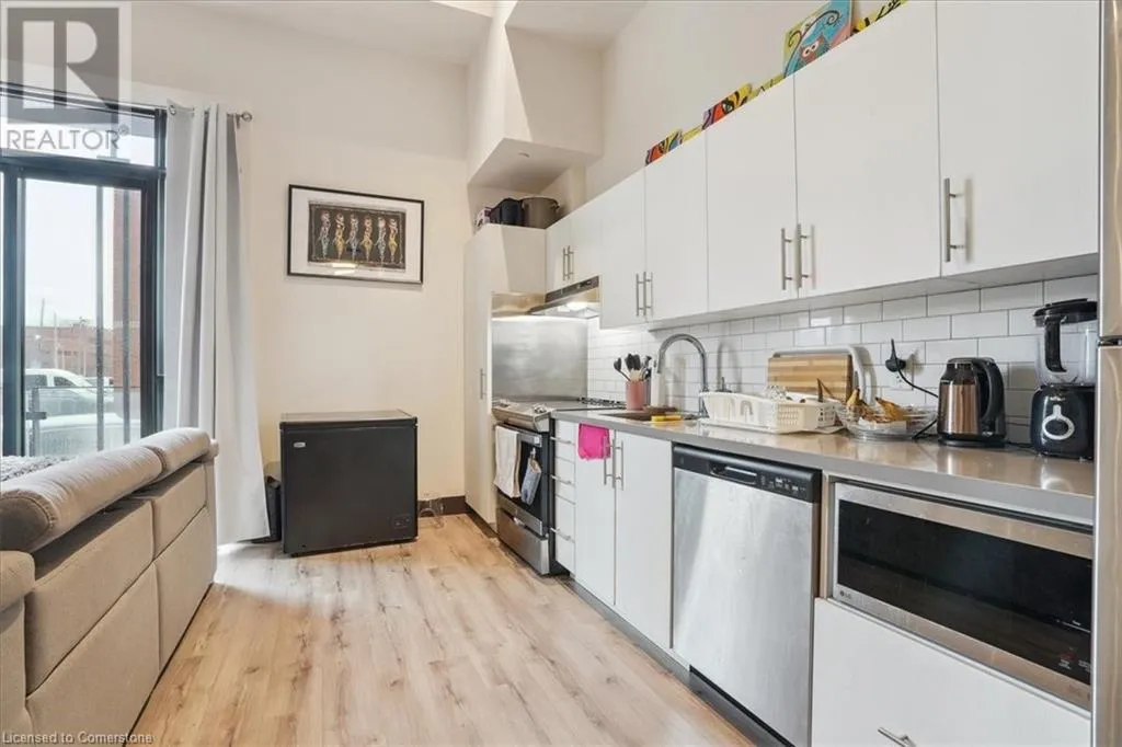 Intersection of King St E and Catherine St N Welcome to Gore Park Lofts, where convenience meets city living! This stunning one-bedroom unit offers a bright and modern space that maximizes every inch with impeccable design and a smooth, flowing layout. It embodies the essence of efficient living with high ceilings that creates a cozy yet expansive atmosphere. Ideally situated in close proximity to-the waterfront trail, art gallery, farmers market, GO station, hospital, and an assortment of unique restaurants and shopsâand conveniently located near McMaster University, this urban gem is waiting for you to call it home. (id:27476)
