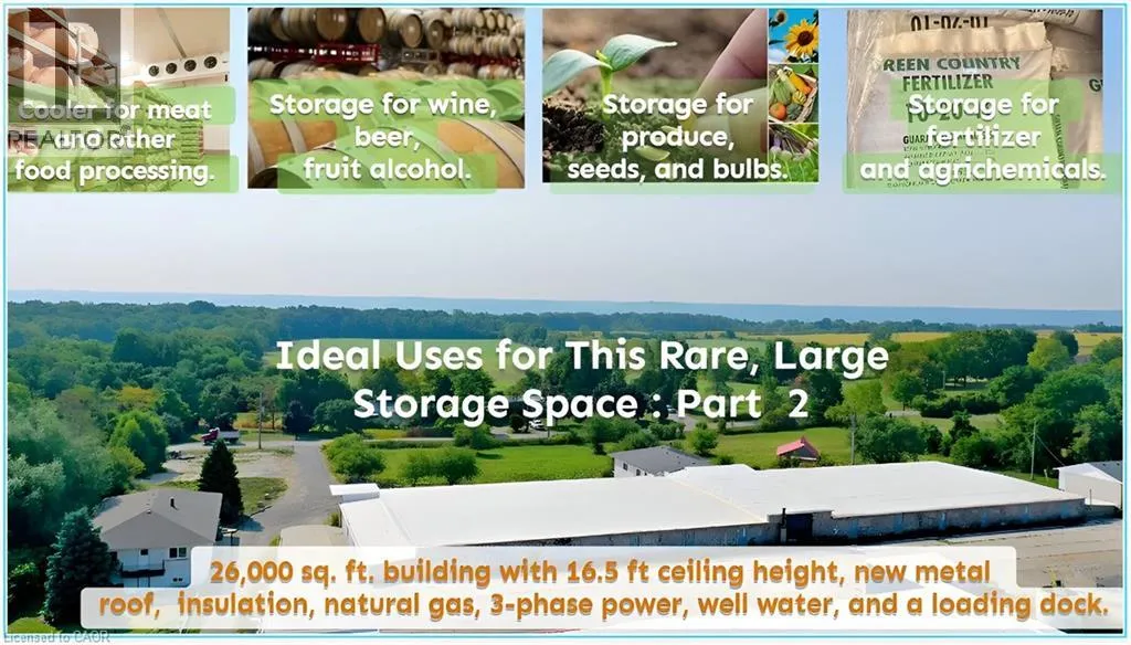 Highway 5 to Cambridge, left turn at Rock Chapel Rd Located in the highly sought-after Flamborough area, this property provides convenient access to Highway 5, Highway 6, the 403, the City of Hamilton, and the Greater Toronto Area, making it an ideal location for a variety of business operations. The barn boasts 26,000 square feet of space with a generous 16.5-foot ceiling height. It features a brand-new metal roof, full insulation, and is equipped with 3-phase power, natural gas, well water, and a durable concrete floor. Additionally, it includes a loading dock for easy access and logistics. The interior of the barn is designed with removable walls, offering flexibility to adapt the space for a range of purposes, including storage, vertical farming, mushroom cultivation, bean sprout production, edible insect farming etc. Additional Details: 1. The barnâs existing structure allows tenants to modify or customize the interior based on their specific needs, at their own expense. 2. The lease is priced at $5.50 per square foot, per year. Tenants will be responsible for all utility costs. 3. There are several sections available for rent: Part 1, Part 3, and House 269 with a workshop. Itâs possible to rent either the entire property or just a portion of it. 4.. Approximately 6â7 acres of workable land are available for lease at the rear of the barn. If desired, the land can be rented at a negotiable rate. Donât miss out â opportunities like this are rare and wonât last long. Contact us today to secure this exceptional space for your business! (id:27476)