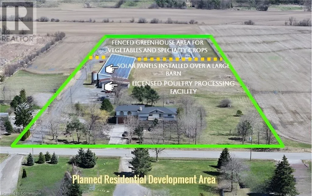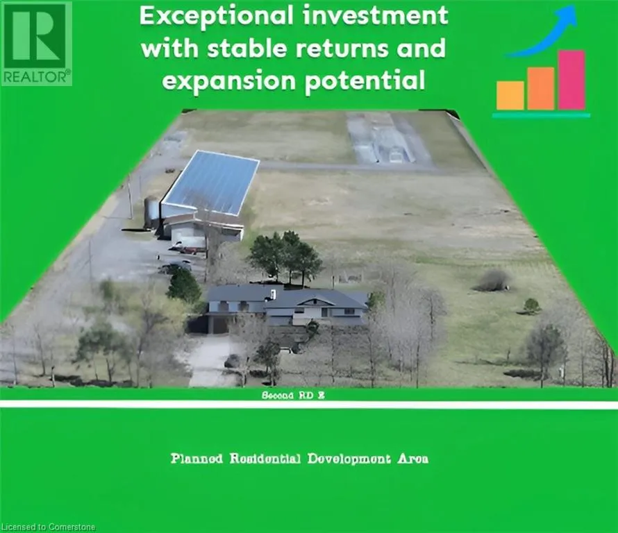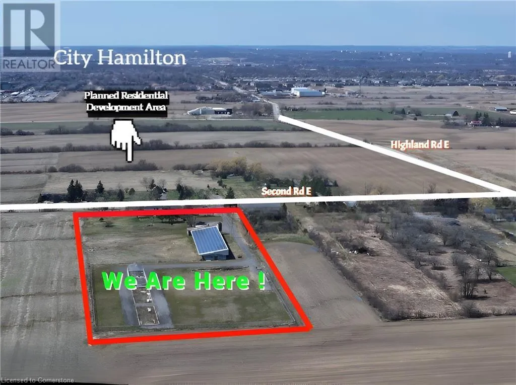 403 To Red Hill Valley Parkway, exit at Mud Street , right turn at the Second Rd E Rare 7-Acre Income-Generating Farm â Future Urban Edge of Hamilton! Incredible opportunity to own a revenue-producing farm just steps from Hamiltonâs urban expansion zone â With the possibility of city sewer and water services being installed soon! Perfect for investors, entrepreneurs, or anyone seeking a self-sustaining property with major upside. Land & Buildings: ⢠7 Acres | 3,700 ft² 4-Bedroom Home | 9,250 ft² Barn | 150kW Solar Roof Project. ⢠Dual driveways and ample parking. Multiple Income Streams: A. Greenhouse Operation: 7 greenhouse permits (1 built, 2 foundations ready), fenced zone with year-round asphalt driveways, all structural components included. B. Chicken Processing Facility: 2,000 ft² licensed processing area, TRQ-eligible under CUSMA/WTO/TPP, ~$100,000/year income potential. C. Solar Energy: FIT1 project generating ~$125,000/year at $0.713/kWh, contract secured until Oct 2035 â 10.5 years of guaranteed income. D. Additional Rental Income: 7,000 ft² of indoor storage space inside the barn â perfect for leasing to farm businesses or storage needs. The Home: Spacious 4 Bedrooms | 2.5 Baths | 2 Kitchens (ideal for multi-gen living or farm staff), antique marble fireplace, hardwood/tile floors, bonus room above garage, new roof (2024). Water & Utilities: City water delivery (cistern), septic system, and two 50-ft deep wells (house irrigation + barn automation) Future Growth: Located directly along Hamiltonâs official expansion boundary â ready for major appreciation as urban development moves closer. Bonus: The senior and experienced owner is willing to fully train the new buyer in all aspects of the business and property management â hoping to pass on his legacy and see this thriving operation grow even stronger. Ideal for: Investors, commercial farmers, poultry processors, greenhouse operators, and lifestyle buyers seeking a rare blend of income and long-term growth. (id:27476)
