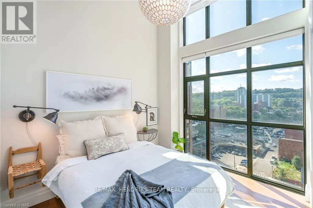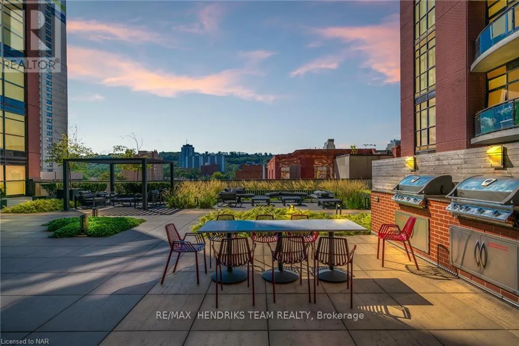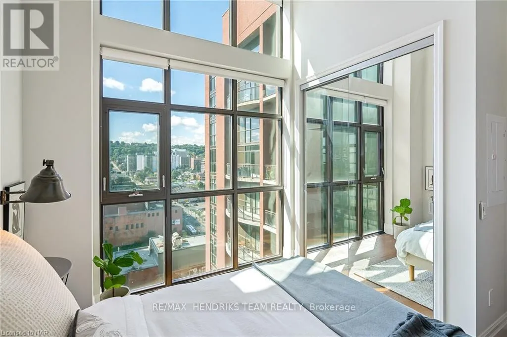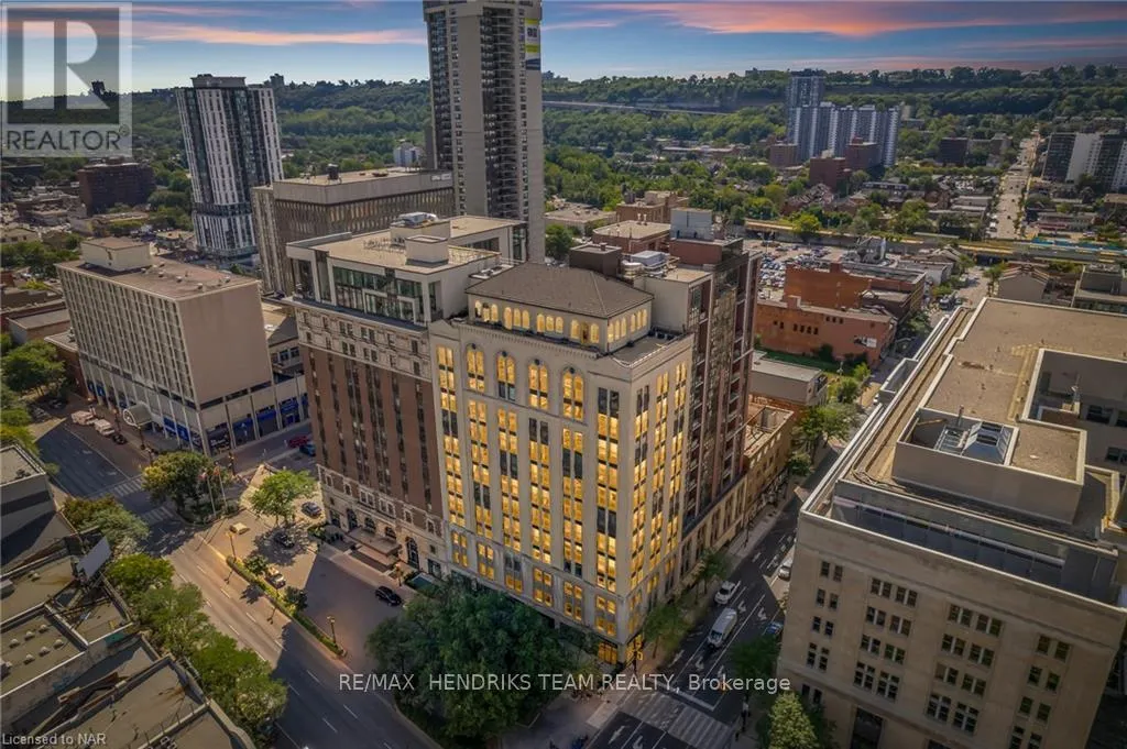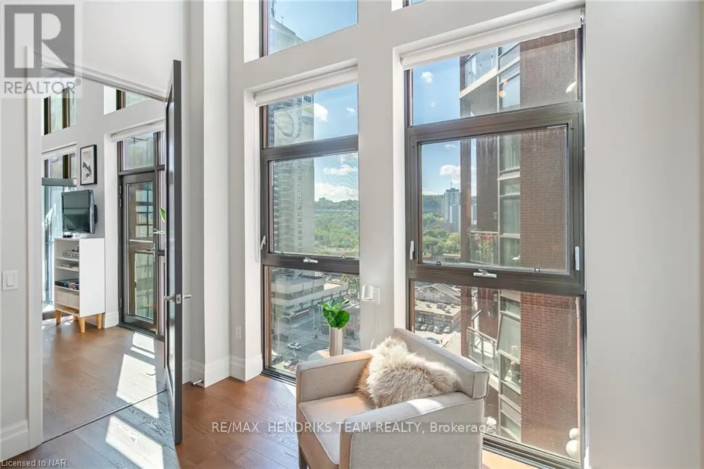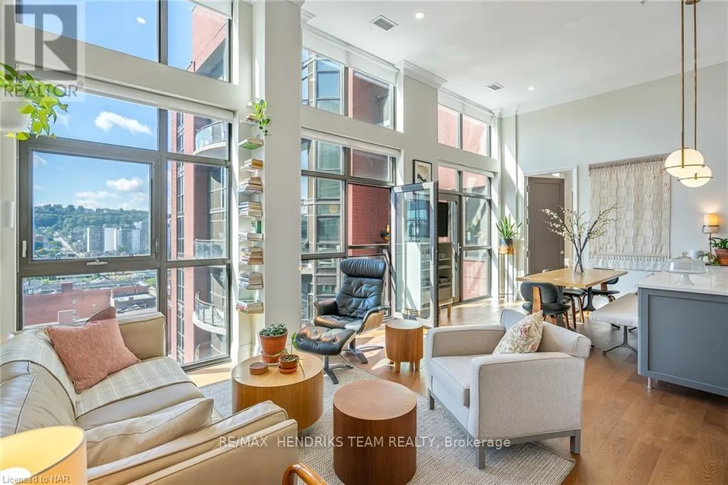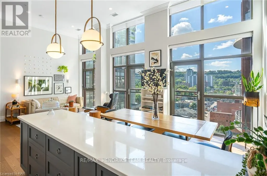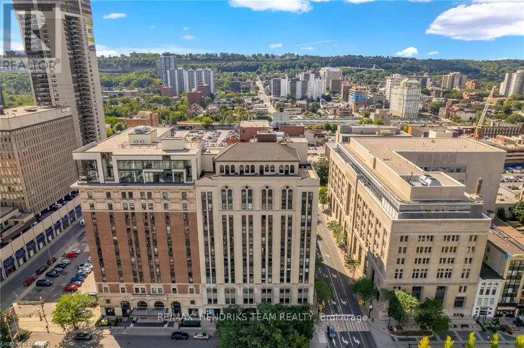 King Street and Catharine Street The best condo deal in all of Hamilton! Gorgeous Lower Penthouse unit - 2 bed, 2 bath and over 1,000 square feet! Situated in the heart of downtown at the residences of the Royal Connaught. Live where the new action in town is with cafe and dining options at your doorstep and around the corner from vibrant nightlife and great shopping. Convenient to transit, highway access, hospitals, and quick commutes to McMaster University and Mohawk College. Huge impressive front lobby with reception and lounge plus separate elevators for condos in the 112 King complex. This fabulous open concept design condo with extra high ceilings throughout make this Lower Penthouse unit really stand out - while tons of natural light shines in! A perfect space for quiet evenings to relax or for Saturday night entertaining. Features beautiful hardwood and tile flooring, floor-to-ceiling windows with Juliet balcony, upgraded light fixtures, built-in dining seating along with many high quality touches at every turn. Awesome kitchen with quartz counters, lots of cabinetry, beautiful high-end appliances and a long centre island/peninsula. Fall in love at first sight upon stepping into the primary bedroom with its soaring ceilings, gorgeous 3 piece ensuite with large shower plus walk-in closet. The second bedroom is its own perfect retreat with convenient access thru the semi-ensuite 4 piece bath that also includes a stackable washer and dryer. This unit includes two storage lockers - one on your floor and one by your underground parking space. The building offers a wonderful array of amenities and amazing architecture at this beautifully converted iconic hotel. Full gym, movie theatre, party room, rooftop terrace with lounge areas and BBQs. Stunning grand lobby that is sure to impress your guests and make you feel welcomed home everyday! Feel confident and at ease with the 24 hour onsite concierge security. Incredible Value! (id:27476)
