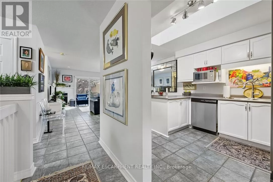 Between Kitty Murray & Meadowland Amazing Bungalow townhouse in Ancaster. Shopping, groceries, restaurants steps away. Open Concept. Spacious unit with completely finished basement. Huge rec-room with loads of custom storage (can be moved), Bedroom and bonus room which would be a great office, exercise room or hobby area. Cozy electric fireplace and a newer 3 pc bath. Ideal area for overnight guests or family. Newer fridge & new dishwasher. Gas fireplace in the living room area. Doors open onto a newer deck with lots of privacy. The primary bedroom can accommodate a king bed and has 2 large cupboards. Ensuite has a tub/shower area. There is a 3rd bathroom (3 pc) and a den or 2nd bedroom on the main level. Very bright & cheerful. Laundry on the main level. The garage can house a car, and lots of visitor parking also. Great, well maintained complex. Condo fees are reasonable. (id:27476)