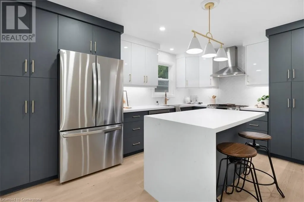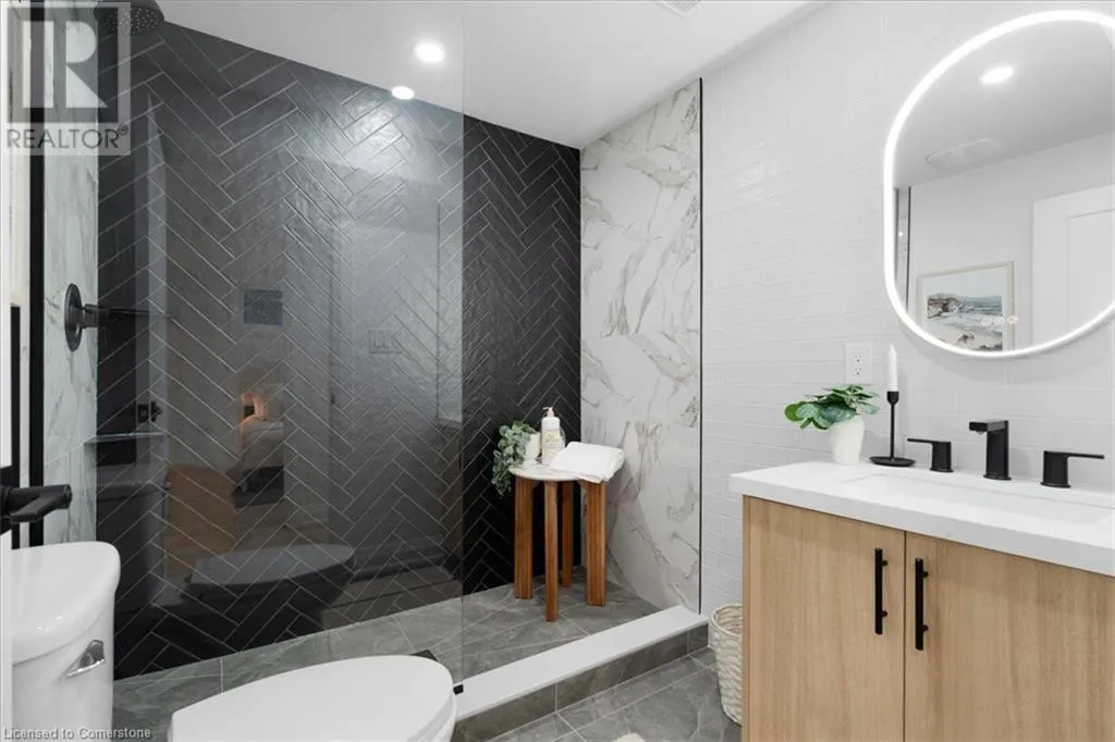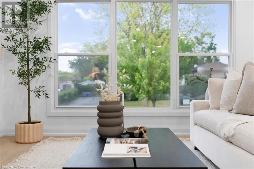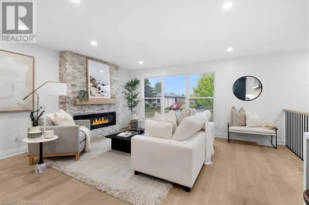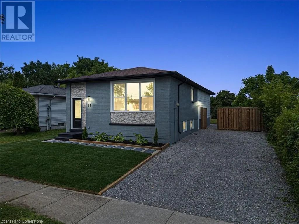 Mellenby St. btwn John Murray St. and Branthaven Dr. Welcome to 15 Mellenby Drive nestled on the sought-after Stoney Creek Mountain just steps from Valley Park, the arena, library, schools, shops, and convenient highway access. This is more than a home, itâs a lifestyle. Set on a quiet, family-friendly street, this completely reimagined residence blends timeless sophistication with todayâs most stylish finishes. Step inside to an open-concept main floor where light pours through big, beautiful windows, highlighting the heart of the home, a showstopper kitchen designed to impress and connect, anchored by a striking floor-to-ceiling stone fireplace that ties together the kitchen, dining, and living spaces seamlessly. Three serene bedrooms on the main floor are complemented by a thoughtfully curated four-piece bath, featuring designer tilework and upscale details throughout. The primary bedroom offers a rare walkout to a private deck, the perfect perch to enjoy your morning coffee, overlooking a tranquil stretch of green space. Downstairs, flexibility reigns. With a separate side entrance, the lower level is ready for guests, teens, or extended family. Featuring two bright bedrooms (with egress windows), a sleek full bath, laundry, and open-concept spaces perfect for a rec room, home office, or play zone. Parking? No problem. Storage? Covered. All thatâs left to do is move in and fall in love with the home, the finishes, and the community. (id:27476)