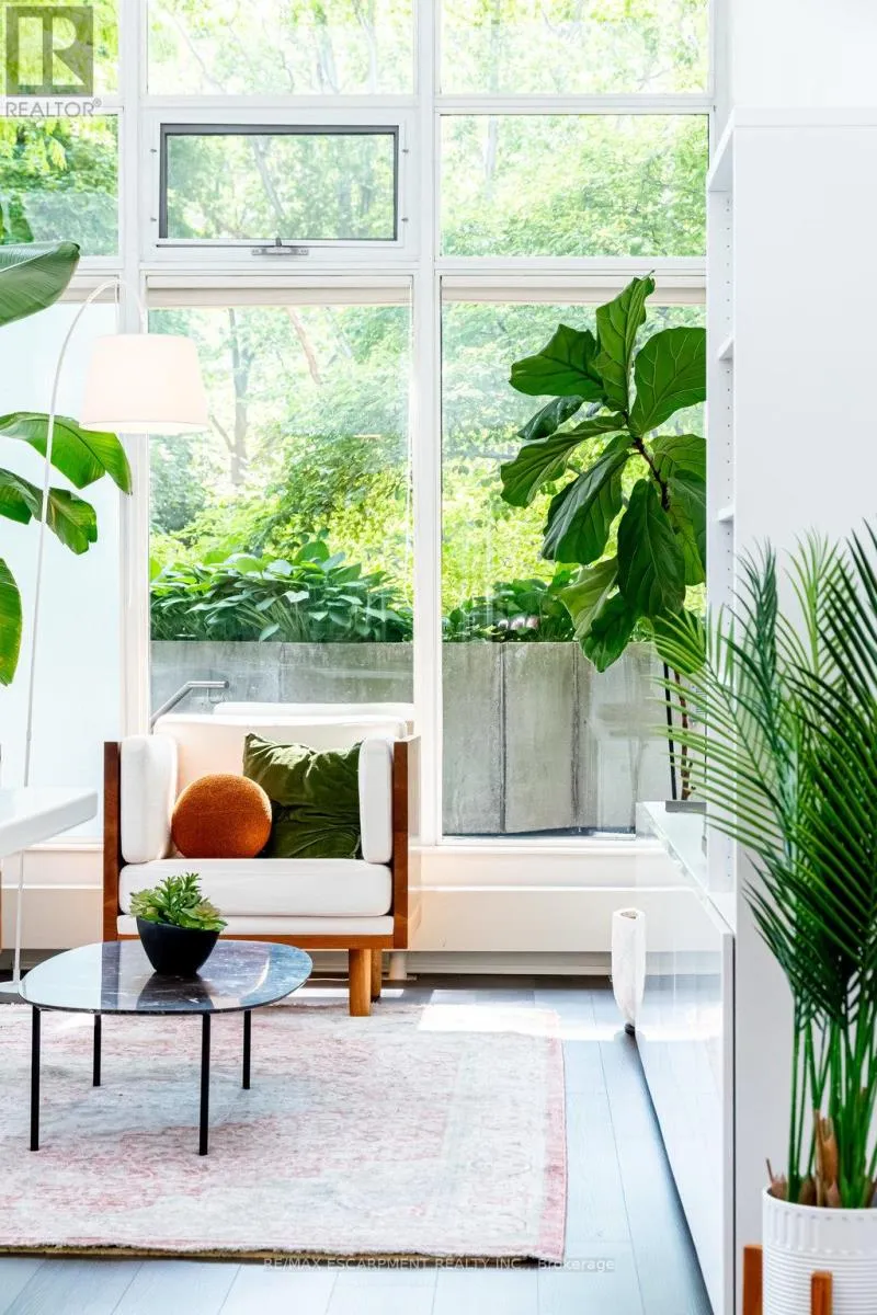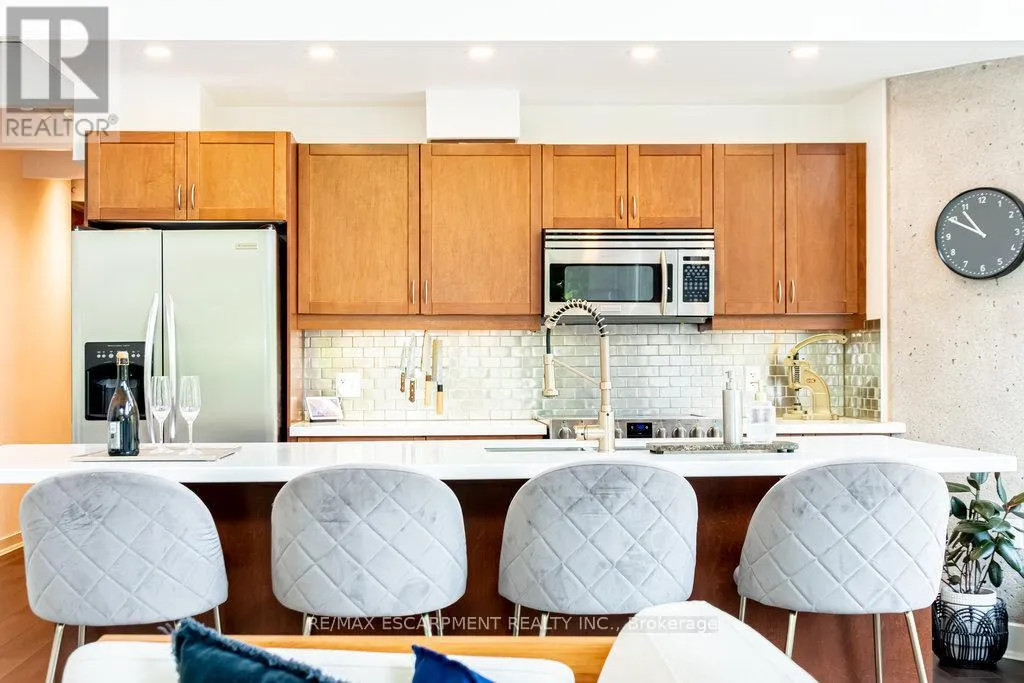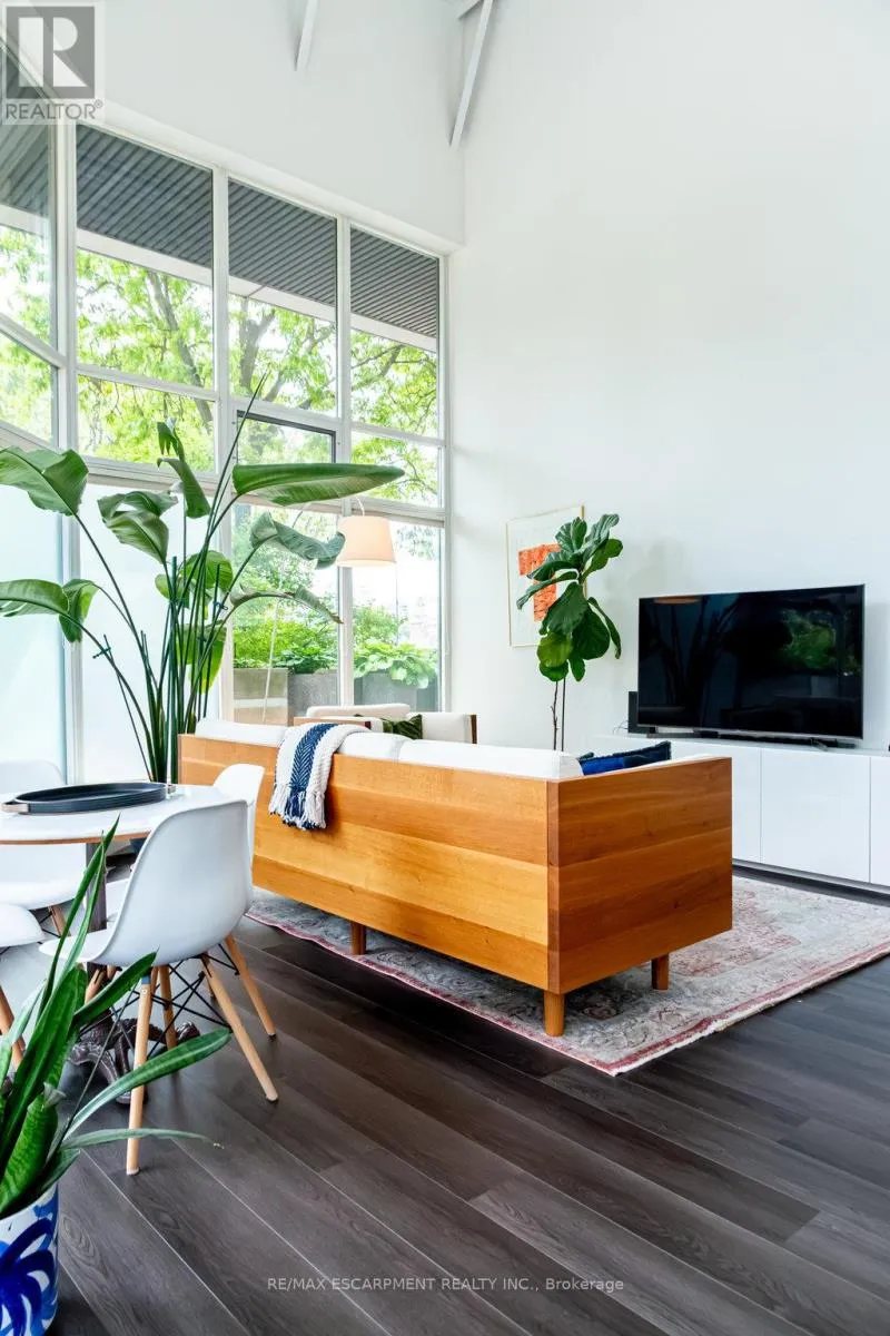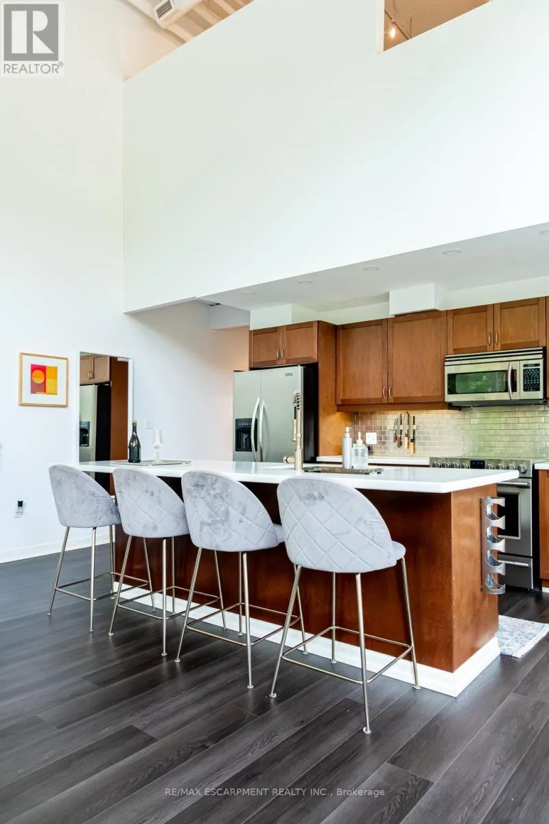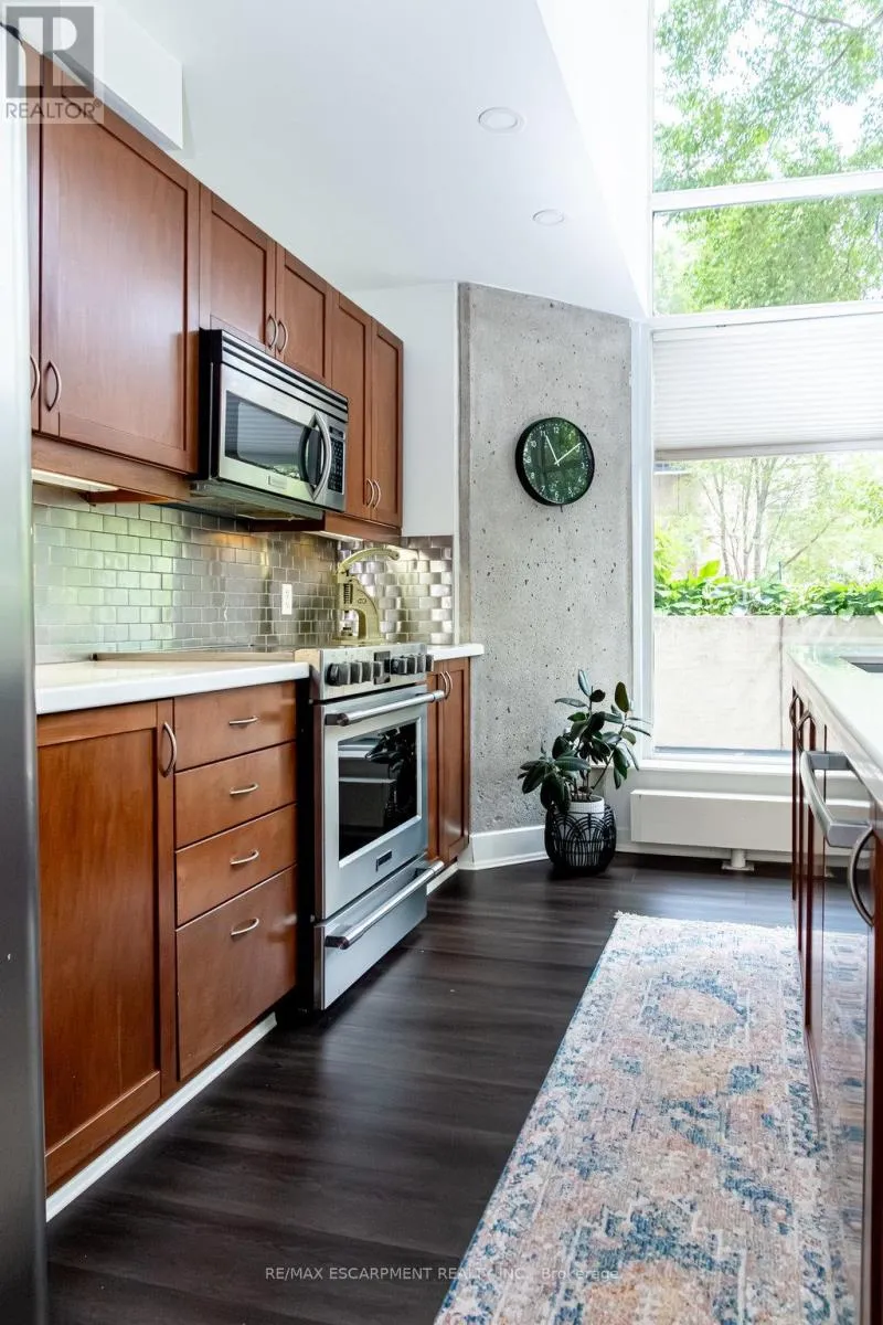 Main St W to Bay St S Welcome to the Core Lofts in beautiful Durand North, where city living meets comfort and style. Tucked away in a prime location, this building offers the perfect blend of convenience and tranquility. Enjoy modern amenities including secure video-monitored entry, a fitness centre, a stylish party room and a breathtaking rooftop patio. This exceptional two-storey main-level loft offers over 1,300 square feet of thoughtfully upgraded living space. Designed with both function and flair, the home greets you with soaring ceilings and a dramatic feature wall. The main floor includes a spacious bedroom, a full bathroom, a contemporary open-concept kitchen and dining area that flows into a stunning living room. Here youre surrounded by panoramic windows and 24-foot ceilings that flood the space with natural light. Upstairs, a beautifully crafted maple staircase leads to your private primary retreat. Overlooking the main living area, this serene space features a generous bedroom with a cozy electric fireplace and a spa-like four-piece ensuite. RSA. (id:27476)