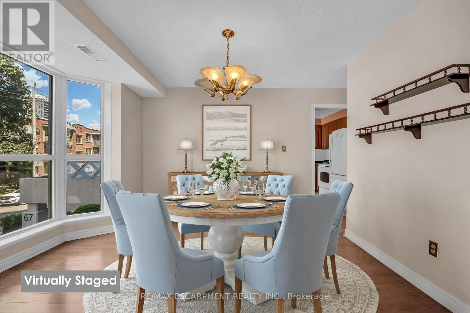 Cross Streets: Main St W/Caroline St S. ** Directions: Niagara-QEW to Hamilton, RedHillVlyPkwy, King Exit, Right on King, Right on Mtn Access, Kenilworth to Sherman, Left on CharltonAveE, Right on BayStS |Toronto-QEW to Hamilton, Main St W exit from ON-403W, Merge onto HWY8/MainStW, Right on CarolineStS. BRIGHT, SPACIOUS & STEPS TO EVERYTHING... Unit 203 at 67 Caroline Street South is a 1521 sq ft CORNER UNIT in Bentley Place, nestled in the heart of Hamilton's vibrant Durand North neighbourhood. This bright and beautifully laid-out suite offers the perfect blend of space, comfort, and unbeatable location. Step inside and be greeted by an OVERSIZED LIVING ROOM with expansive windows that flood the space with natural light plus WALK OUT to a private, WRAP-AROUND CORNER BALCONY. The living space flows seamlessly into a formal dining room with bay window and a spacious eat-in kitchen loaded with abundant cabinetry and an extended dining nook, perfect for everyday meals or entertaining guests. The primary suite is your own private haven, featuring a walk-in closet, 4-pc ensuite with soaker tub and separate shower, and a balconette walk-out for a touch of fresh air. A generous second bedroom with walk-in closet, a second full bath, and convenient in-suite laundry complete the layout. This unit includes TWO parking spaces (1 underground P2#4, 1 surface #14), and the building offers fantastic AMENITIES including an exercise room and party room with kitchen. Bonus: the building has all NEW THERMAL WINDOWS (2025), adding value and energy efficiency. Location is everything and this one delivers! Enjoy walkable access to nearby parks, Locke Street, and Hess Village, with boutique shopping, amazing restaurants, and the GO Station just minutes away. If you're seeking a spacious and sun-filled condo in one of Hamilton's most desirable neighbourhoods, this is it. CLICK ON MULTIMEDIA for virtual tour, drone photos, floor plans & more. (id:27476)