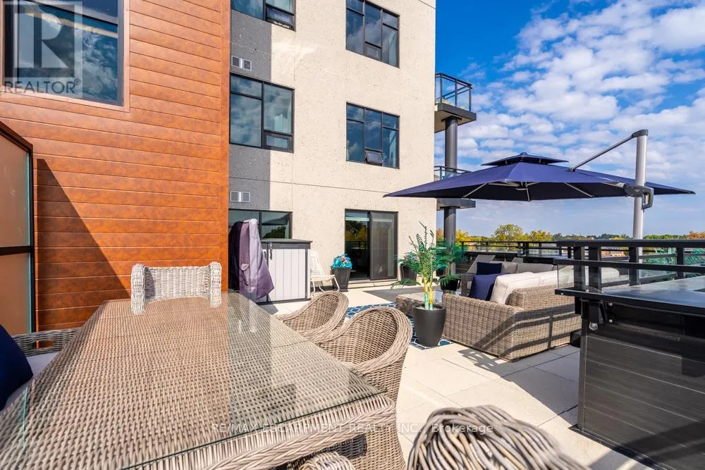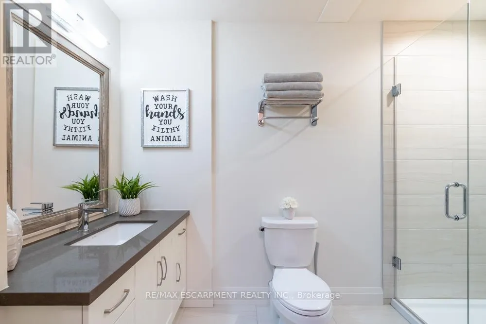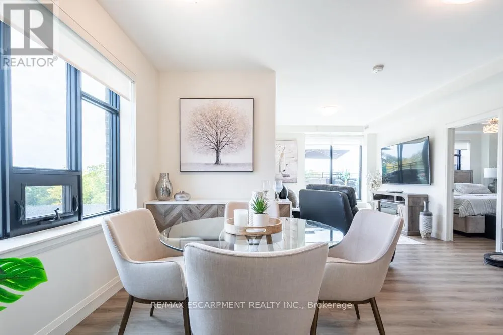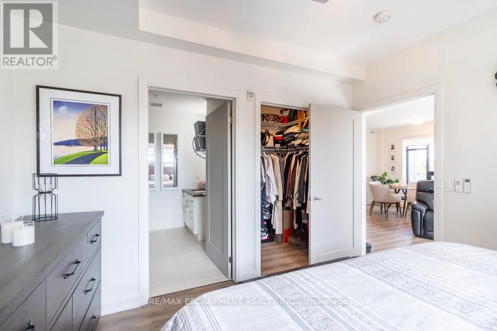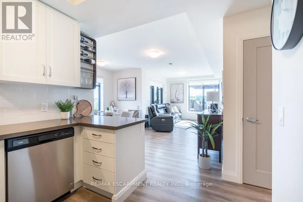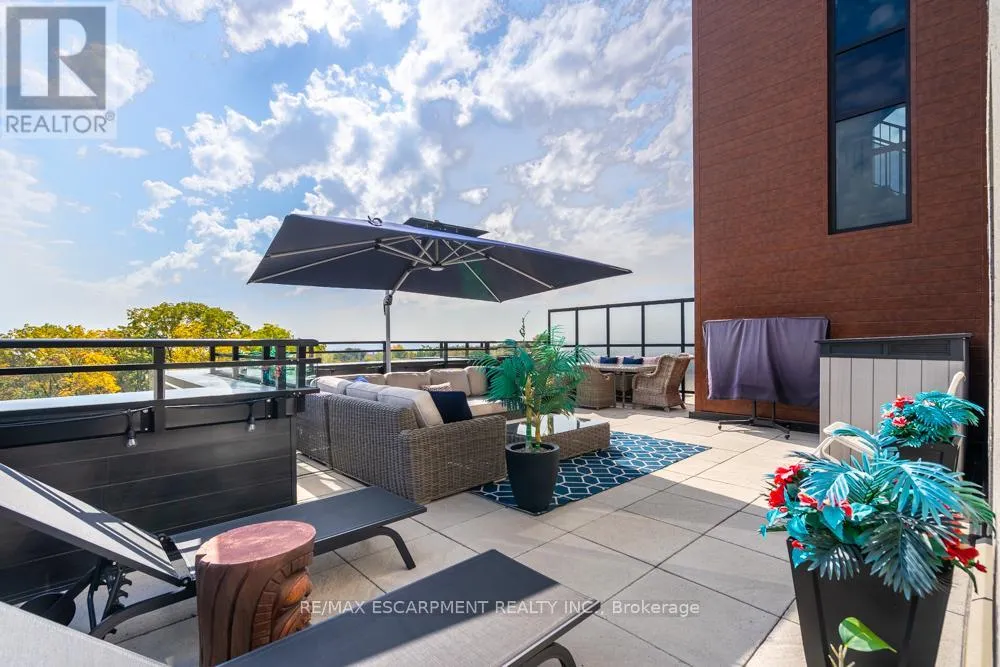 Dundas St E to Hamilton St S Dreaming of condo living without giving up your outdoor space? This rarely offered corner unit delivers the best of both worlds with a massive 600 sq ft private terrace perfect for entertaining, relaxing and soaking up incredible lake AND city views. Inside, you'll find a 2-bed, 2-bath gem loaded with upgrades: a chefs kitchen with beautiful quartz counters, clean white subway tile backsplash, soft-close custom cabinetry, under cabinet lighting and a breakfast bar. The bedrooms are spacious, and the primary suite has its own four-piece ensuite. Enjoy in-suite laundry for your convenience. Thats not all, this building has stunning amenities including a lavish party room, a dog wash station, a gym and rooftop patio. And the location? Unbeatable. Steps to restaurants, groceries, trails and highway access, all in the heart of Waterdown. This one has it all. RSA. (id:27476)