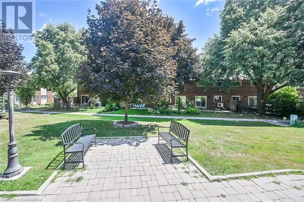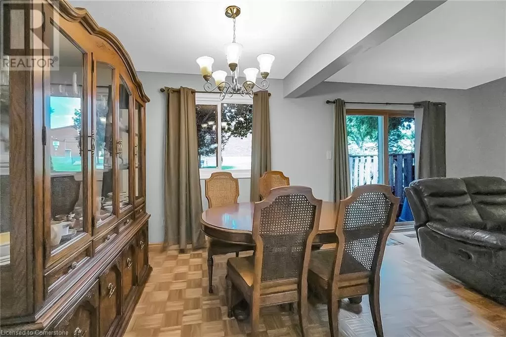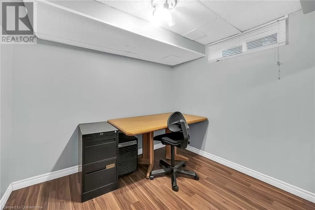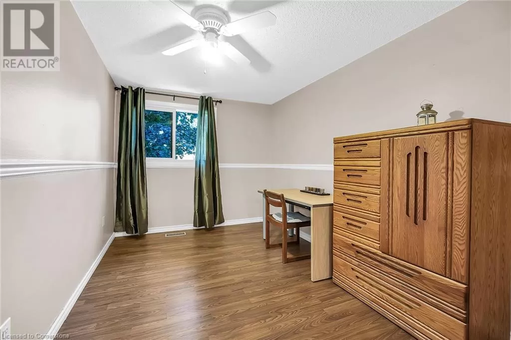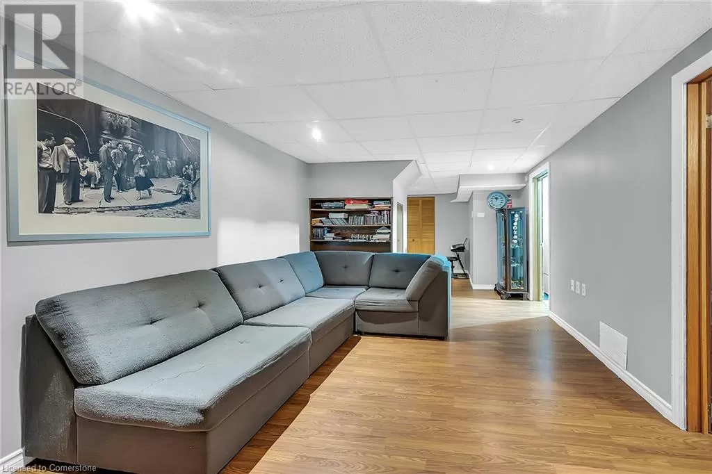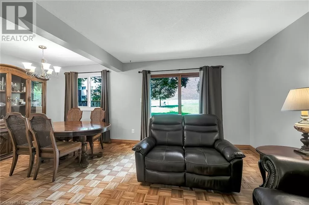 Stone Church Road West to Garth Street. Very well kept fully finished 3 bedroom, 1.5 bath 2 storey townhome with bonus den in quiet complex in desirable west mountain location. Wonderfully peaceful rear yard with no close by rear neighbours. All three levels carpet free. Parquet flooring throughout living room & dining room. Main floor offers functional kitchen with newer countertops 2025, eat-in breakfast bar & ceramic flooring, as well as a formal dining room and spacious living room with sliding door to rear patio & yard plus a convenient powder room. Hardwood staircase leads to second level featuring three generous sized bedrooms, all with laminate flooring, & 4 piece bath with several updates including toilet, vanity & ceramic flooring 2023. Fully finished lower level provides more living space & features roomy & cozy rec room with pot lights & laminate flooring, den (potential 4th bedroom) also with laminate flooring & utility room with laundry area. Two piece rough-in bath offers potential for future extra bathroom. Updated panel box 2015. Some newer windows 2024. Quick and easy access to the Linc. Close to all amenities. (id:27476)