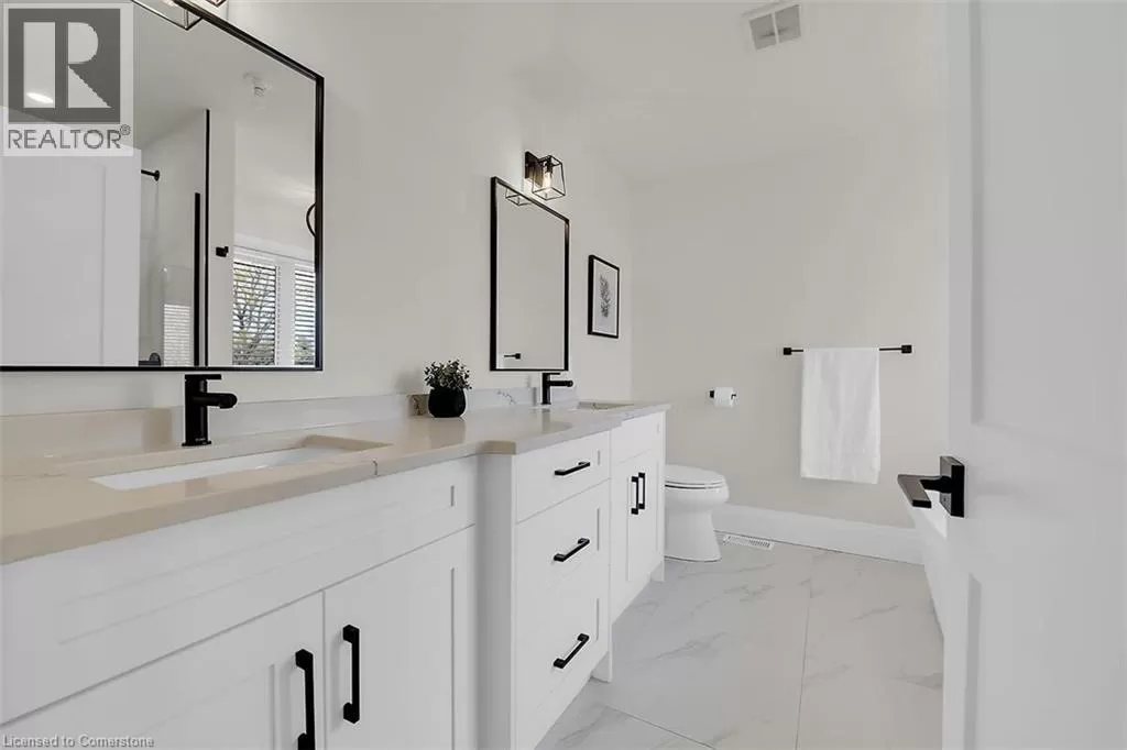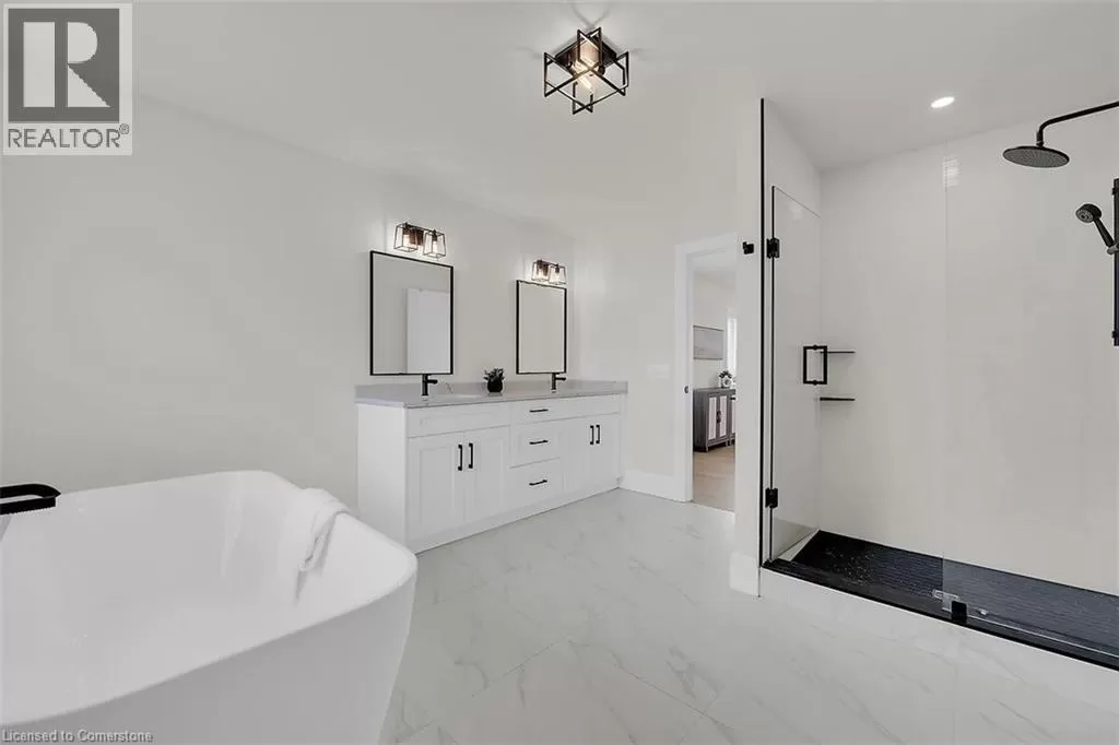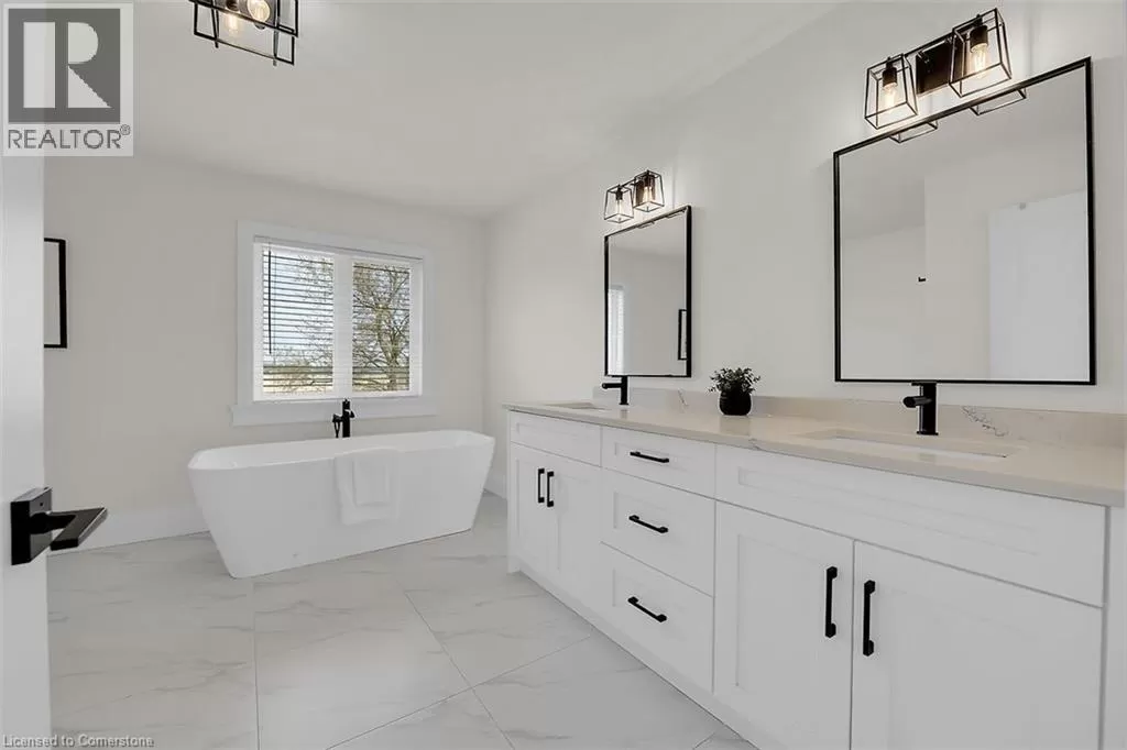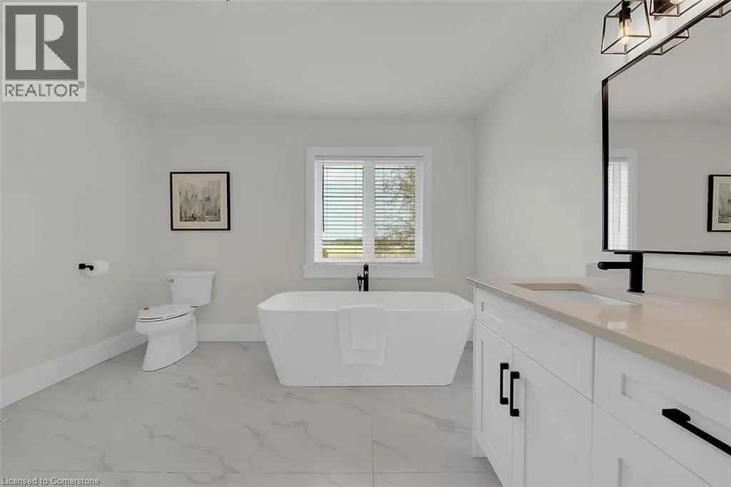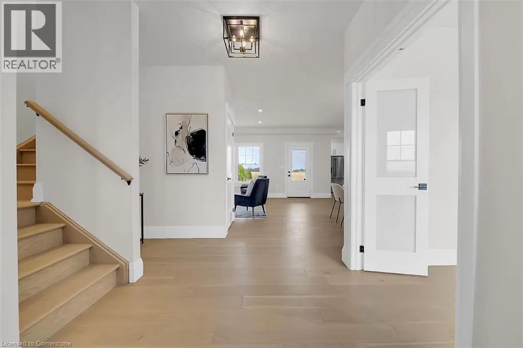 From Hwy 6, East on Airport Road, property is on the left hand side Rent to own option available. Luxury custom home built in 2023. Escape to the country with the convenience of all amenities just a short drive away! Minutes from Hwy 6 & Hwy 403, with quick access to shopping, restaurants and Hamilton Airport. The main floor features an open concept layout with a combination of engineered hardwood and tile floors, and an abundance of natural light. The den is situated at the entry of the home and provides a great work from home space. The kitchen offers quartz counters and backsplash, stainless steel appliances and a large island that is great for entertaining. There is also an upper level family room which is ideal for large and growing families. The stunning primary suite features a lavish ensuite with freestanding soaker tub and separate shower plus an enormous walk in closet. The upper level hosts 3 additional bedrooms, main 5 piece bath and a convenient laundry room. Enjoy the outdoors on your covered rear porch complete with scenic farm views. (id:27476)