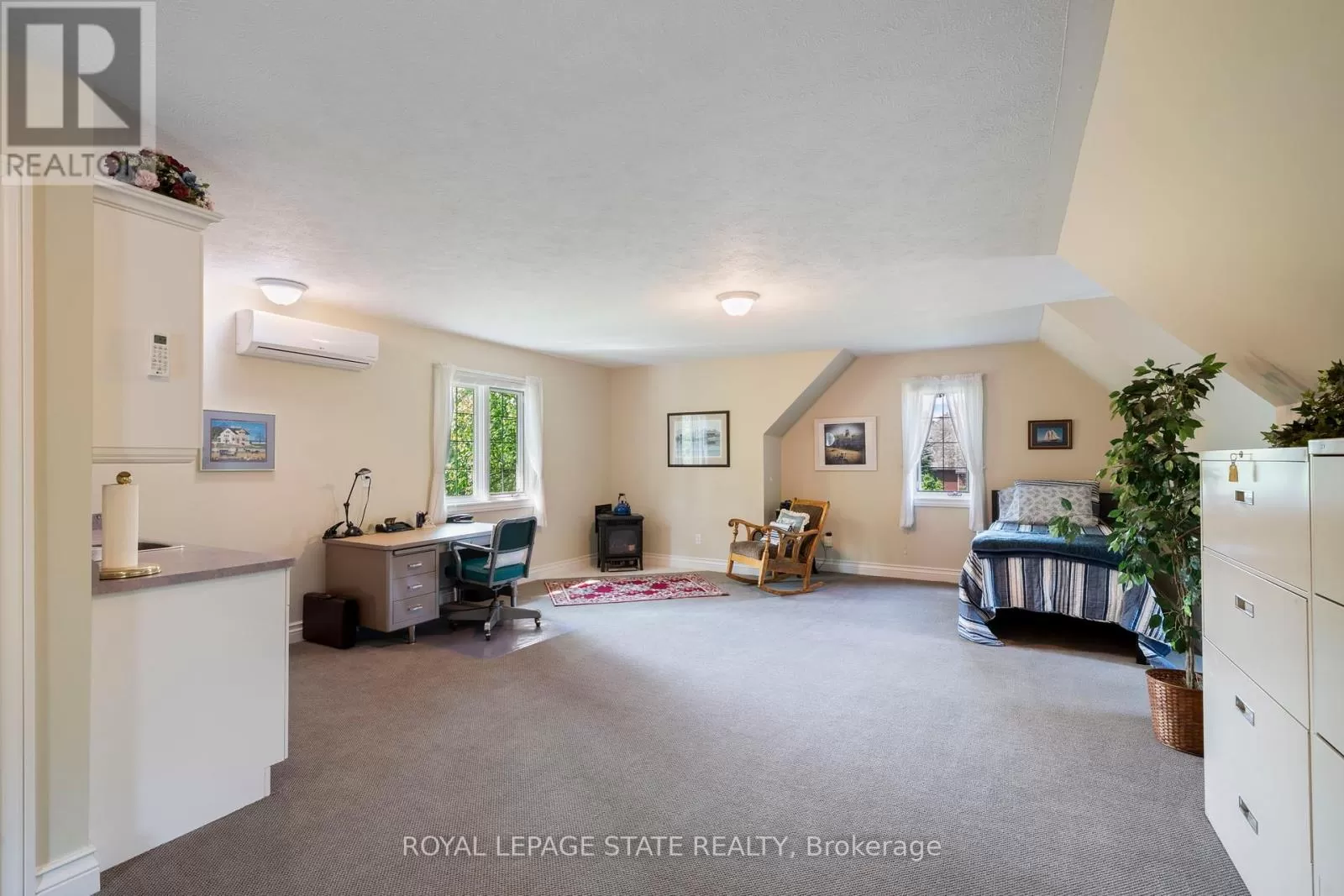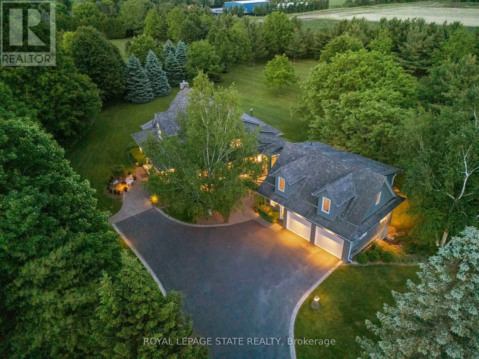 Carlisle Rd to Progreston Welcome to your private country retreat on nearly 4 acres in the heart of Carlisle. From the moment you arrive, this property leaves a lasting impression with its winding driveway, lush natural surroundings, and timeless centre-hall design. Nestled on a quiet hill and surrounded by mature trees, this custom-built home offers an exceptional blend of craftsmanship, quality, and classic charm. The inviting front and covered side porches provide peaceful spaces to relax and take in the views. Inside, the home showcases maple hardwood flooring and a bright, open-concept layout designed for modern living. The kitchen is equipped with high-end stainless steel appliances, quartz countertops, and a large central island that flows seamlessly into the dining and living areas, perfect for both entertaining and everyday comfort. Just off the kitchen, a sunroom offers a serene spot to enjoy morning coffee while overlooking the greenery. The family room exudes warmth with its inviting fireplace and direct walkout to the backyard. Upstairs, the primary suite is a true retreat. Designed with spa-like comfort in mind, this space features a spacious layout, walk-in closets, and a luxurious en-suite bathroom complete with a glass shower, soaker tub, double vanity, and heated floors. The fully finished basement offers generous additional living space and ample storage, making it perfectly suited for a variety of needs. A standout feature of this property is the workshop, ideal for storage, projects, or equipment. Another highlight is the spacious, fully finished apartment above the double garage with a separate entrance, offering incredible potential for guests, in-laws, or rental income. This is a rare opportunity to own a truly versatile property in one of Carlisles most picturesque locations. With premium finishes, thoughtful design, and expansive indoor and outdoor living spaces, this home delivers a lifestyle thats increasingly hard to come by. (id:27476)