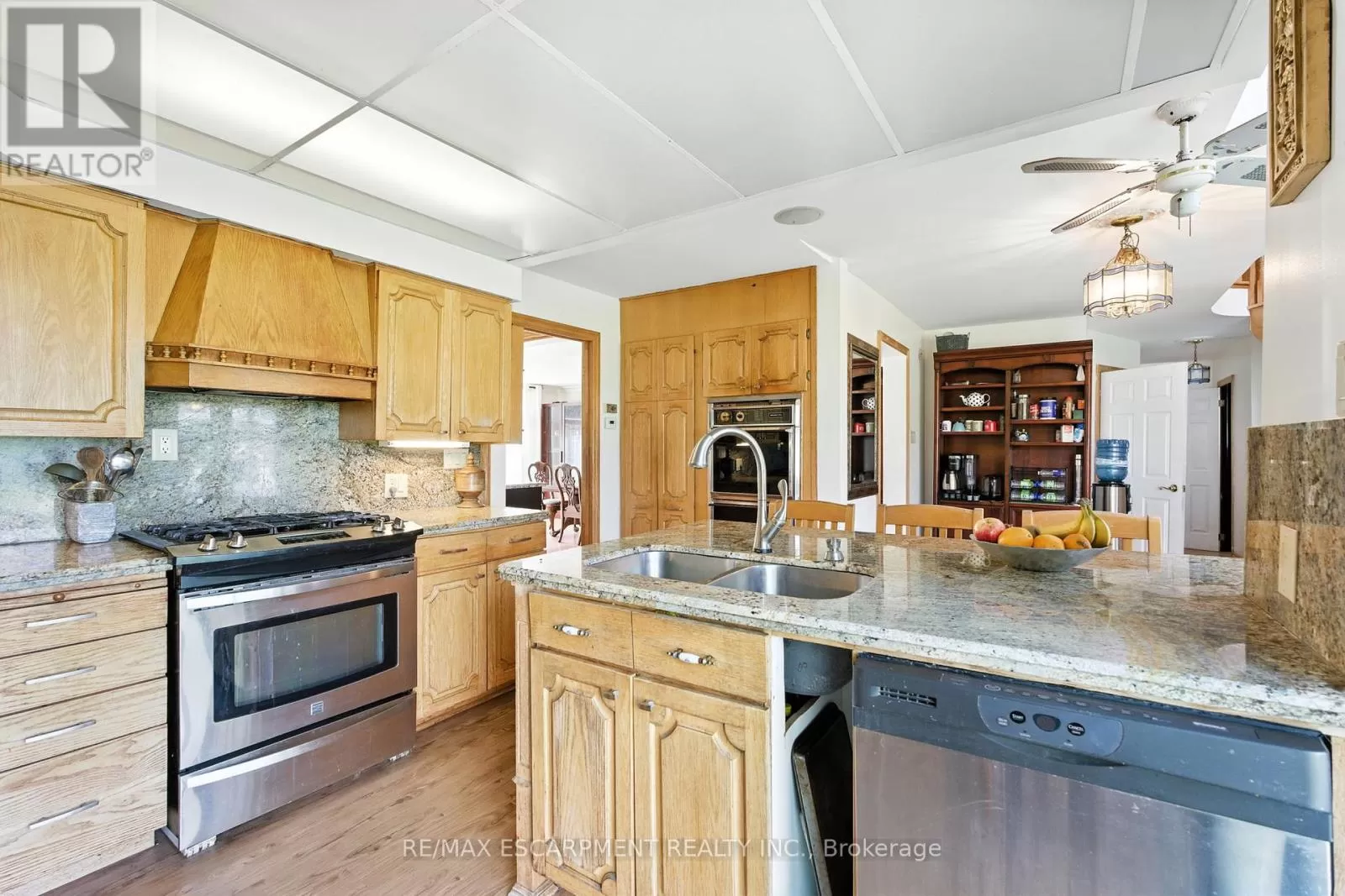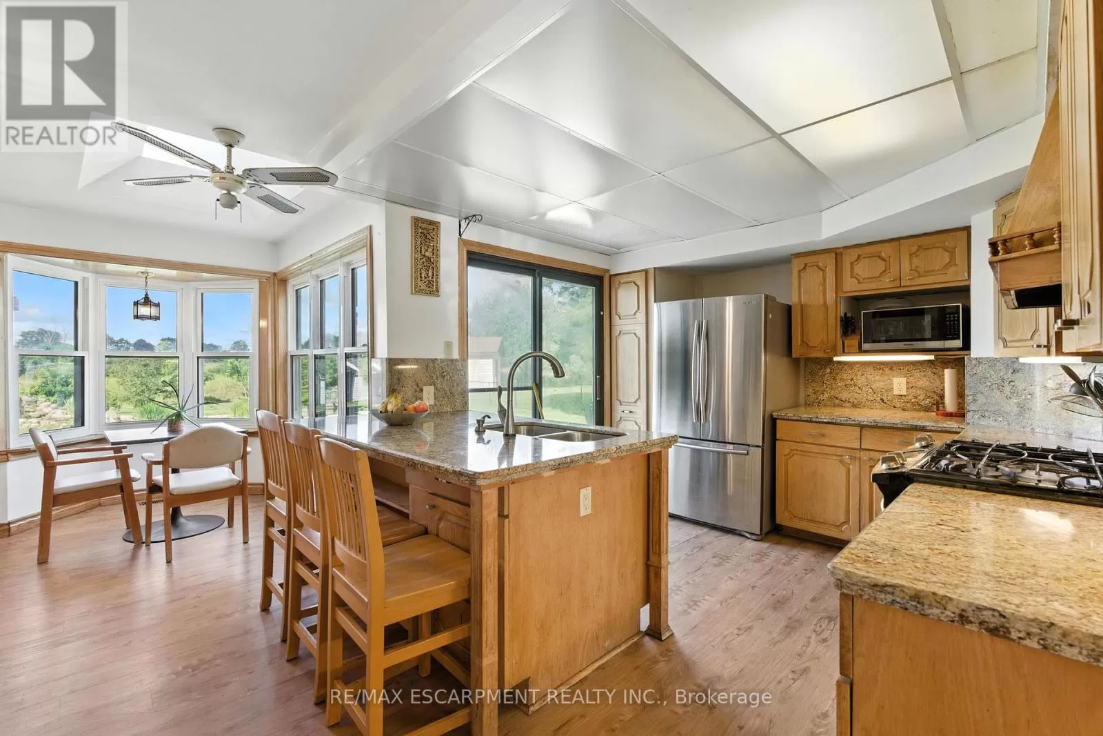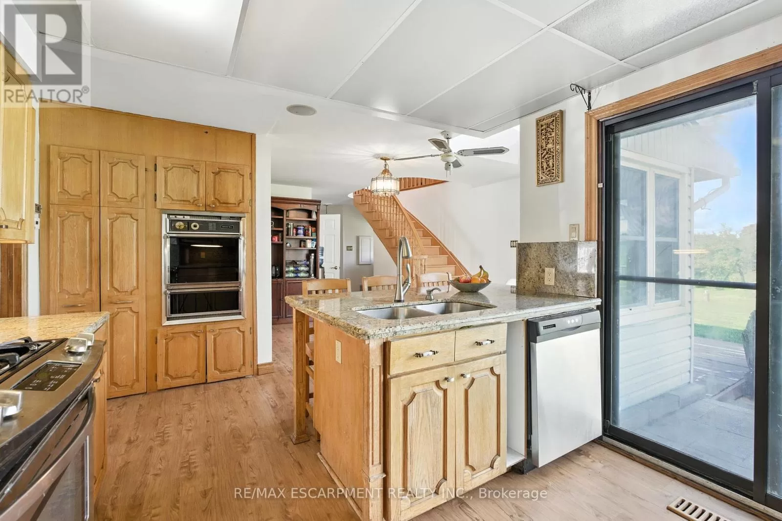 Hwy 5 past Sydenham Rd, before Ofield Rd N Bring your vision and creativity to this incredibly spacious and unique two-storey home on a premium 100' x 150' lot backing onto open fields! Offering over 3,500 square feet of living space, this one-of-a-kind and functional layout has amazing potential for a multi-generational setup. The main level features a large eat-in kitchen with granite countertops and gas stove, three generously sized bedrooms, main-floor laundry, and oversized living spaces throughout. The upper level is home to a massive primary suite with ensuite - perfect for a private retreat and family room with high ceilings and a wet bar. All rooms are impressively sized, offering endless renovation opportunities. Located just minutes to Dundas, Waterdown, Burlington, Hamilton, major highways and the GO Station - this is a fabulous location to invest in and transform into your dream home! RSA. (id:27476)