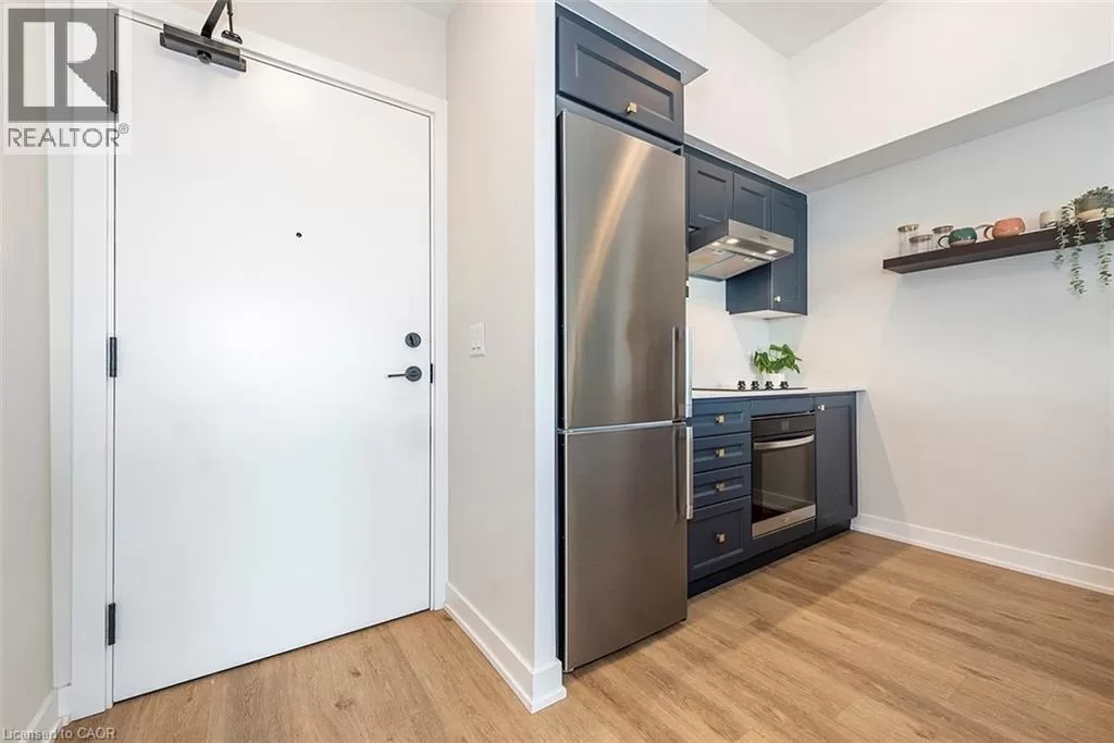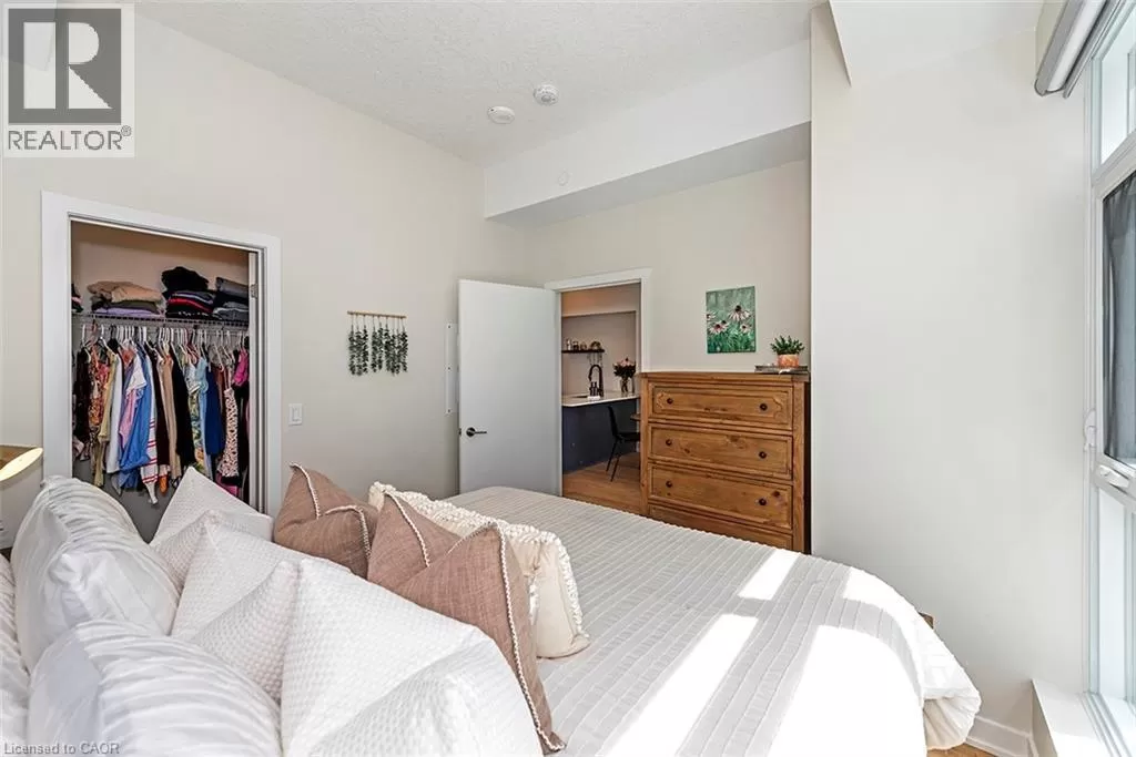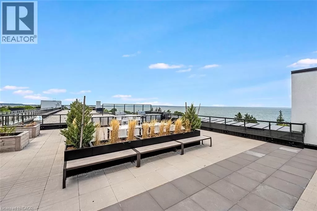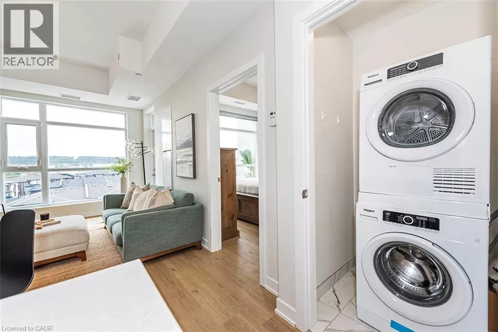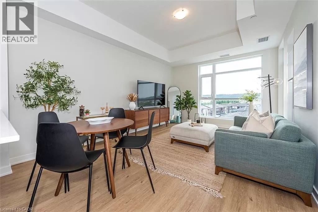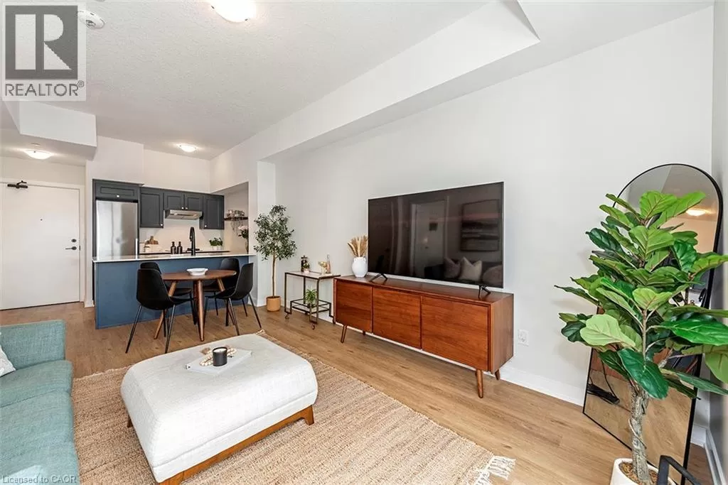 QEW Fruitland North Service Welcome to your penthouse retreat at COMO Condos in Stoney Creek! This impressive penthouse suite features 9-ft ceilings, a bright open-concept layout, and oversized windows that fill the space with natural light. The modern kitchen is beautifully appointed with quartz counters and backsplash, soft-close cabinetry with gold hardware, an upgraded MOEN faucet and sink, and plenty of counter space for cooking or entertaining. The chic bathroom showcases upgraded tile work, recessed shower lighting, and ceiling tiles above the tub for a spa-like touch. The spacious bedroom with a walk-in closet and motorized roller blinds, provides both comfort and function, while the private balcony offers escarpment views and spectacular sunsets. With vinyl flooring throughout, elegant finishes, and a prime location just minutes to the GO Station, QEW, hiking trails, shops, dining, and Niagaraâs renowned wineries, this penthouse combines convenience, sophistication, and lifestyle in one exceptional package. (id:27476)