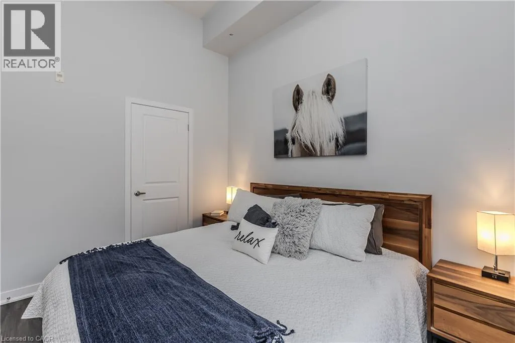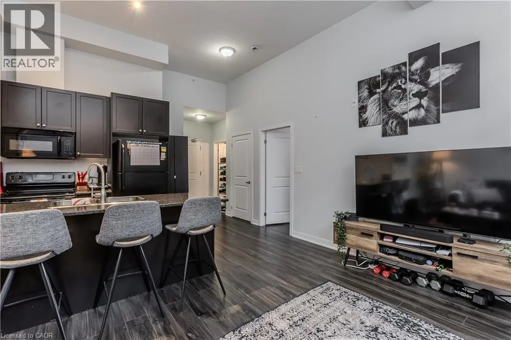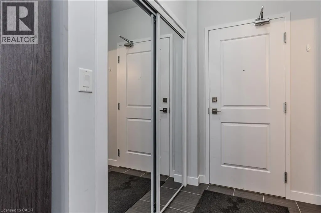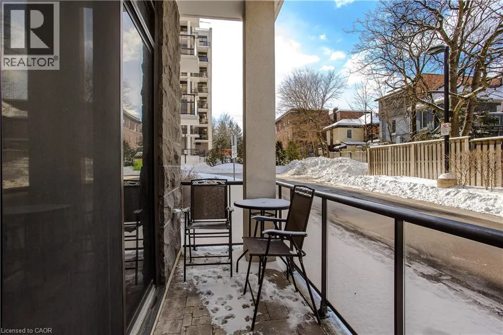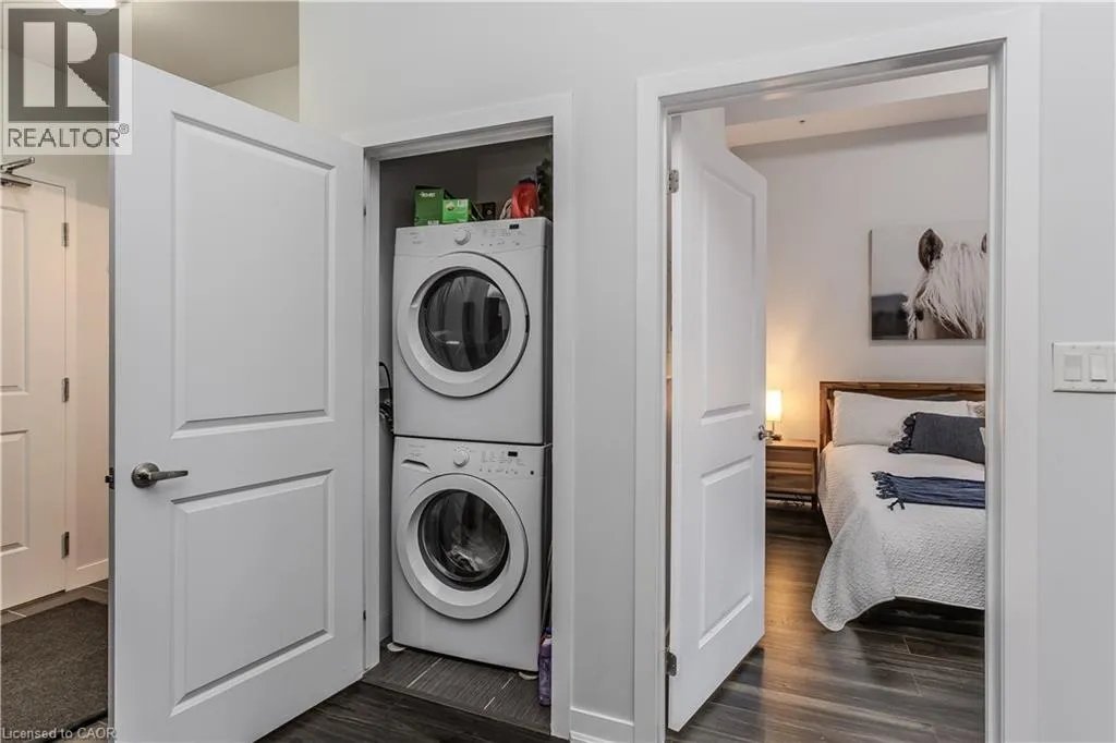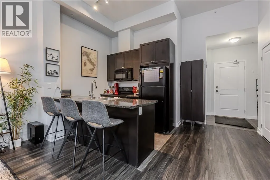 James St S to Robinson St Welcome to City Square, a stylish and modern condo in Hamiltonâs sought-after Durand neighbourhood! This stunning 1-bedroom, 1-bathroom unit offers 11 ft ceilings and oversized windows, flooding the open-concept space with natural light. The contemporary kitchen features a peninsula with a breakfast bar, a pantry, and sleek finishes, while the spacious bedroom offers private balcony access. The modern bathroom boasts a glass and tile shower with ample counter space. Enjoy the convenience of in-suite laundry and a bright, airy living space. The City Square building offers hotel-like amenities, including an exercise room, party room, media room, yoga room, and a two-floor terrace with BBQs, bike storage, and lockers. Located just steps from shopping, dining, and public transit, this condo is also close to St. Josephâs Hospital and the Hunter Street GO Stationâperfect for professionals and commuters. Don't miss this opportunity to live in one of Hamiltonâs most vibrant communities! Book your showing today! (id:27476)