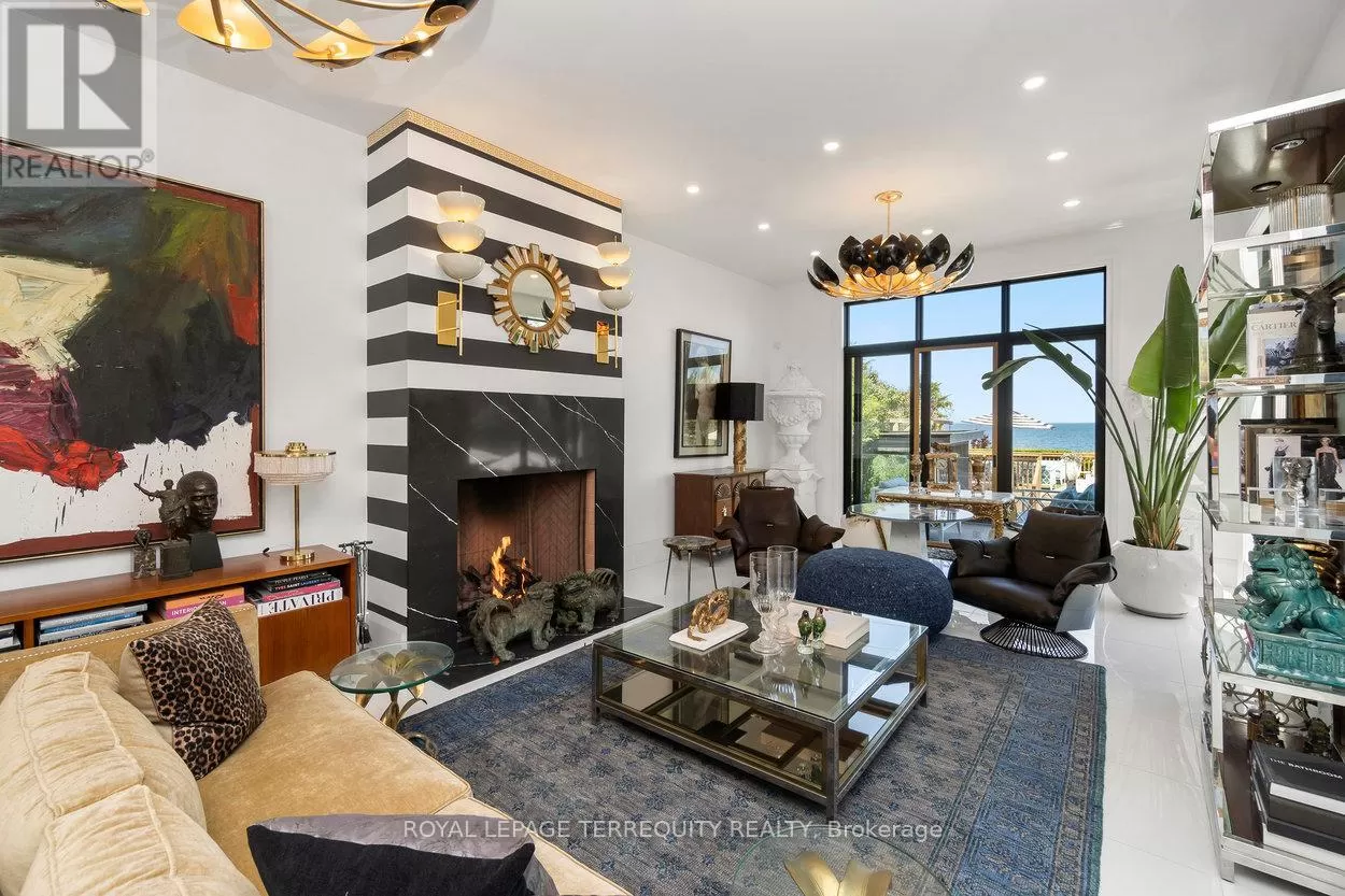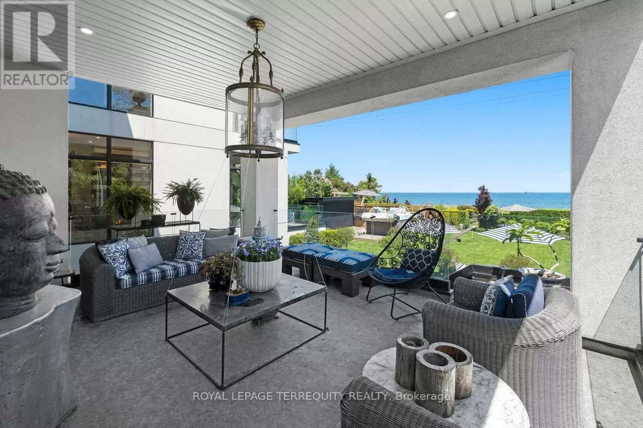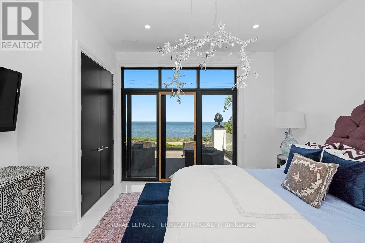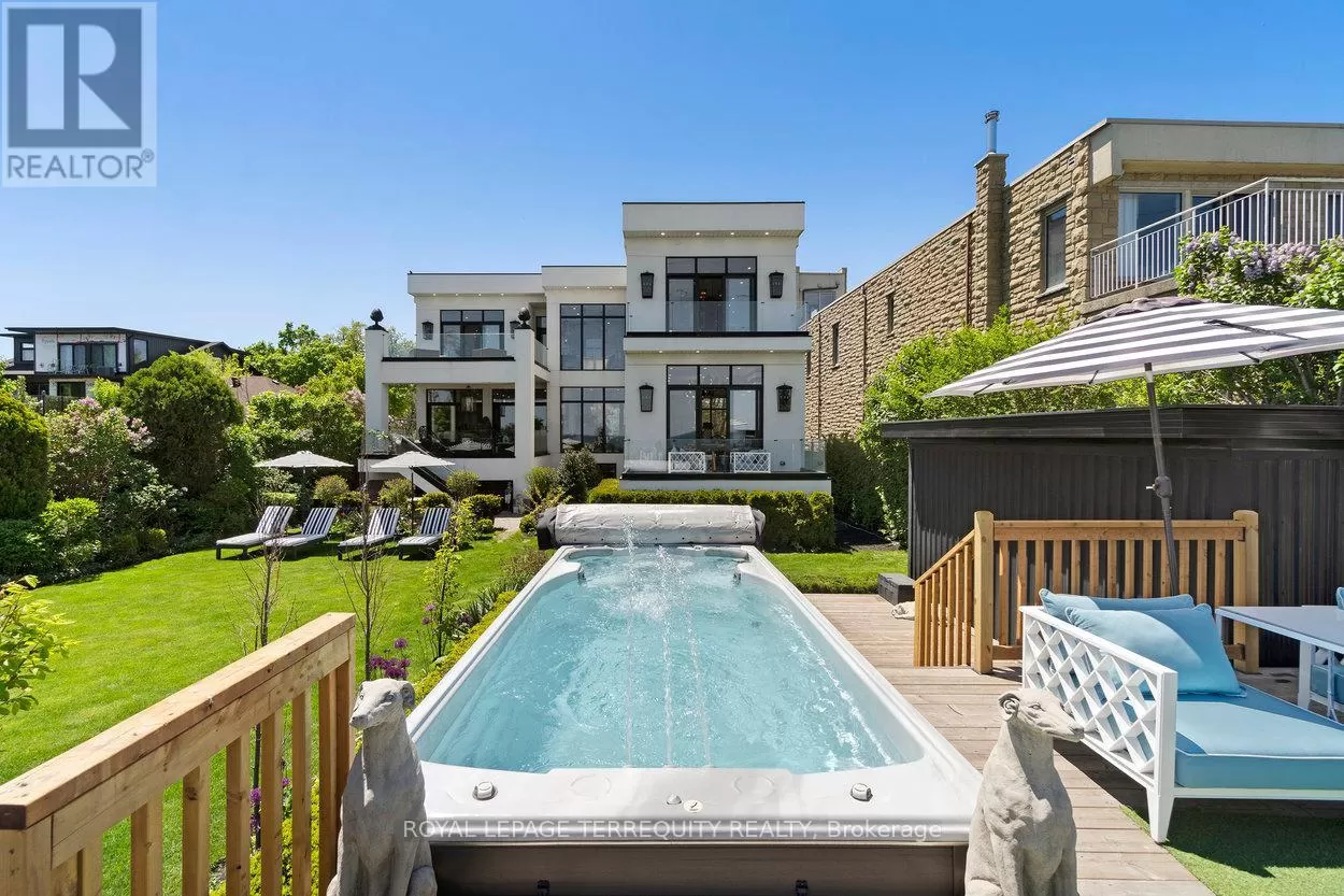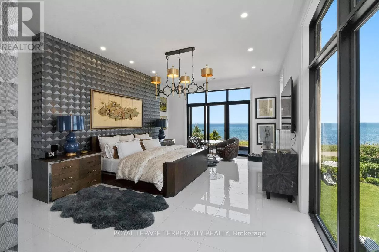 Eastport Drive and Beach Boulevard A rare offering on the shores of Lake Ontario, 711 Beach Blvd is a striking, custom-built residence completed in 2020, offering over 6,700 sq ft of total living space across three levels. Situated directly on the Waterfront Trail- 10 km of lakefront maintained by the City of Hamilton- this property boasts panoramic water views, total privacy, and direct access to the beach. With a 56' frontage that widens to 72' along the lakeside, and a professionally landscaped lot with multiple outdoor terraces, this is coastal living at its most refined. The home is a masterclass in design and craftsmanship, with 10' ceilings, Architectural Series Pella windows & doors, four Duradeck-covered terraces & an elegant stucco façade. Inside, high-end finishes abound: from custom millwork & Emtek marble hardware to Visual Comfort chandeliers, Swarovski accents & hand-cut marble inlays. The main floor is anchored by a dramatic two-storey foyer and a showstopping kitchen with commercial-grade appliances, grand Caesarstone island, built-in desk/office area & a bespoke bar & coffee room. The upper level features three bedrooms, each with an ensuite bath, including a luxurious primary retreat with a double-sided fireplace, lake views, and a spa-style bath with a huge gold soaker tub & an incredible double vanity. The lower level includes two additional bedrooms/offices, a large recreation/media room, a gym area & abundant storage. With a Jacuzzi swim spa, double garage with lift potential & outdoor parking for 5, this is a one-of-a-kind beachside sanctuary designed for elevated everyday living. (id:27476)