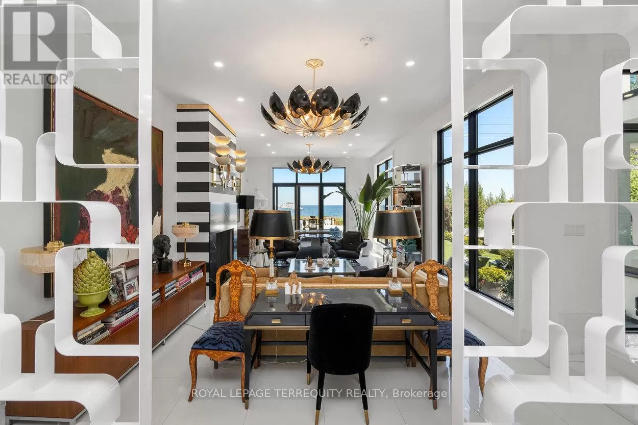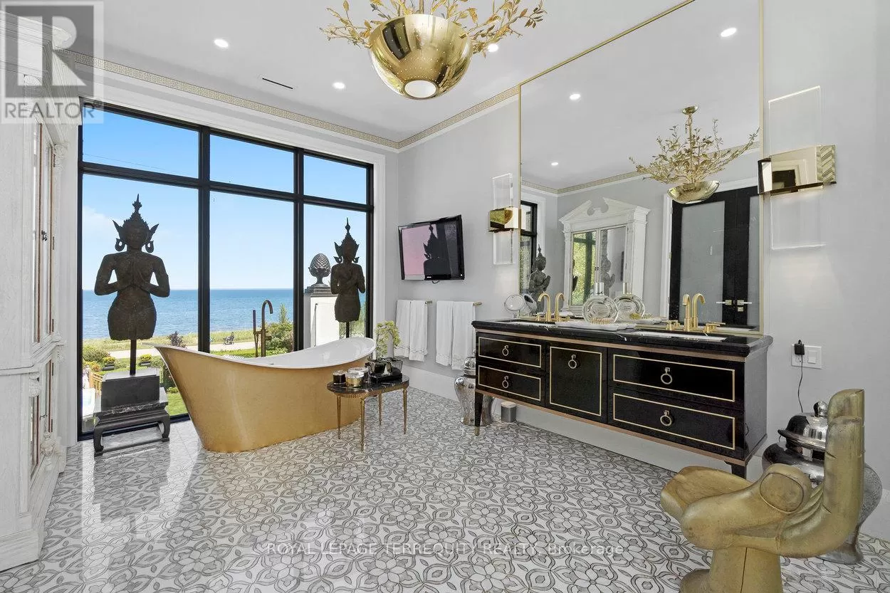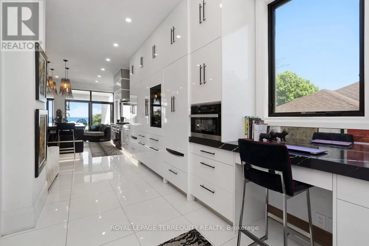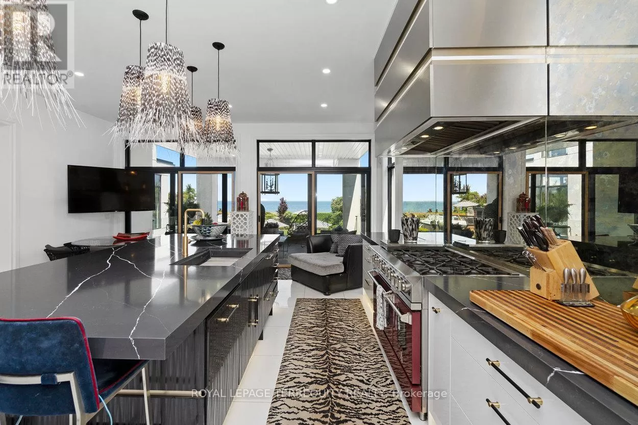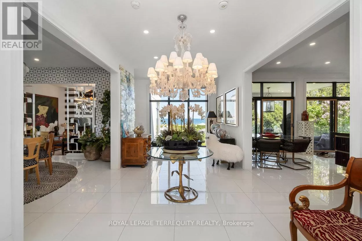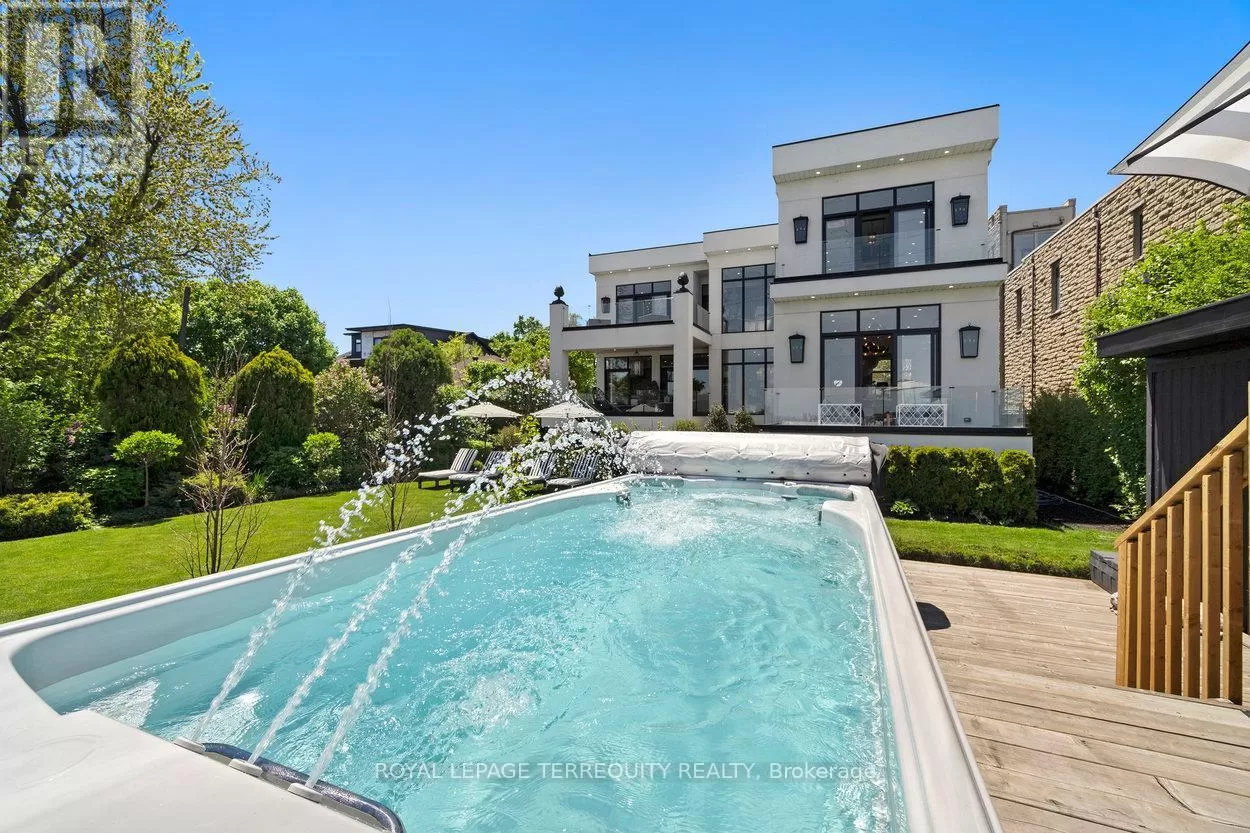 Eastport Drive and Beach Boulevard A rare offering on the shores of Lake Ontario, 711 Beach Blvd is a striking, custom-built residence completed in 2020, offering over 6,700 sq ft of total living space across three levels. Situated directly on the Waterfront Trail- 10 km of lakefront maintained by the City of Hamilton- this property boasts panoramic water views, total privacy, and direct access to the beach. With a 56' frontage that widens to 72' along the lakeside, and a professionally landscaped lot with multiple outdoor terraces, this is coastal living at its most refined. The home is a masterclass in design and craftsmanship, with 10' ceilings, Architectural Series Pella windows & doors, four Duradeck-covered terraces & an elegant stucco façade. Inside, high-end finishes abound: from custom millwork & Emtek marble hardware to Visual Comfort chandeliers, Swarovski accents & hand-cut marble inlays. The main floor is anchored by a dramatic two-storey foyer and a showstopping kitchen with commercial-grade appliances, grand Caesarstone island, built-in desk/office area & a bespoke bar & coffee room. The upper level features three bedrooms, each with an ensuite bath, including a luxurious primary retreat with a double-sided fireplace, lake views, and a spa-style bath with a huge gold soaker tub & an incredible double vanity. The lower level includes two additional bedrooms/offices, a large recreation/media room, a gym area & abundant storage. With a Jacuzzi swim spa, double garage with lift potential & outdoor parking for 5, this is a one-of-a-kind beachside sanctuary designed for elevated everyday living. (id:27476)