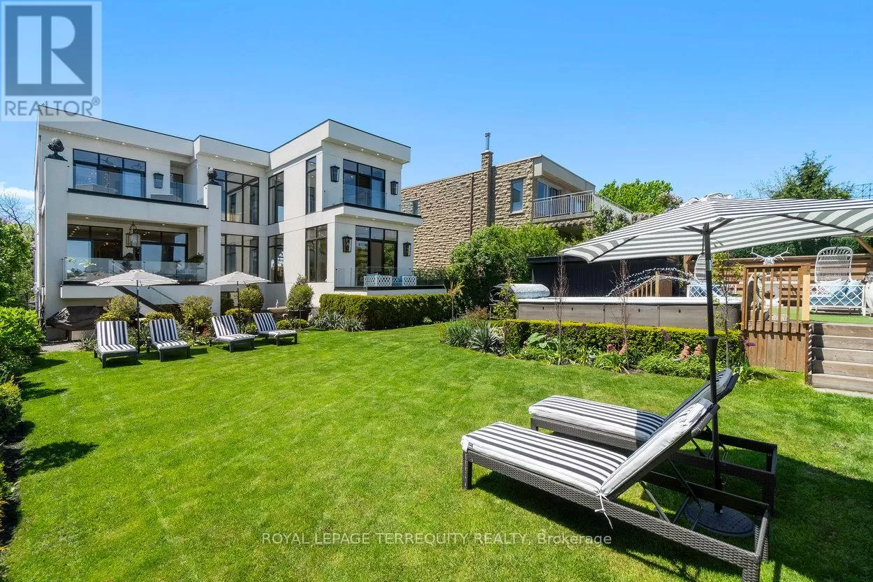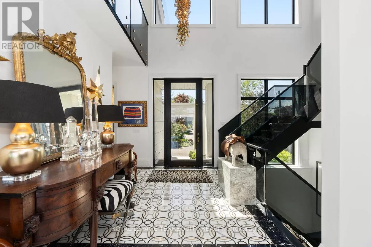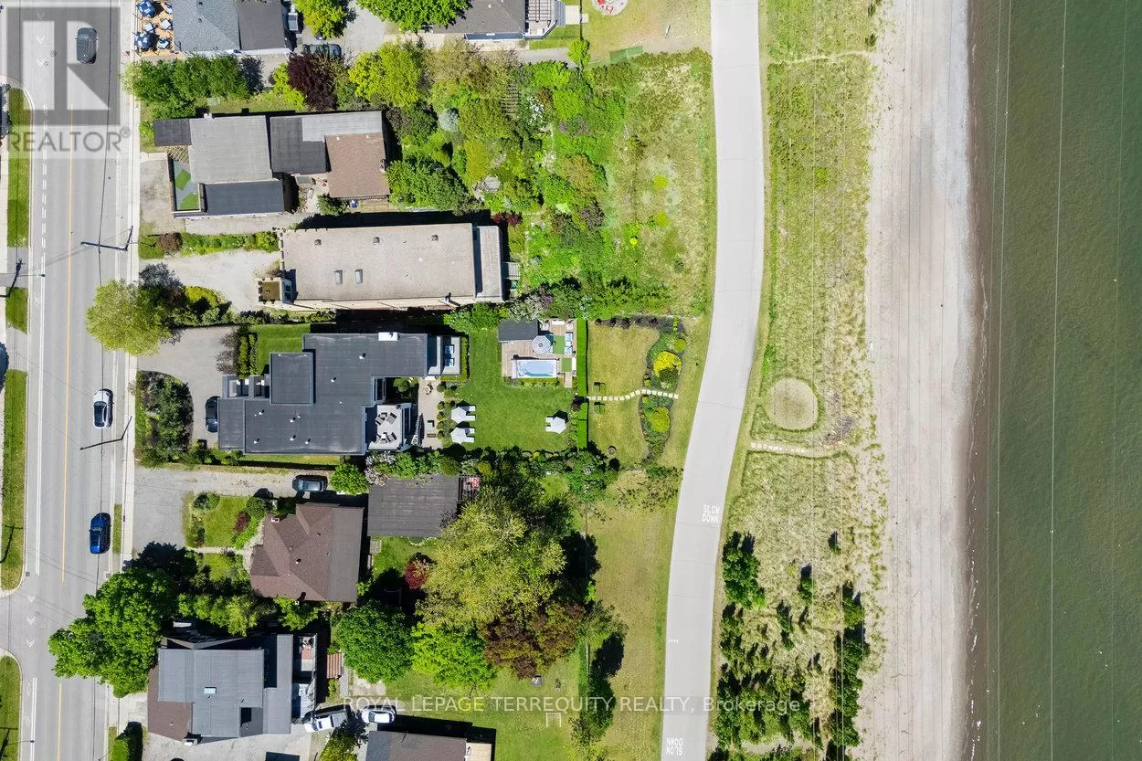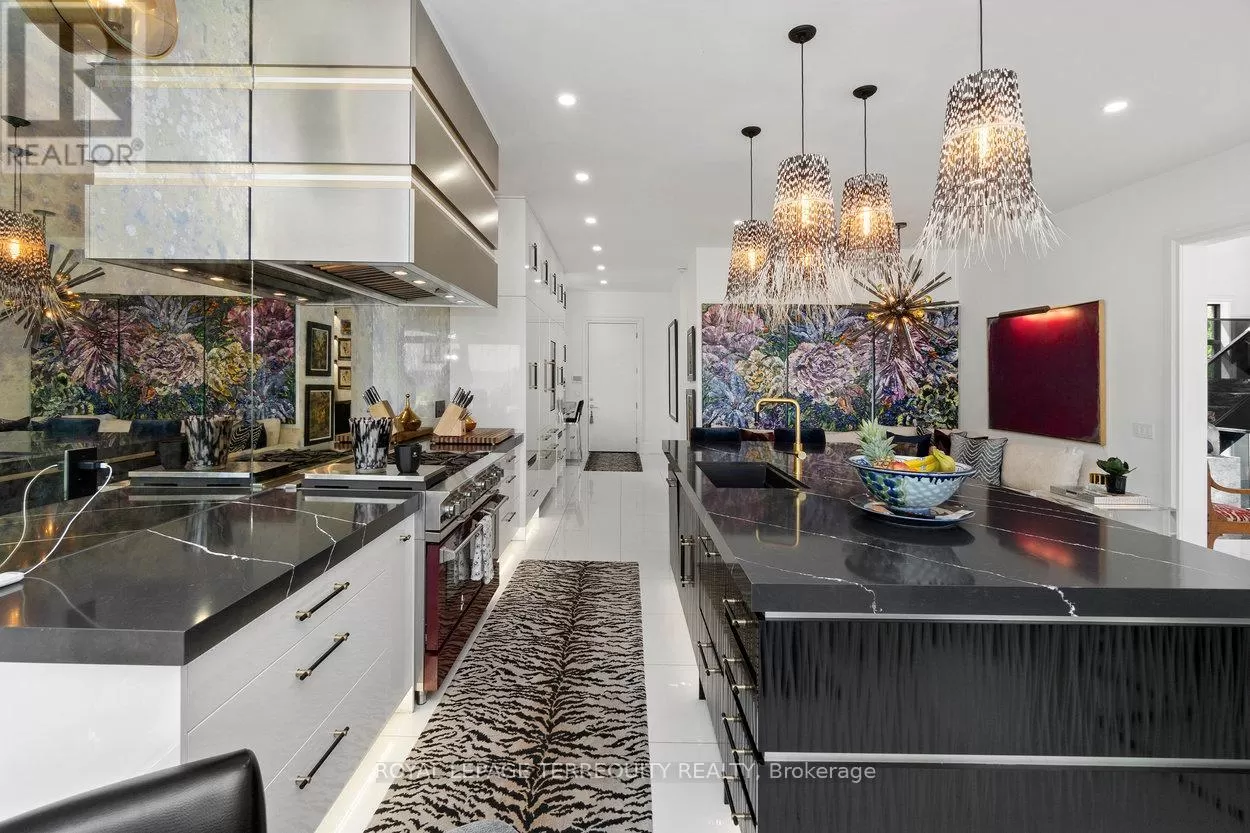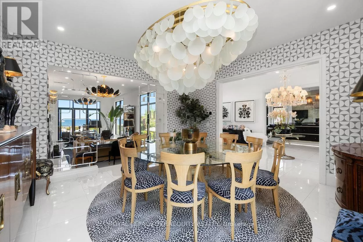 Eastport Drive and Beach Boulevard A rare offering on the shores of Lake Ontario, 711 Beach Blvd is a striking, custom-built residence completed in 2020, offering over 6,700 sq ft of total living space across three levels. Situated directly on the Waterfront Trail- 10 km of lakefront maintained by the City of Hamilton- this property boasts panoramic water views, total privacy, and direct access to the beach. With a 56' frontage that widens to 72' along the lakeside, and a professionally landscaped lot with multiple outdoor terraces, this is coastal living at its most refined. The home is a masterclass in design and craftsmanship, with 10' ceilings, Architectural Series Pella windows & doors, four Duradeck-covered terraces & an elegant stucco façade. Inside, high-end finishes abound: from custom millwork & Emtek marble hardware to Visual Comfort chandeliers, Swarovski accents & hand-cut marble inlays. The main floor is anchored by a dramatic two-storey foyer and a showstopping kitchen with commercial-grade appliances, grand Caesarstone island, built-in desk/office area & a bespoke bar & coffee room. The upper level features three bedrooms, each with an ensuite bath, including a luxurious primary retreat with a double-sided fireplace, lake views, and a spa-style bath with a huge gold soaker tub & an incredible double vanity. The lower level includes two additional bedrooms/offices, a large recreation/media room, a gym area & abundant storage. With a Jacuzzi swim spa, double garage with lift potential & outdoor parking for 5, this is a one-of-a-kind beachside sanctuary designed for elevated everyday living. (id:27476)