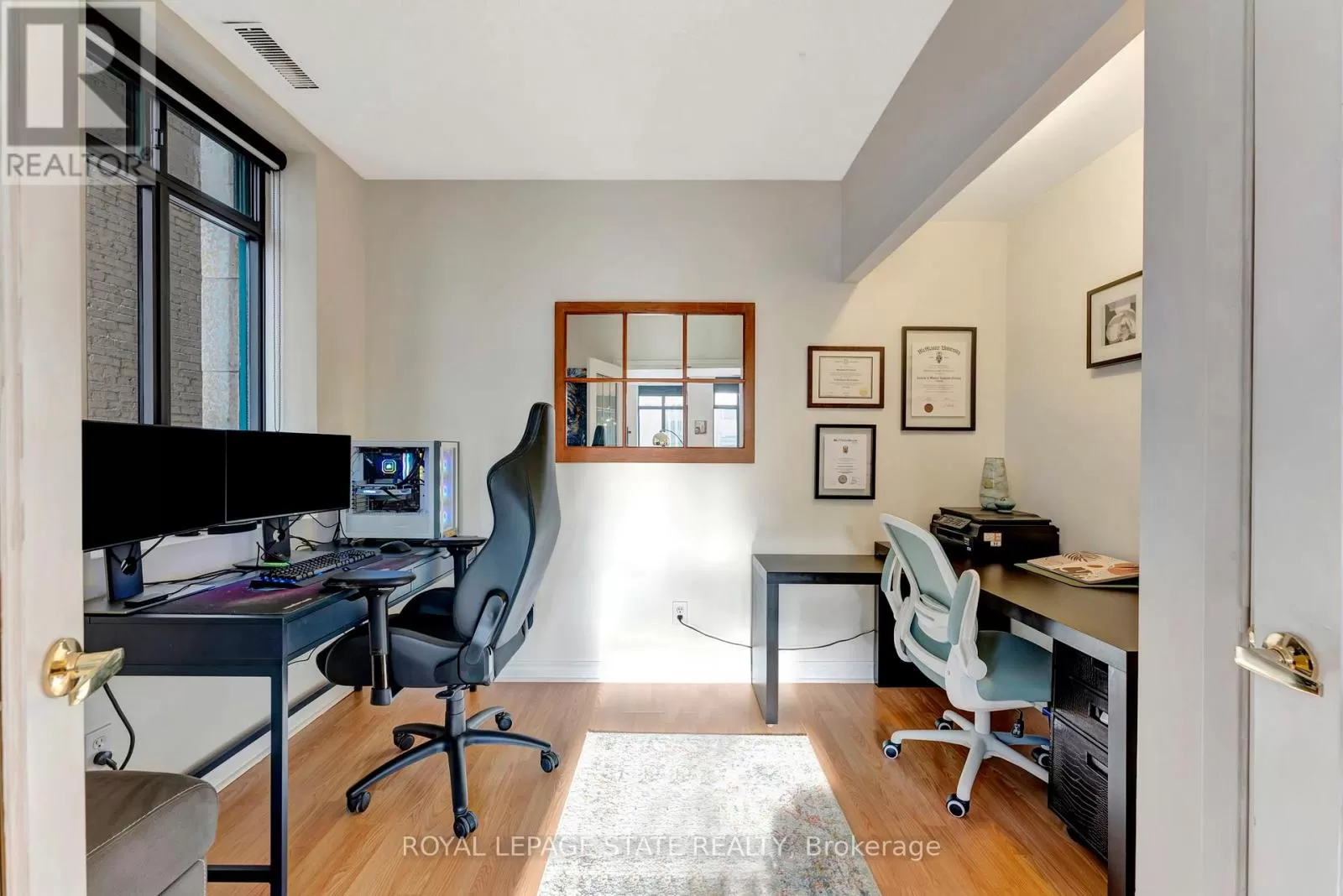 Cross Streets: Main St W. ** Directions: Main St. W. to James St. S. Step into a timeless piece of Hamilton's history at the prestigious Pigott Building (circa 1929), located in the heart of downtown at Main & James. This beautifully designed 2-bedroom condo (converted to 1+ den) provides a seamless blend of old-world charm and contemporary style, making it ideal for professionals, creatives, and urban lifestyle seekers. Upon entry, the sun-filled living space greets you with stunning city and escarpment views, accentuated by large windows that bathe the home in natural light. The open concept living, dinning, and kitchen area features a modern, neutral palette, stainless steel appliances, and a convenient breakfast bar, perfect for casual dinning or entertaining. The spacious primary bedroom provides comfort and privacy, while the versatile den/home office grants flexibility for remote work or creative use. A 4-piece bath, in-suite laundry (with a stylish barn door enclosure), and ample storage complete the thoughtfully designed interior. Building amenities include a party room with billiards, a well-equipped gym, and secure underground parking with a private storage locker. With a Walk Score of 98., you are mere steps from GO Transit, major bus routes, the Hamilton Farmers' Market, shopping, and a dynamic selection of restaurants, cafes, and entertainment venues. Don't miss this opportunity to own a piece of Hamilton's history while enjoying the convenience of modern urban living. (id:27476)