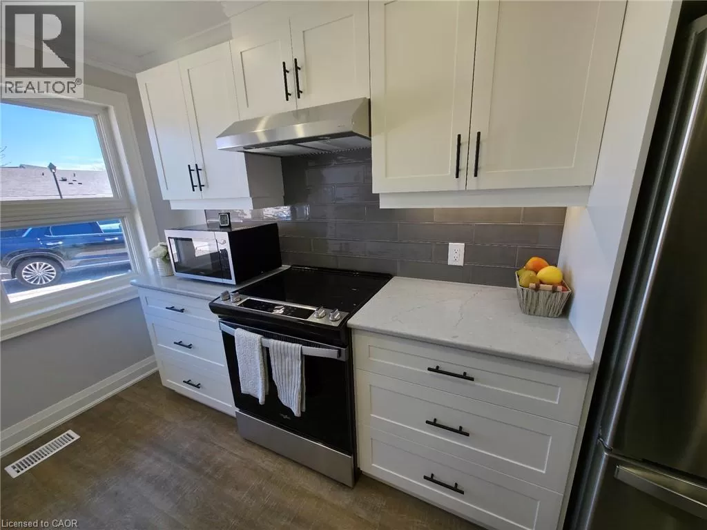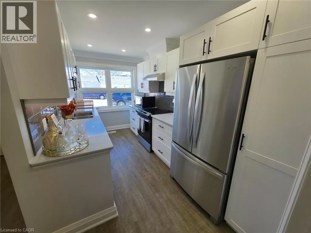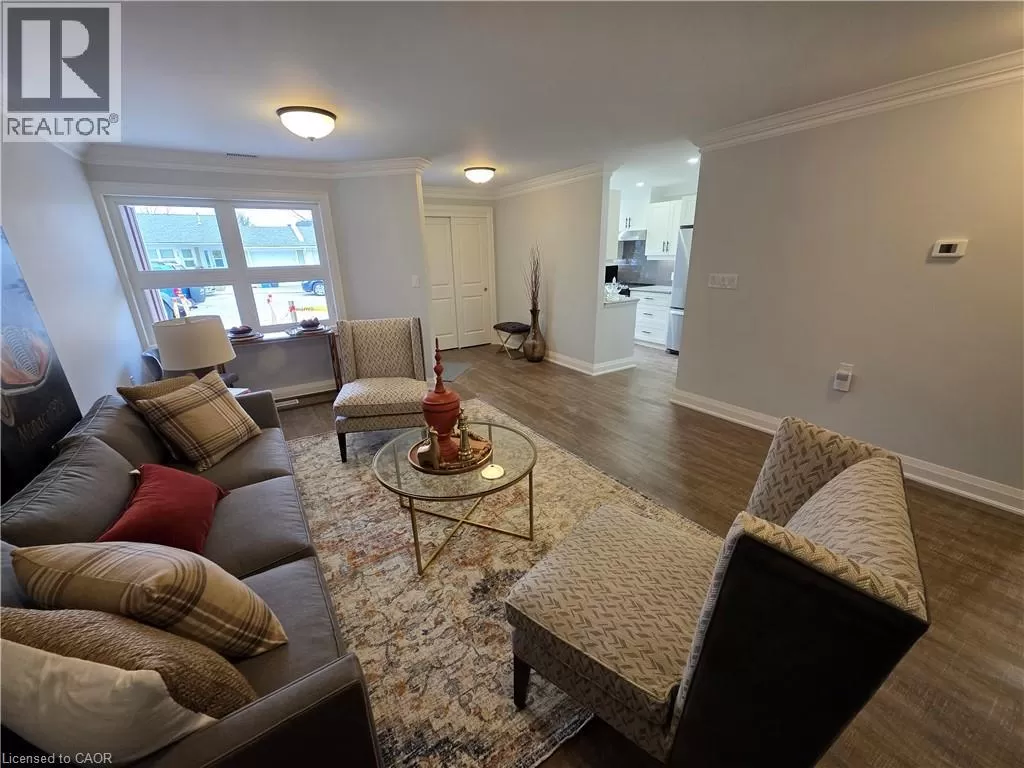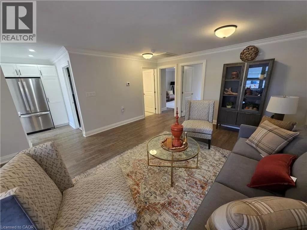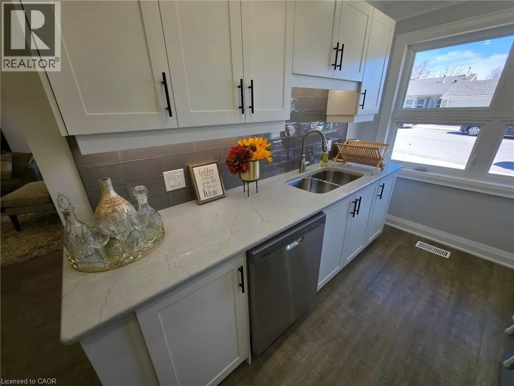 Linc, to Garth Street. South East Corner of Garth Street & Rymal Road West Introducing a stunning 2-Bedroom, 1-Bathroom Bungalow in the highly sought-after gated 55+ community of St. Elizabeth Village. This home offers the perfect blend of modern style and comfort, featuring brand new finishes throughout. Step into a bright, airy space with white shaker cabinets, sleek quartz countertops, and luxury vinyl flooring that flows seamlessly through the home. The Kitchen is a chefâs dream, equipped with all-new, never-used appliances, and the Bathroom is a true retreat with a walk-in shower surrounded by elegant tile. New lighting fixtures add a contemporary touch, creating a warm and inviting atmosphere. Designed with both convenience and luxury in mind, this home is perfect for those looking for a quick closing. Whether youâre downsizing or simply seeking a low-maintenance lifestyle, this Bungalow is ready for you to move in and start enjoying. CONDO Fees Incl: Property taxes, water, and all exterior maintenance. Located close to the Village's amenitiesâincluding an indoor heated pool, golf simulator, saunas, and gymâyouâll have everything you need right at your doorstep. Donât miss out on this opportunity to own a brand new, modern home in a vibrant and secure community. (id:27476)