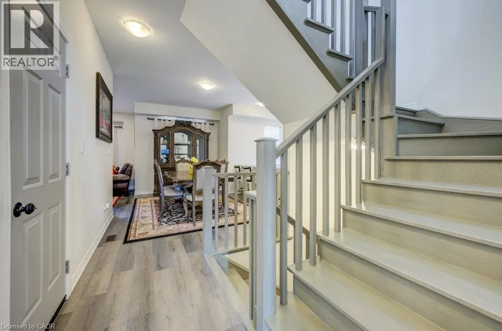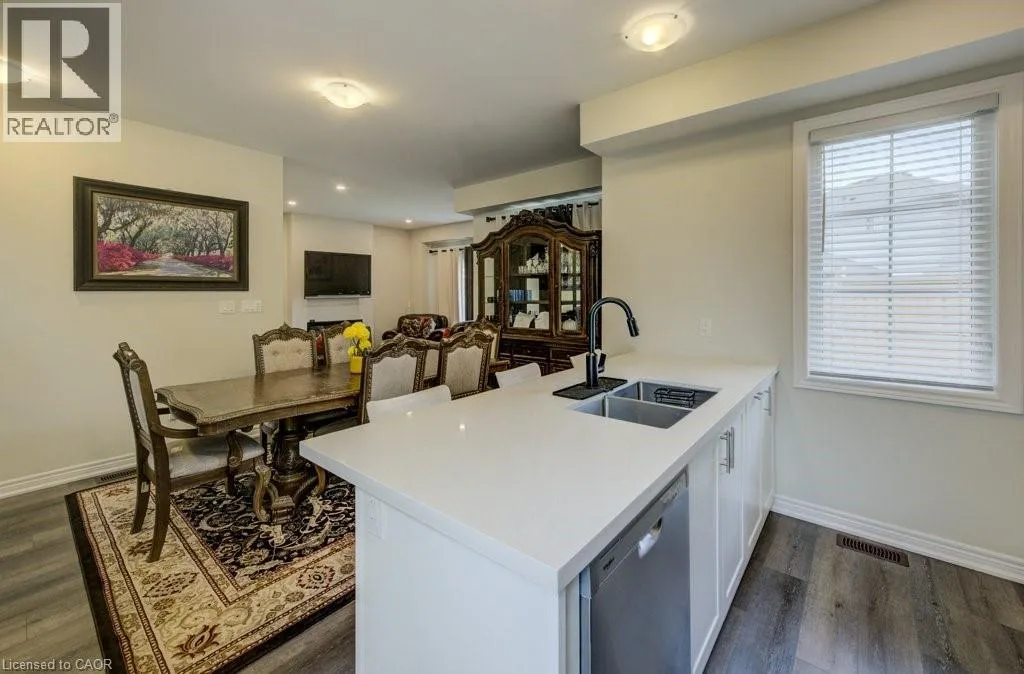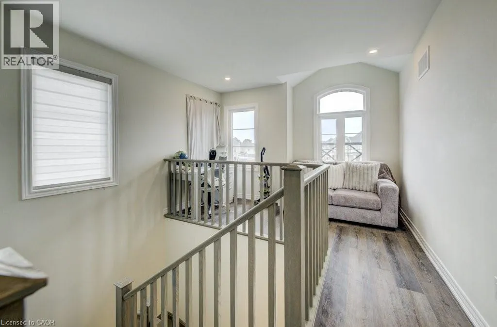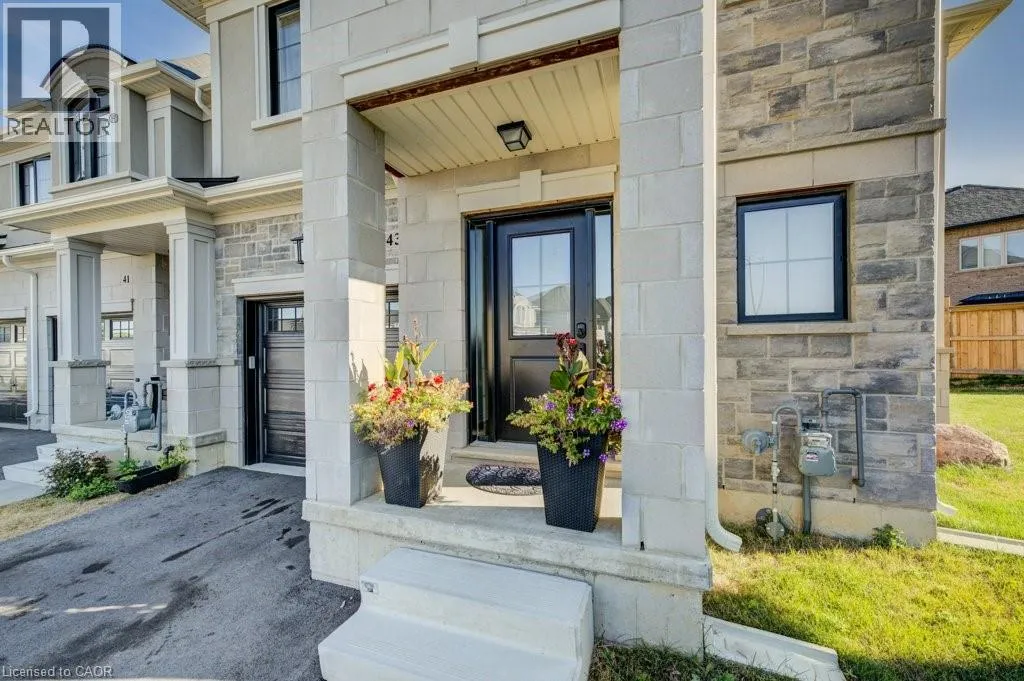 Upper James St to Regina Dr to DiCenzo Dr to 43 Genoa Dr OR from Stone Church Rd E, South on DiCenzo Dr., East on Genoa Dr to 43 Genoa Dr Beautiful end unit freehold townhome, new in 2024, NO condo fees. Custom townhome on extra large pie shape lot in Stonegate Community. Features magnificent stone and stucco architecture with beautiful front elevation with covered porch and faux balcony. Interior features soaring 9 foot ceilings on main level. Custom end unit floor plan with extra windows and bump out on all 3 levels for extra square footage made possible by wide and private pie shape lot. Open concept kitchen, large living room, chef's kitchen with cabints made wider and deeper for larger fridge, taller uppers cabinets, lower pots & pans drawers, peninsula with breakfast bar, Quorastone quartz countertops. This home is carpet free with beauiful and durable,modern vinyl plank floors. Bright upper level features 3 spacious bedrooms with larger windows, including primary bedroom with ensuite bath, walk-in closet plus bonus loft/office area. New owners get balance of Ontario New Home Warranty. Large basement with endless possibilites including rough-in extra bathroom plumbing and energy efficient features. Don't miss this fantastic home. (id:27476)