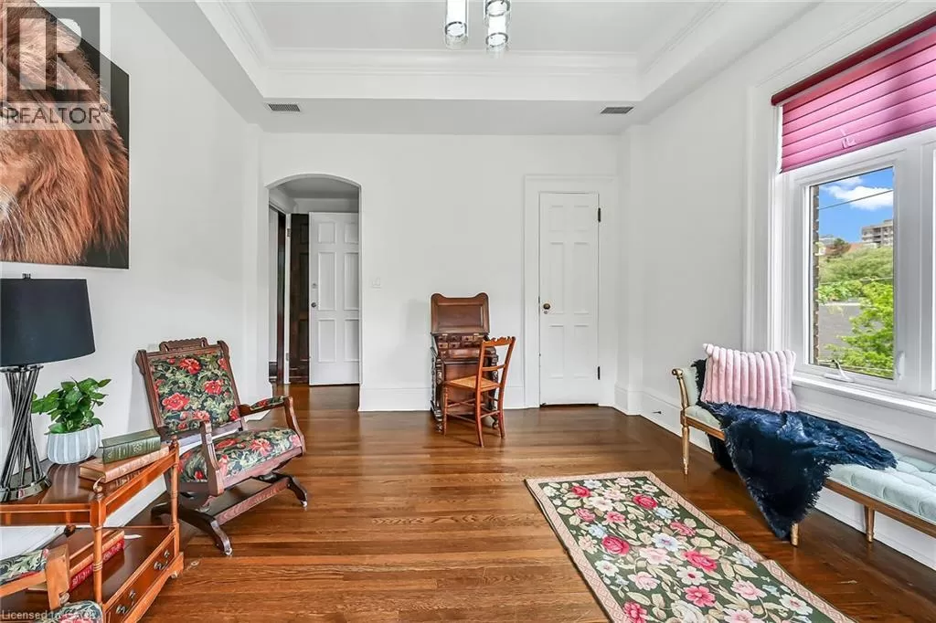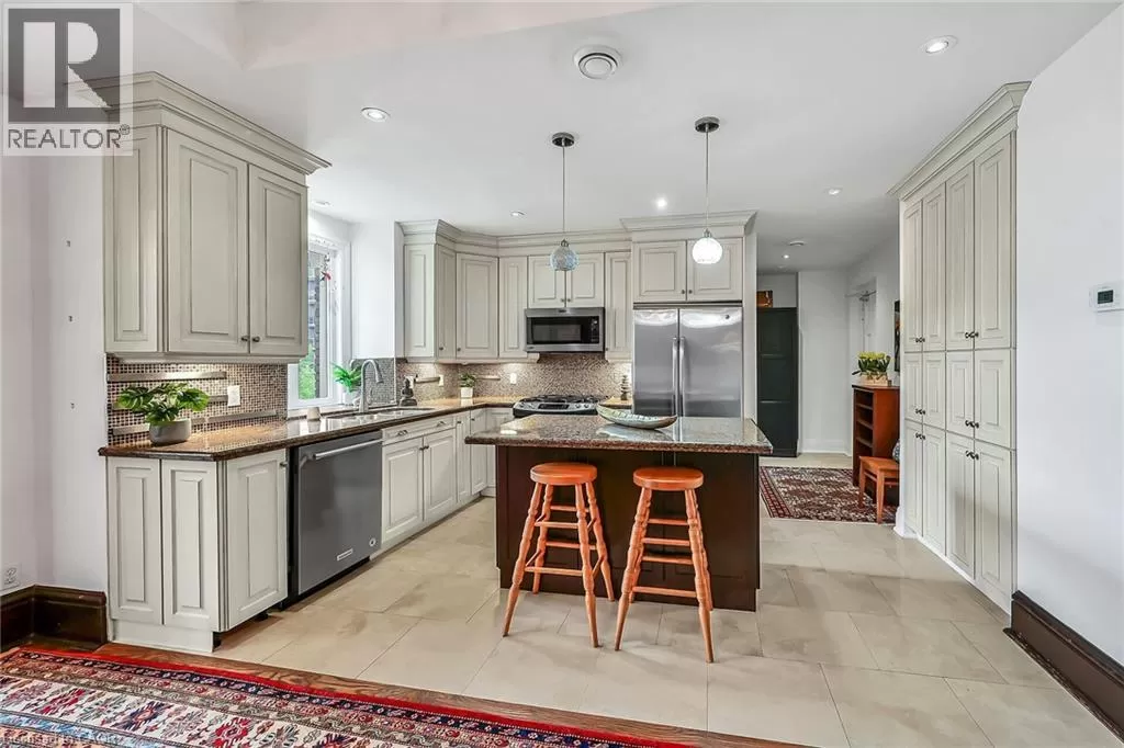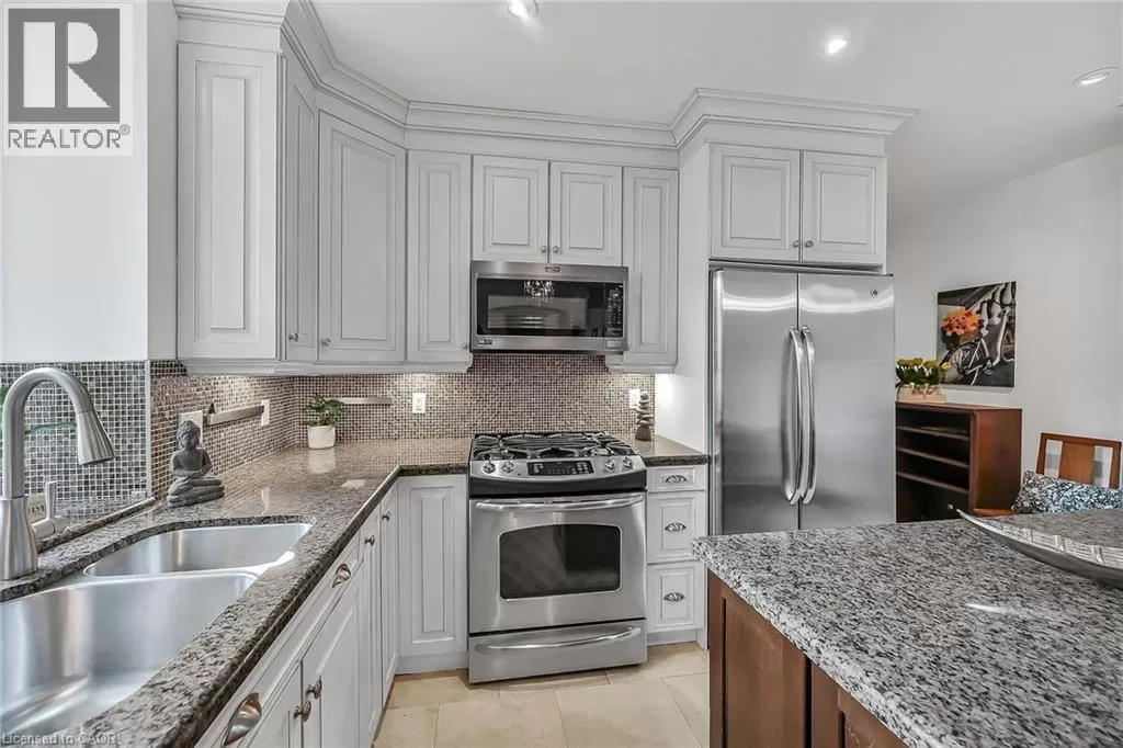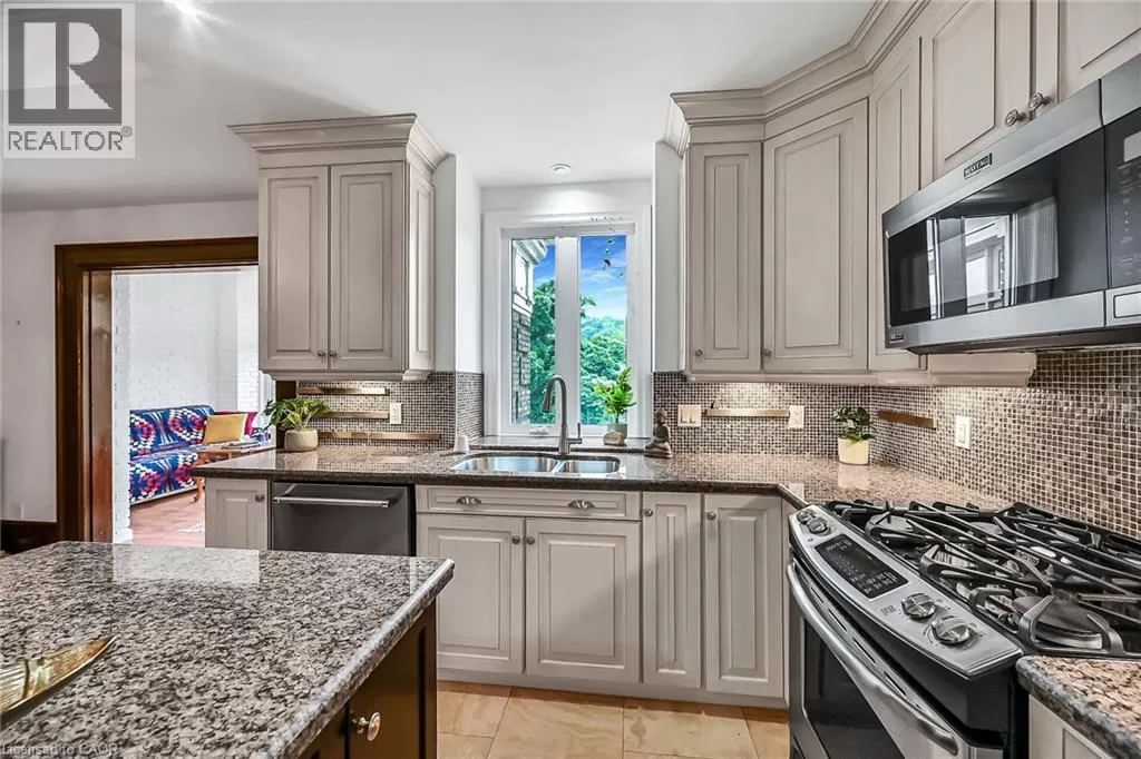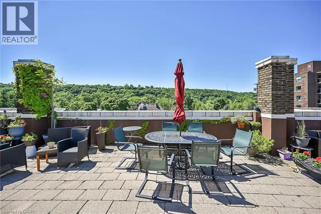 Aberdeen to Queen. Right on Herkimer Rare Find! Welcome to this timeless penthouse in the Historic Herkimer Apartments! Located in the heart of Hamiltonâs prestigious Durand neighbourhood, this spectacular 2-bedroom, 1.5-bathroom condo blends historic elegance with modern convenience. This penthouse unit features inlaid hardwood floors, coffered 10' ceilings, crown mouldings, pot lights, and a gas fireplace in the living room with built-in cabinetry.. The open-concept kitchen boasts granite counters, an island with breakfast bar, and abundant cabinetry. Enjoy the 3 piece jacuzzi shower, in-suite laundry, and two separate entrances for added flexibility. Relax in the sunroom with breathtaking views of the Niagara Escarpment, through oversized windows, or entertain on the rooftop deck and terrace available to residents. Including in the terrace breathtaking city views, are sitting areas, gas bbq and gas fire table under a large gazebo. For added peace of mind, the in unit Furnace and Air-conditioning has been replaced in November 2025. Includes garage parking, two lockers, and all the charm of a historic building with the modern lifestyle of today. Donât miss this rare opportunity to own a piece of architectural history in one of Hamiltonâs finest neighbourhoods! RSA (id:27476)