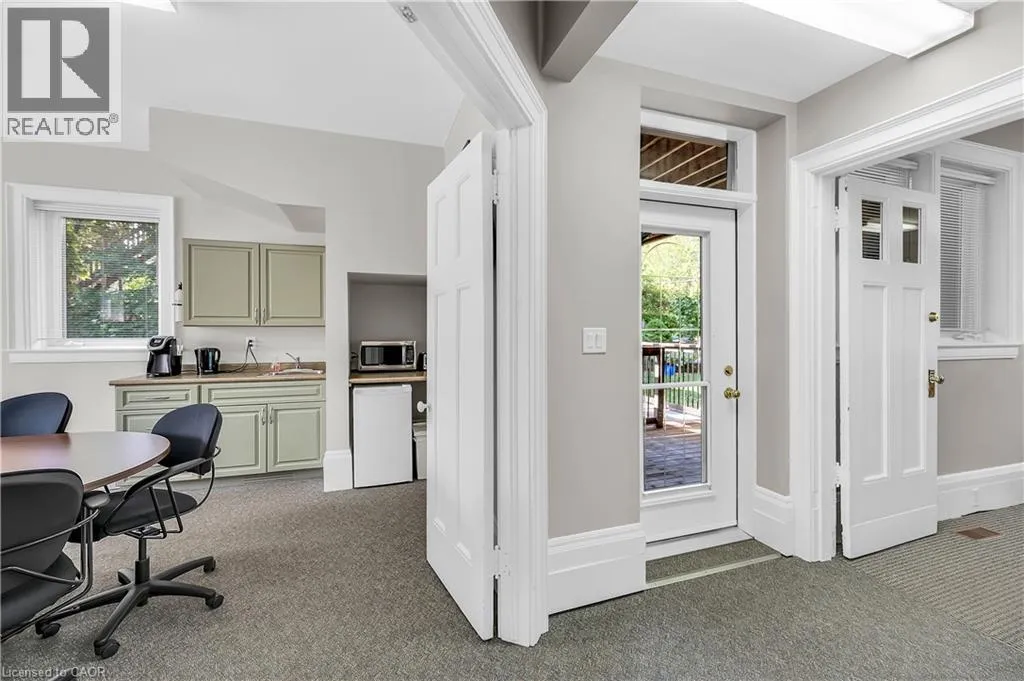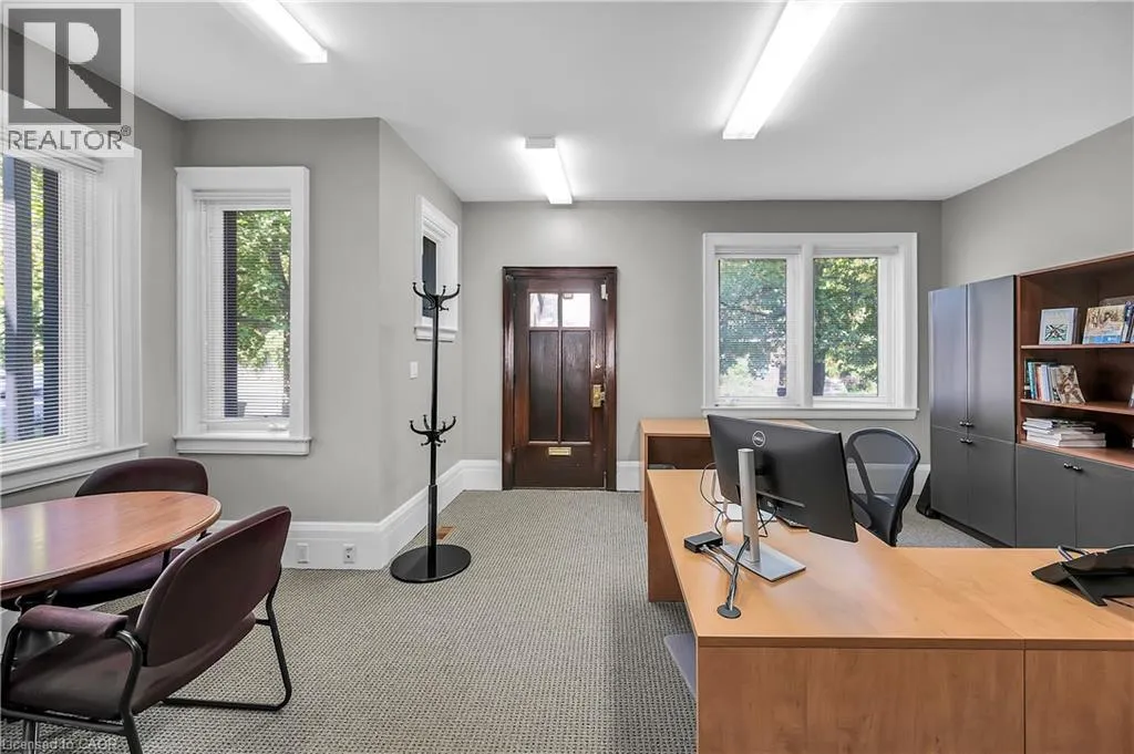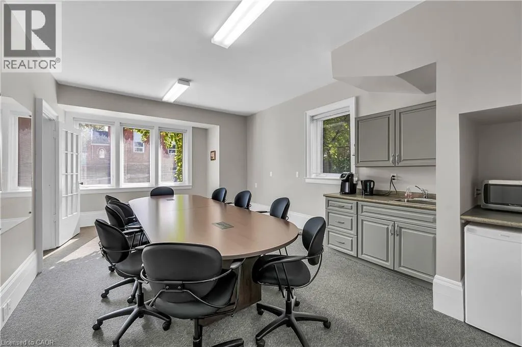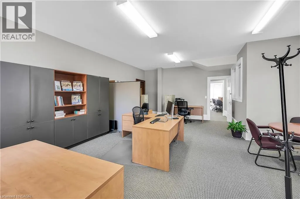 CORNER OF QUEEN STREET Fully turn-key office space in Hamiltonâs desirable Durand neighbourhood with historic character and modern functionality. This bright and spacious ground-floor unit boasts 1,218 square feet with high ceilings, updated finishes, and an inviting layout that includes large private offices, a dedicated boardroom, a kitchenette, and two bathrooms. The unit has private access from Queen Street South as well as from the rear parking lot. Thereâs also access to a private outdoor deck. With easy access to downtown Hamilton, Hwy 403, and public transit, this location offers exceptional convenience and accessibility. The gross lease includes natural gas, property taxes, building insurance, property maintenance, and up to three on-site parking spaces, providing simplicity and cost certainty. Hydro and water are separately metered. Ideal for professional offices in a vibrant, well-connected location. (id:27476)