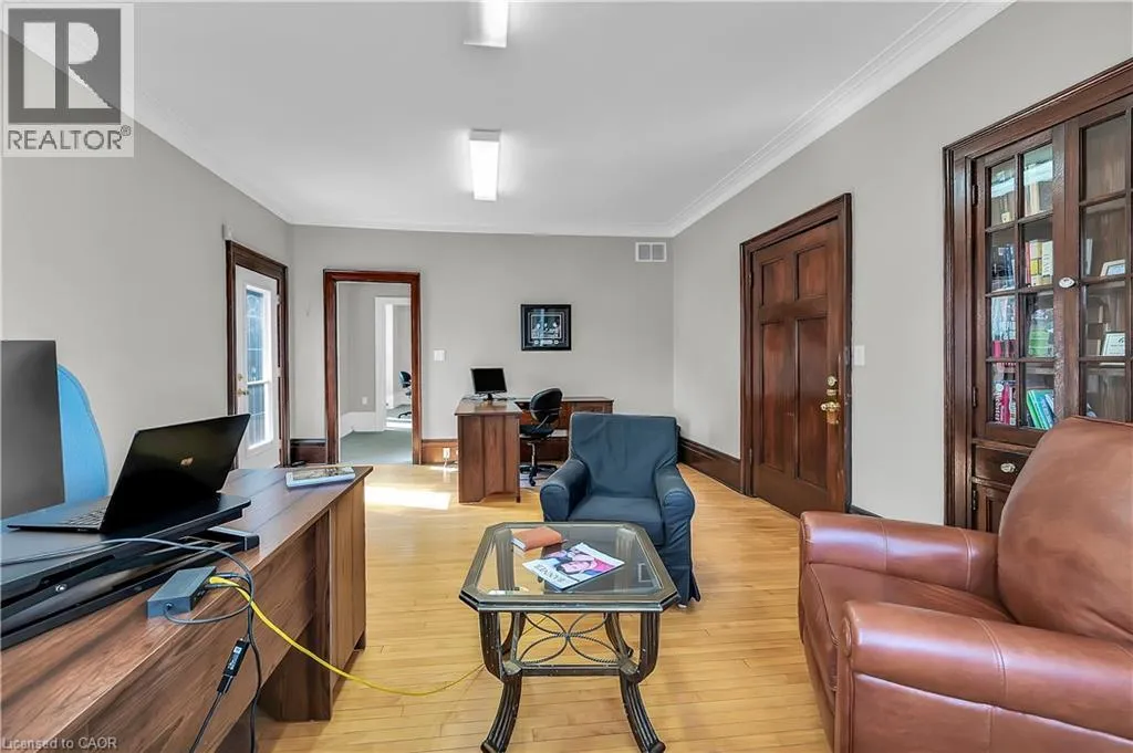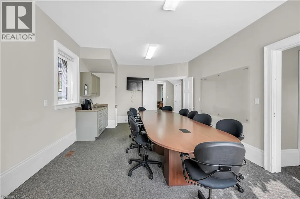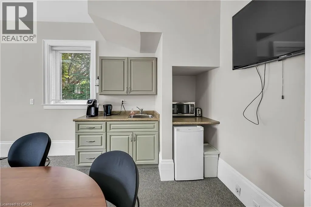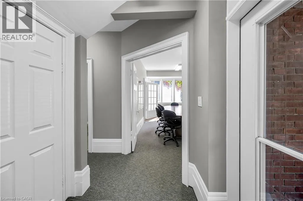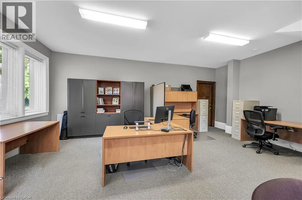 CORNER OF QUEEN STREET Fully turn-key office space in Hamiltonâs desirable Durand neighbourhood with historic character and modern functionality. This bright and spacious ground-floor unit boasts 1,218 square feet with high ceilings, updated finishes, and an inviting layout that includes large private offices, a dedicated boardroom, a kitchenette, and two bathrooms. The unit has private access from Queen Street South as well as from the rear parking lot. Thereâs also access to a private outdoor deck. With easy access to downtown Hamilton, Hwy 403, and public transit, this location offers exceptional convenience and accessibility. The gross lease includes natural gas, property taxes, building insurance, property maintenance, and up to three on-site parking spaces, providing simplicity and cost certainty. Hydro and water are separately metered. Ideal for professional offices in a vibrant, well-connected location. (id:27476)