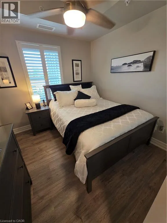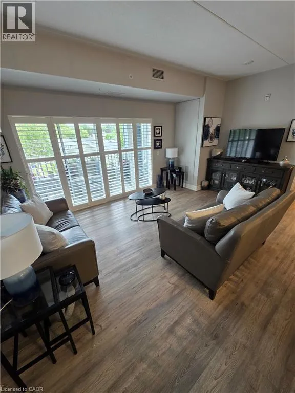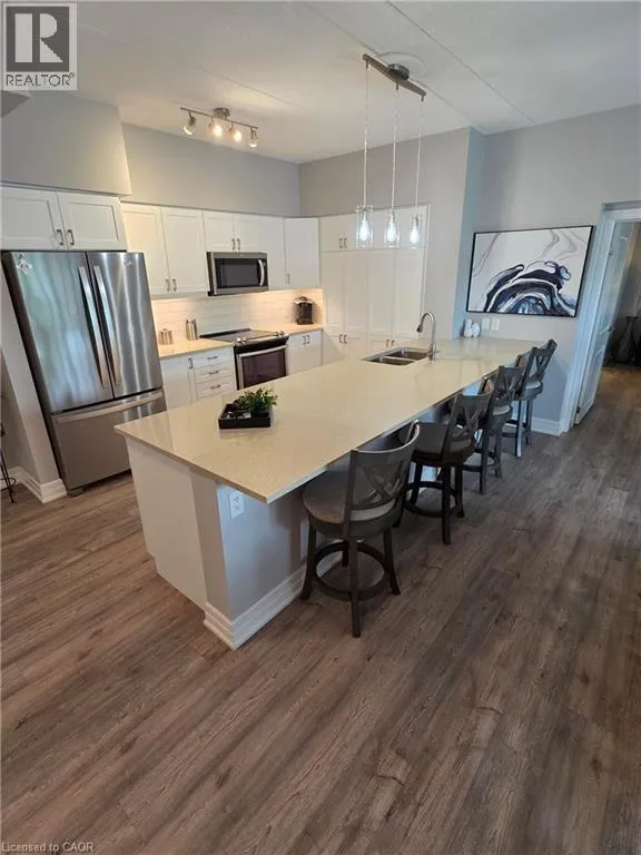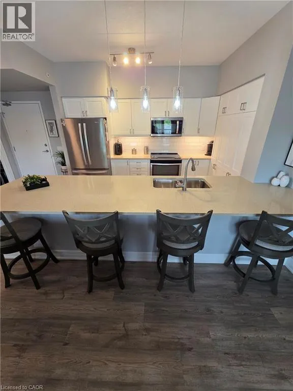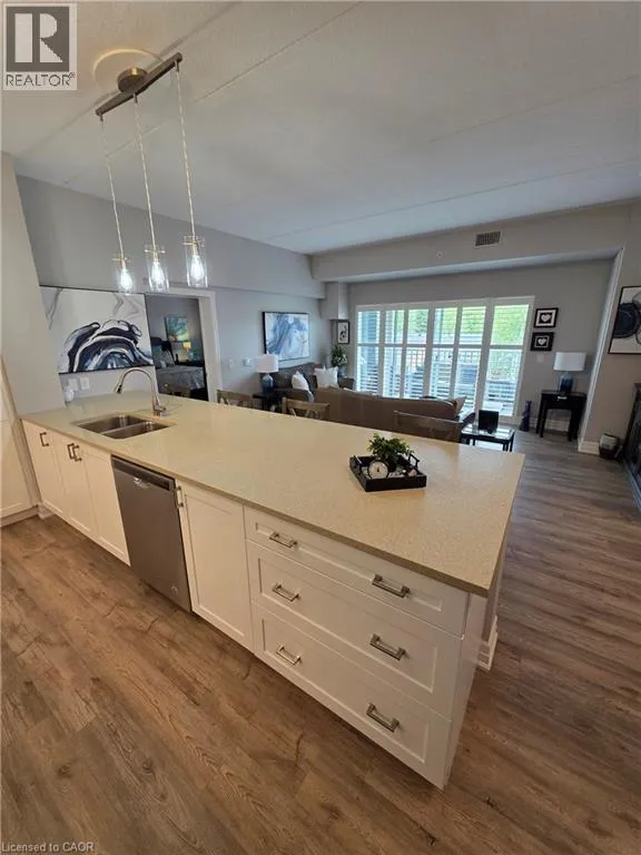 South East corner of Garth Street & Rymal Road West Welcome to the sought-after Upper Mill Pond apartments in St. Elizabeth Village, a gated 55+ community offering a vibrant lifestyle and modern conveniences. This spacious 1,115 square foot home features open concept living with 9 foot ceilings, an inviting layout designed for comfort and ease, and over 200sqft of outdoor space on the terrace. The kitchen is the heart of the home, with a large peninsula that provides seating for five and opens seamlessly to the bright living and dining areas, perfect for entertaining or everyday living. The home offers two bedrooms and two full bathrooms. The primary suite is a true retreat with its own ensuite complete with a walk-in shower and an exceptionally large walk-in closet. The second bedroom is ideal for guests or as a flexible space for hobbies or a home office. A north-facing balcony extends your living space outdoors and features upgraded flooring, making it a perfect spot to relax and enjoy the fresh air. Residents of this building enjoy direct access to exceptional amenities including a heated indoor pool, gym, saunas, hot tub, and golf simulator. Just steps away, the Village provides a doctors office, pharmacy, massage clinic, and public transportation, along with many other services designed to support convenience and wellness. Beyond the gates, you are only a five minute drive to grocery stores, shopping, and restaurants, ensuring everything you need is close at hand. This home combines modern living with a welcoming community atmosphere, making it a wonderful opportunity to enjoy all that St. Elizabeth Village has to offer. (id:27476)