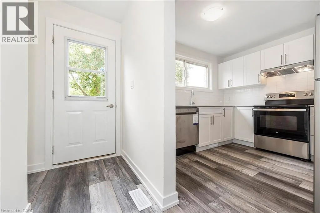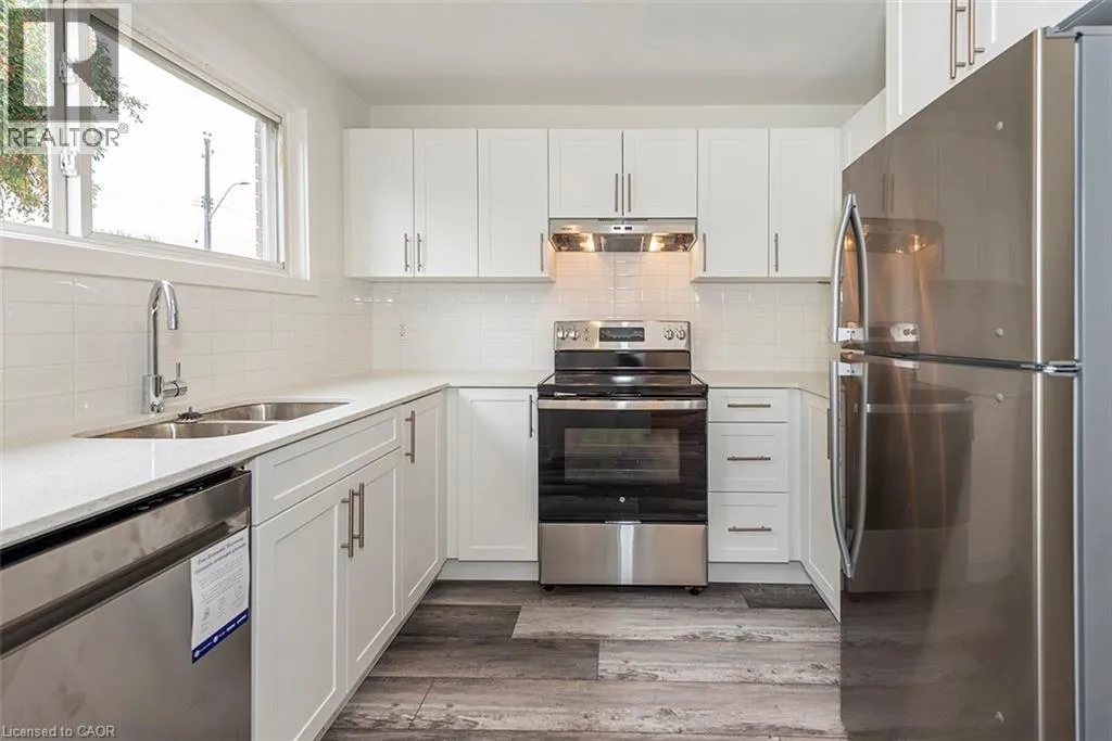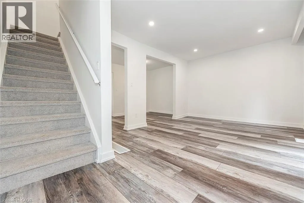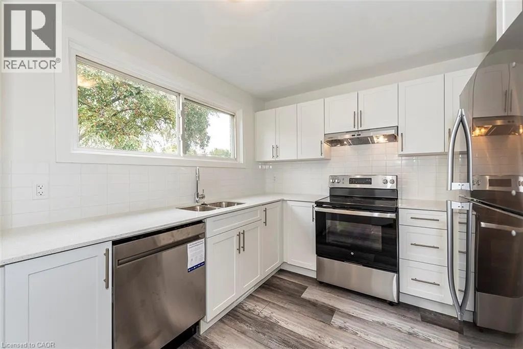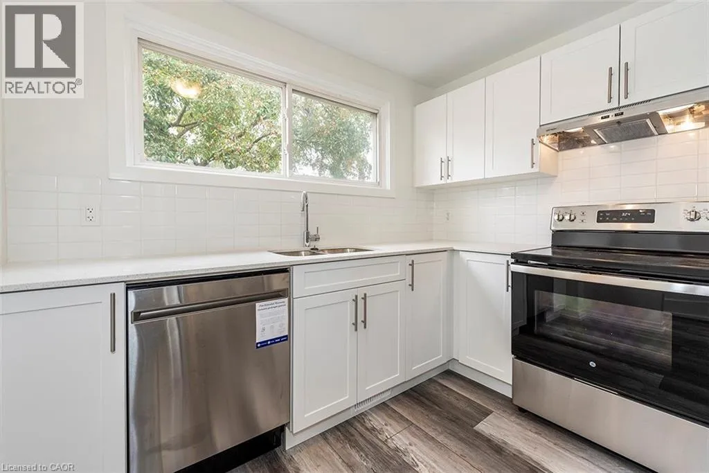 Queenston Road to Woodman Dr. N This beautifully renovated townhome is the perfect place to start your home ownership journey! Located in a family-friendly neighborhood, this gem offers a convenient lifestyle with easy access to highways, shopping, schools, and public transit. Step inside and fall in love with the brand-new eat-in kitchen, featuring stunning quartz countertops with breakfast bar and stainless steel appliances. The main floor boasts wide plank vinyl flooring throughout. The bright and inviting living room, complete with recessed pot lights, opens directly to the backyard. Upstairs, you'll find three spacious bedrooms with large closets, and a stylish 4-piece bathroom. The unfinished basement offers laundry facilities and plenty of potential for you to customize the space to suit your lifestyle-whether it's a home office, workout room, or extra living area. This townhome also comes with the convenience of one assigned surface parking spot. Don't miss out on this incredible opportunity to own a modern, low-maintenance home! ** Some listing photos are virtually staged. (id:27476)