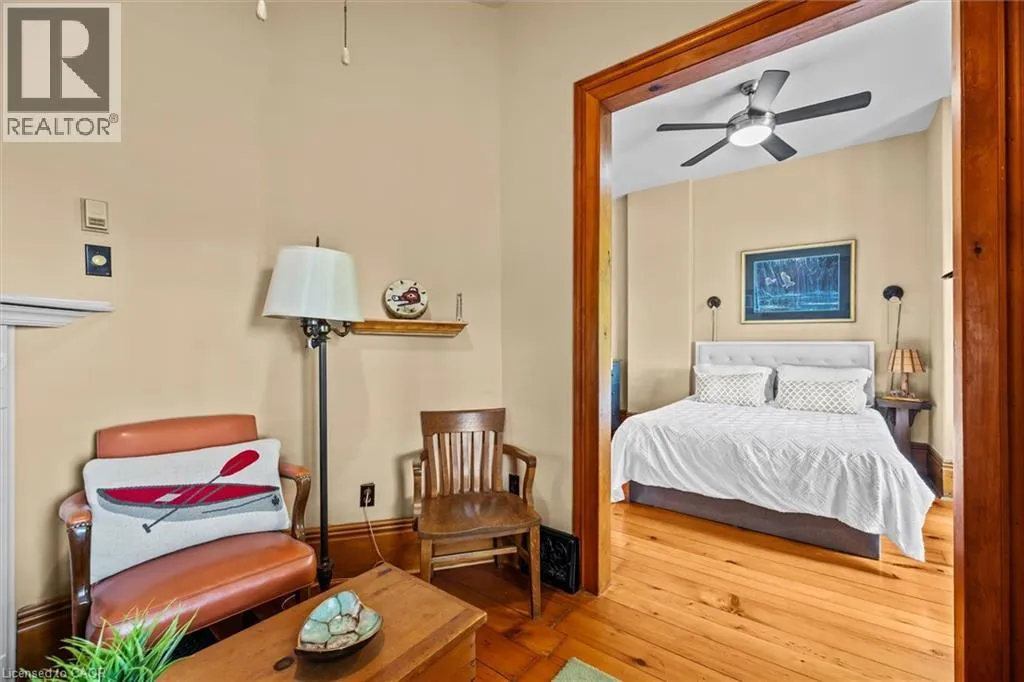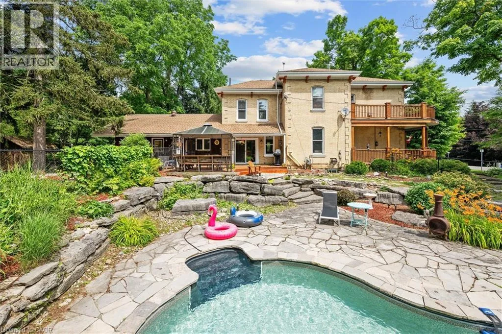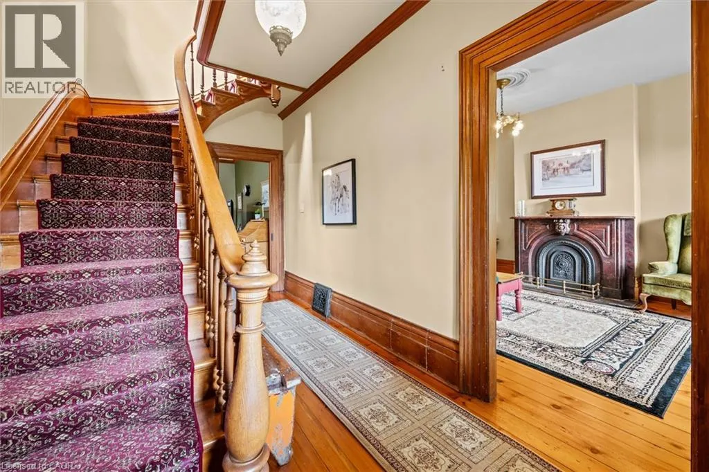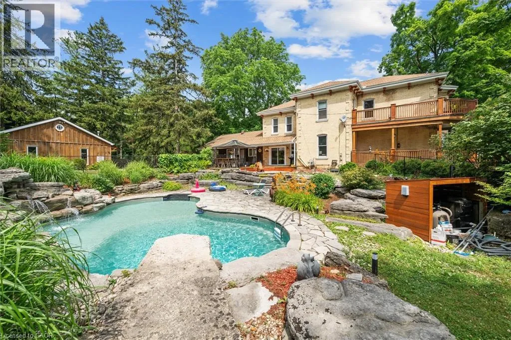 HWY 52; WEST ON JERSEYVILLE, NORTH ON FIELD Some homes catch your eye, this one captures your heart. Welcome to 34 Field Road in historic Jerseyville. A stunning 1870s Victorian where timeless character meets modern comfort featuring 10 ceilings, crown moulding, natural wood trim, and original pine plank floors. This 3-bedroom, 2-bath beauty offers over 2,600 sq ft of living space with a bright country kitchen, breakfast bar and a private backyard oasis with a saltwater pool, waterfall, flagstone patio, and wraparound decks on two levels. Inside, enjoy elegant living with a dining room separated by original bi-fold doors (the dining space currently doubles as a cozy pub ), a versatile family room, and a spacious mudroom/office with main-floor laundry. Upstairs, there are 2 sets of stairs (cool) with a primary suite that is a true retreat complete with gas fireplace, sitting area, walk-in closet, and private balcony. Bonus: heated 2-car garage/workshop and parking for 7+. Book a showing to fully appreciate this 0.5 ac property ready to welcome its next owner. (id:27476)