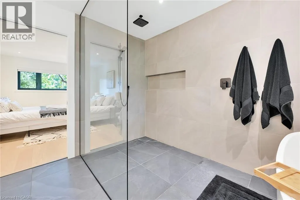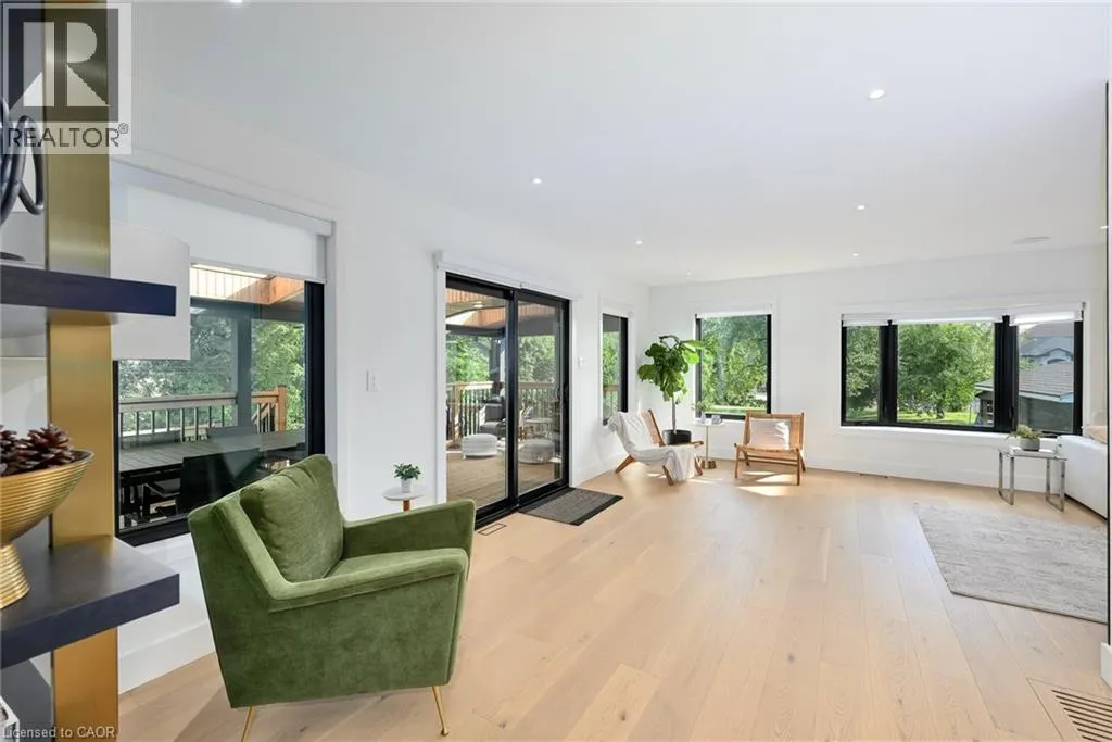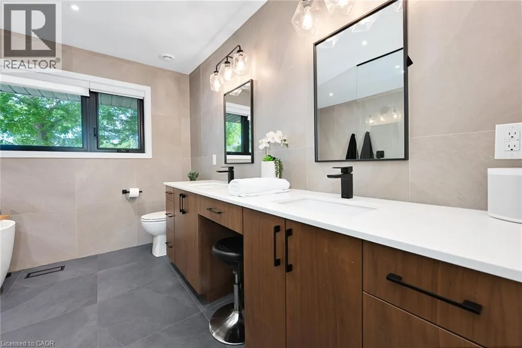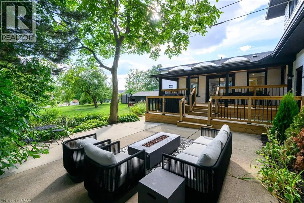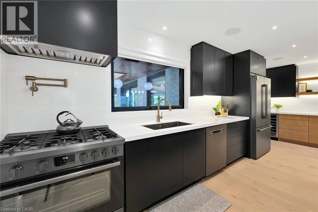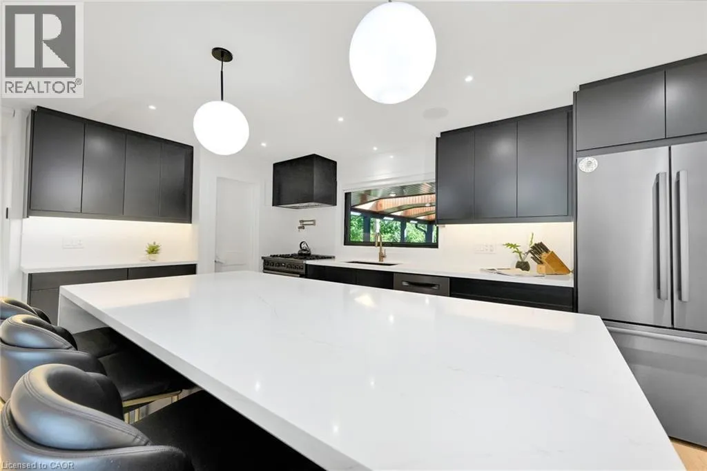 East on Stone Church Rd E from Upper James Welcome to 162 Stone Church Rd E! This stunning 7-bedroom, 4-bath home on a massive 75 x 167 ft lot offers space, luxury, and flexibility for multi-generational living. The main floor showcases an open-concept kitchen/dining area with oversized waterfall island, high-end Bosch appliances, quartz counters and full-height quartz backsplash, pot-filler, bar area with sink and fridge, and under-cabinet lighting. A spacious living room with oversized windows opens to a 220 sq ft covered patio with 3 brand new skylights. The primary suite boasts dual walk-in closets and a spa-inspired ensuite with 5x5 walk-in shower, rain head, freestanding tub, makeup vanity, and premium fixtures. Upstairs includes 3 bedrooms plus a separate office, while the bright lower level offers 3 large bedrooms, a full kitchen, dining and living areas, and a walk-up to the oversized garage. Outdoor living shines with a two-tier covered deck, 400 sq ft concrete patio, beautiful step garden, and expansive yard with large shed. Smart-home ready with Sonos, smart switches, and 4K AI security cameras with remote monitoring. Major updates include triple-glazed windows (2023), roof (2023), furnace (2023), doors (2023), and 200-amp service (2024). Just 2 mins to the LINC, 5 mins to Lime Ridge Mall, and steps to all Upper James amenities! (id:27476)