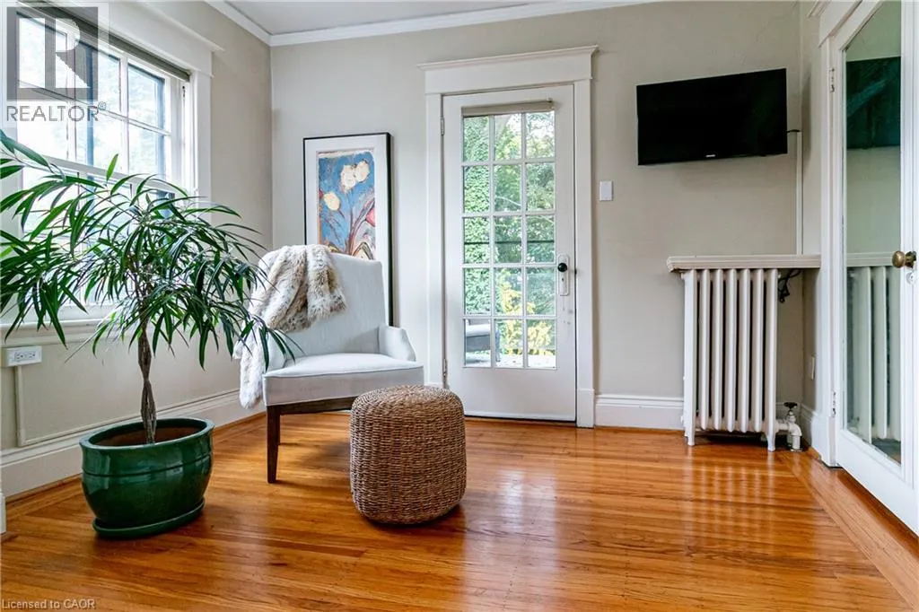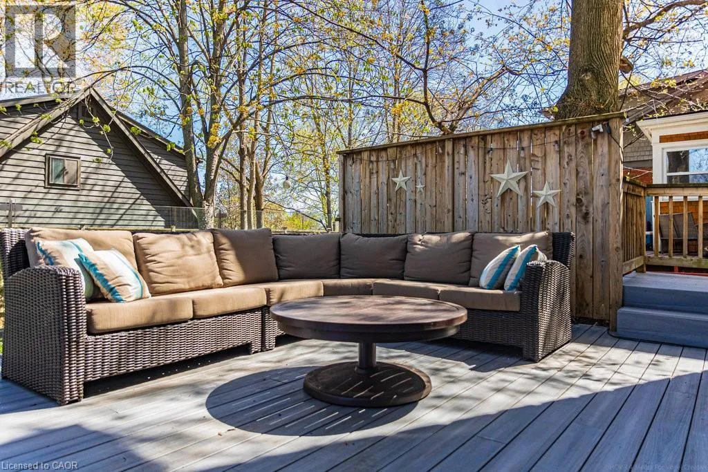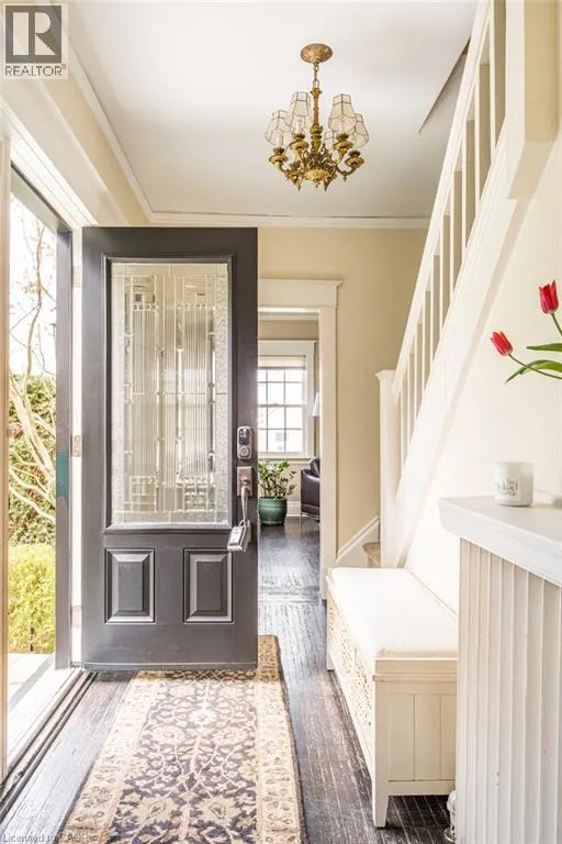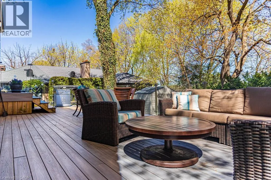 Queen Street to Amelia Street Welcome to this prestige, hidden jewel on one of Hamilton's most premier streets. Just steps from vibrant Locke Street, this beautifully updated West End classic blends timeless charm with thoughtful modern upgrades on a large, landscaped lot featuring mature trees, a tranquil pond, and front yard irrigation. The double-brick home with updated stucco and a striking metal roof offers exceptional curb appeal. Inside, a bright center hall plan showcases original dark oak floors throughout - including a three-storey rear addition. The sun-filled living room features a new gas fireplace (2023), French doors, and a cozy sunroom, while the formal dining room is ideal for entertaining. The custom kitchen boasts engineered recycled quartz counters, built-in appliances, a gas range, adjacent powder room, bar area, and ample storage. Upstairs, the spacious primary suite includes a sitting area, walk-in dressing room, luxurious 5-piece ensuite, with access to a private composite deck. Two additional bedrooms - one part of the addition share an updated main bath with double vanity. A laundry chute connects to the lower level for added convenience. The walkout basement offers future potential with rough-ins from a former bath and access below the rear addition and composite decking Lovingly maintained with original features like horsehair plaster and storm windows, this rare gem offers character, comfort, and location close to top schools, transit, the GO station, and ready access to trails, Chedoke Golf course and highway access. Don't miss this opportunity to own a piece of Hamilton's heritage, refreshed for modern living. (id:27476)
