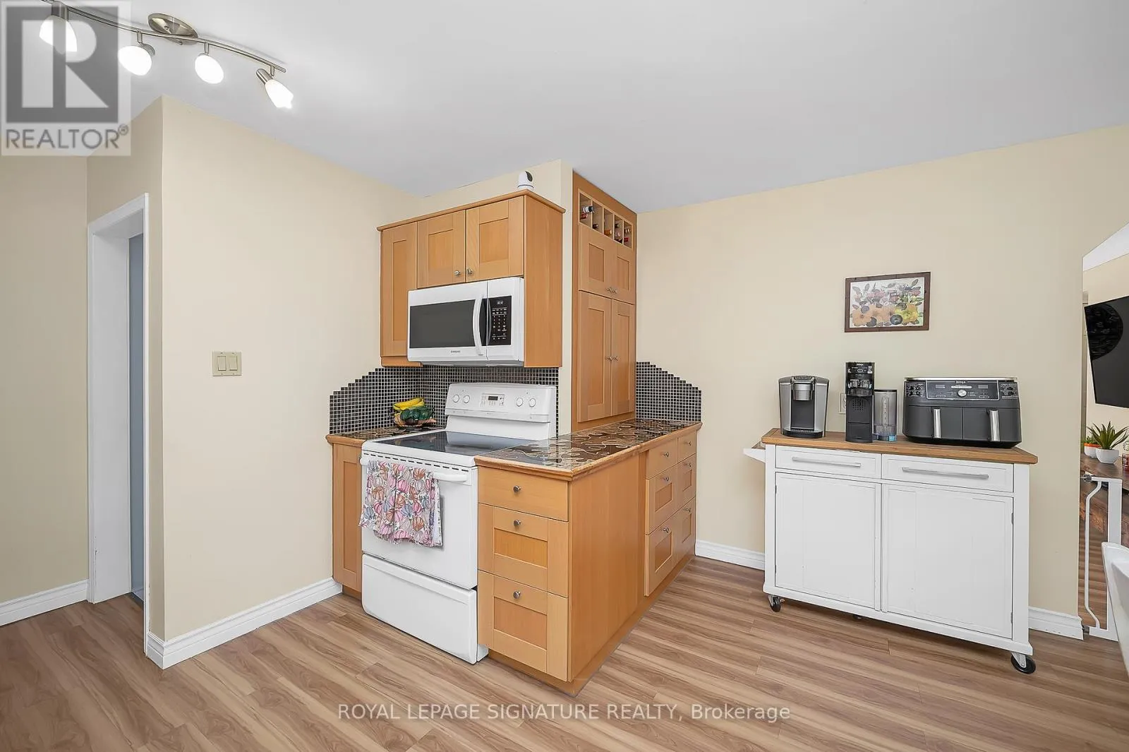BARTON ST.E. & LAKE AVE. NORTH The Hamilton-Toronto Go Train service is days away! Nestled on the border of desirable Stoney Creek and minutes from the new Go Train station this charming bungalow offers a blend of modern updates and cozy comfort, making it an ideal home for families and individuals alike.The property boasts a range of appealing features that enhance its practicality and aestheticappeal.One of the key highlights is the updated kitchen, which showcases uniquely styled quartz countertops that add a touch of sophistication and elegance. The vinyl flooring throughout the home ensures durability and easy maintenance, creating a seamless flow from room to room. The main bathroom features a soothing soaker tub, perfect for relaxing after a busy day, providing a spa-like experience within the comforts of home.The principal bedroom is spacious and includes a substantial wardrobe, offering ample storage space for clothing and personal items. For entertainment and family gatherings, the large recreation room stands out with its vinyl flooring and trendy industrial-style open ceiling,creating a modern and inviting atmosphere for leisure and social activities.Additional storage and practicality are catered to by the furnace room, which provides generous space for storage and a workshop area, making it convenient for home projects and organizational needs. Step outside to discover a large deck and an enormous backyard backing onto green space, creating a private oasis for outdoor activities.The backyard's size and enclosed design make it perfect for families with children and pets,offering a secure environment for outdoor play.Furthermore, a separate garage located at the back of the property with side access provides additional parking and storage options. The overall layout and features of this bungalow makeit a perfect family home or a peaceful retreat for anyone seeking comfort, style, and functionality. (id:27476)