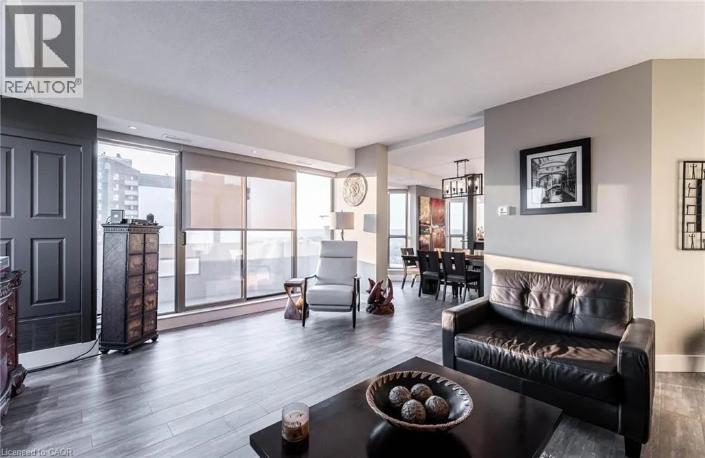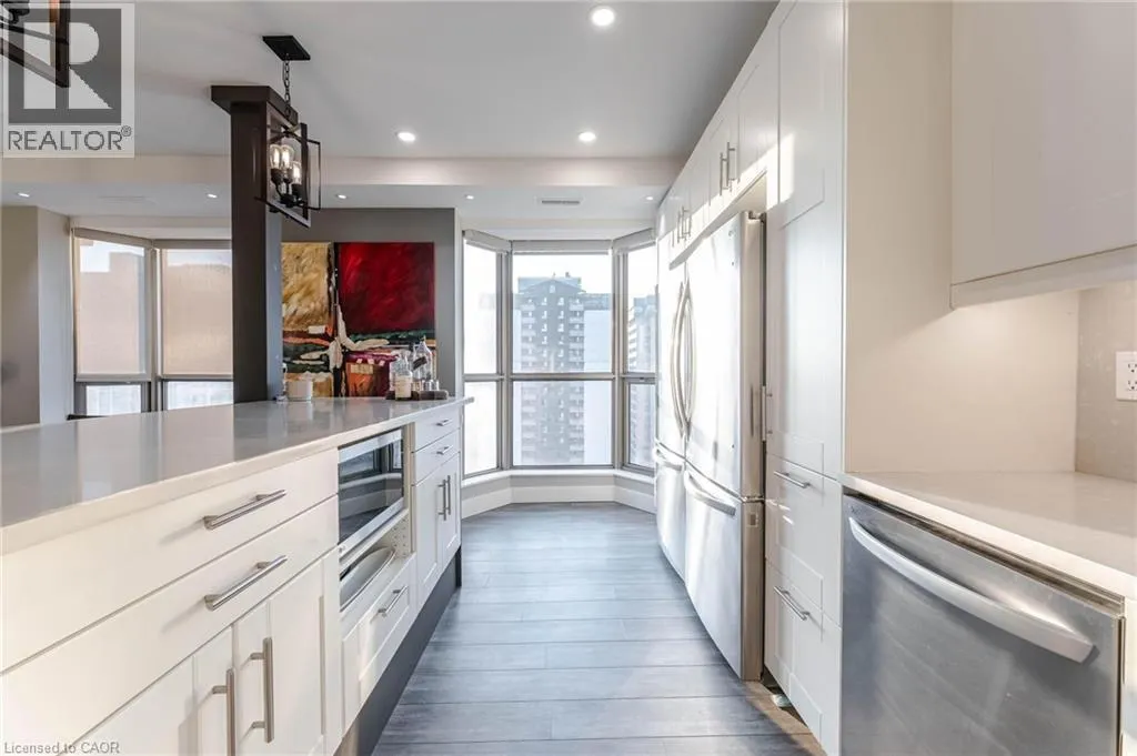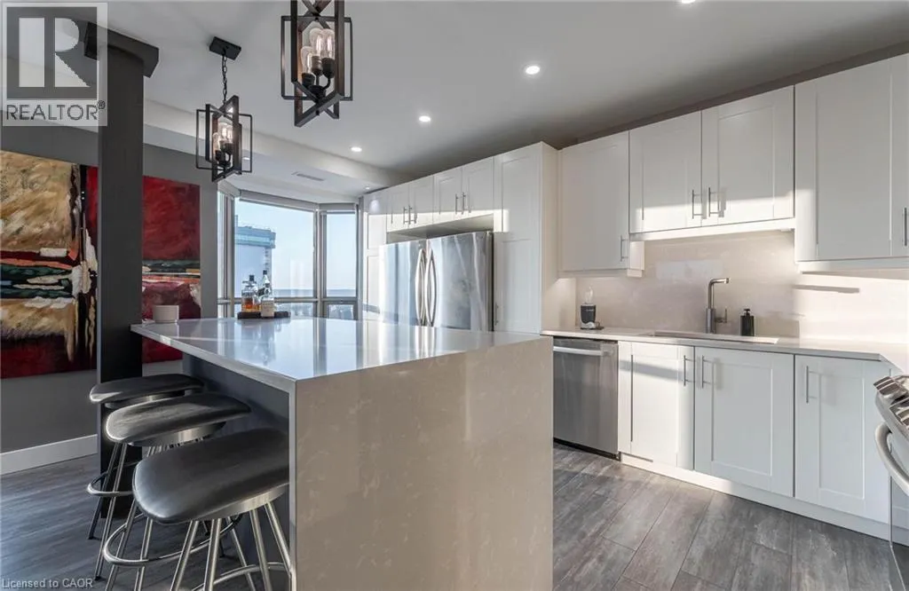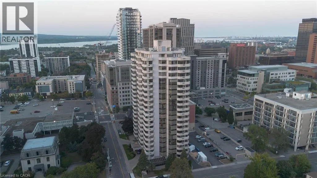 Bay St to Jackson St W to Caroline St S Enjoy The View Of Gorgeous Sunsets!! Once you come in you wont want to leave. Great west Hamilton location.Paneramic views of city, escarpment and lake Ontario. Beautiful open living, dining and kitchen area with 9' foot ceilings. Kitchen , baths and most flooring renos done since 2020.Kitch Island 3'.5 x 8'Accent LED lighting throughout.Rap around balcony off living room.2nd Balcony from primary bedroom with ensuit bath. Furnace and central air Combo unit replaced in 2020. One excusive underground parking spot. All windows and sliding doors replaced March 2025 Including all Blinds some are on remotes. A must to view. (id:27476)