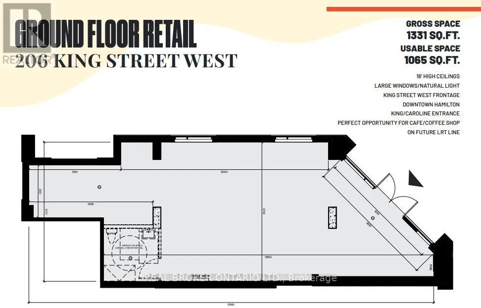 Cross Streets: Caroline Street. ** Directions: King Street West And Caroline Street. Prime ground-floor hospitality/retail opportunity at the brand new Radio Arts Condos in the heart of Downtown Hamilton! This exceptional space, available for lease or sale, boasts prominent King Street West frontage with large windows, ensuring maximum visibility and a built-in customer base from the 122 residential suites above. Sidewalk level access makes for easy walk-in traffic. Soaring 16' ceilings and abundant natural light create an inviting atmosphere, while convenient access via King/Caroline and the future LRT line enhance accessibility. This commercial space is ideal for coffee shops, restaurants, or a variety of retail ventures seeking a thriving downtown location. Taxes no yet assessed (id:27476)