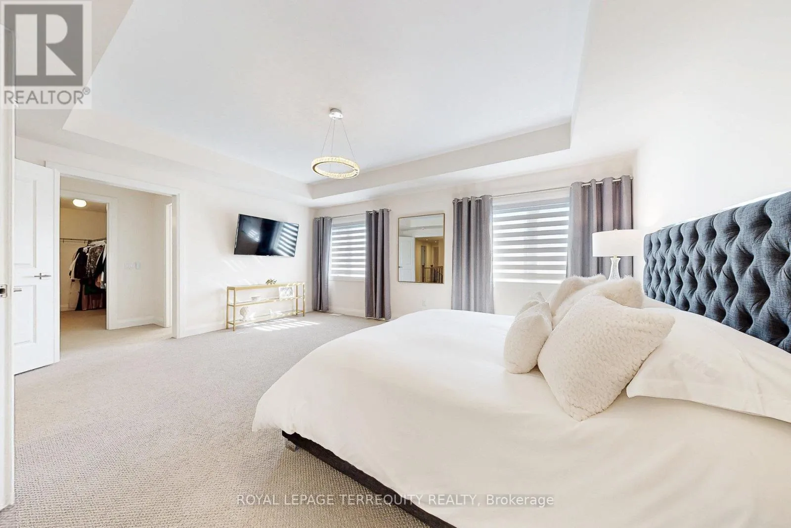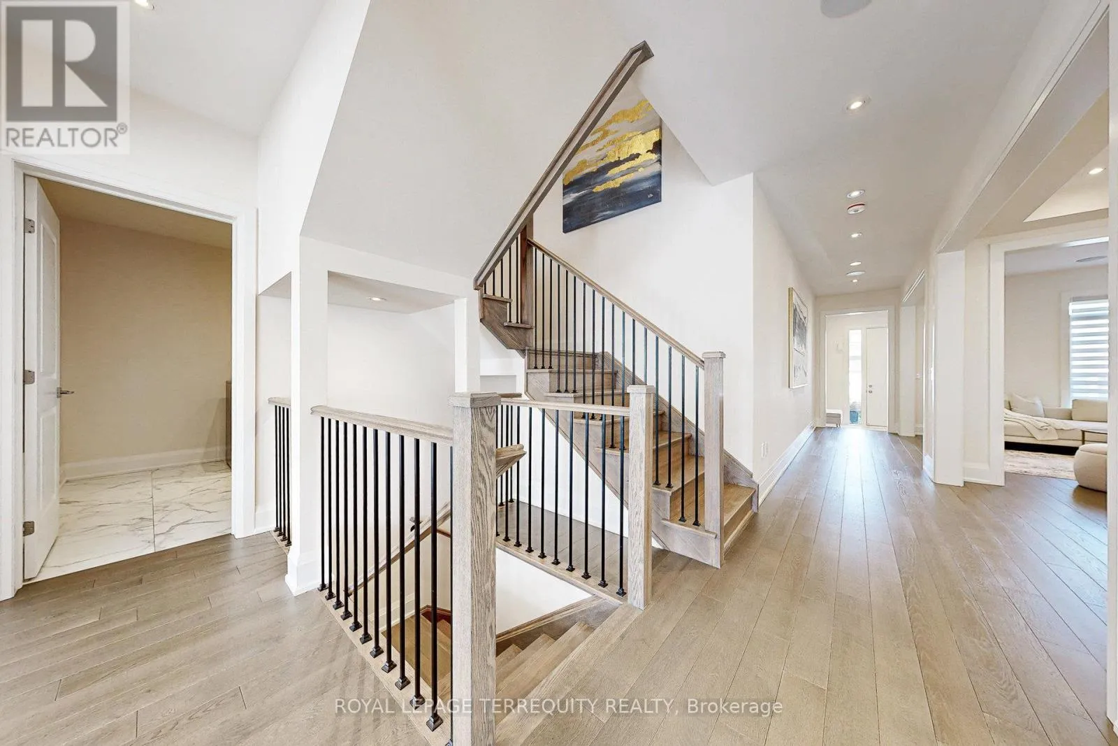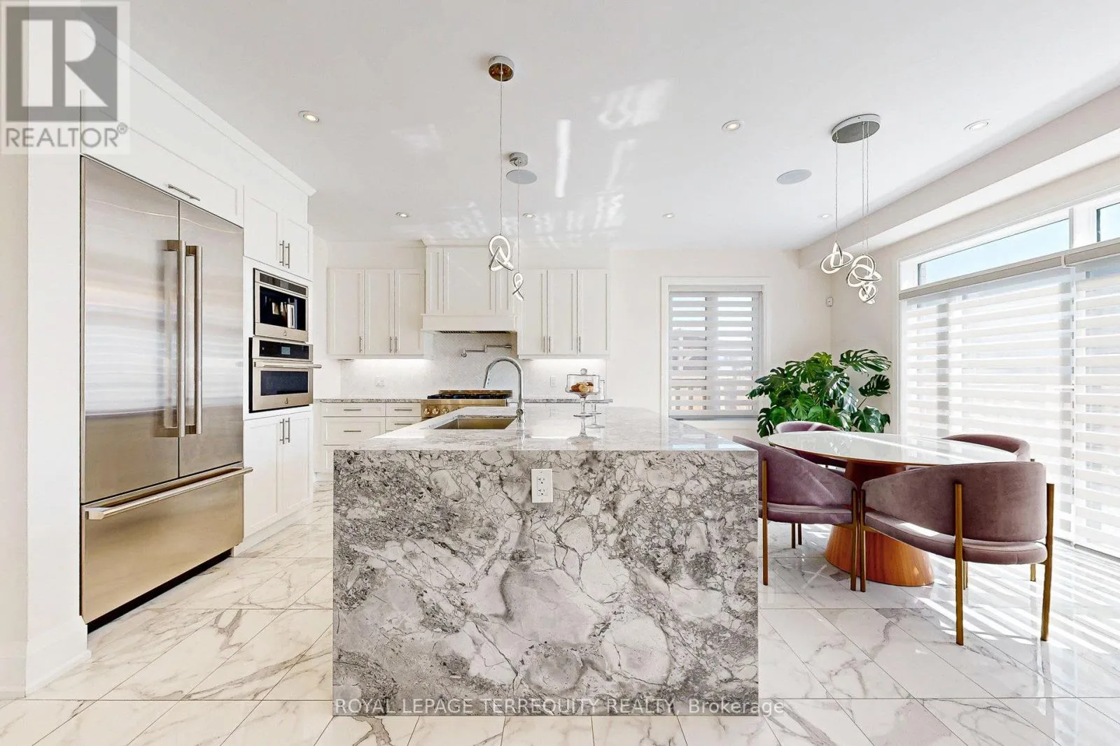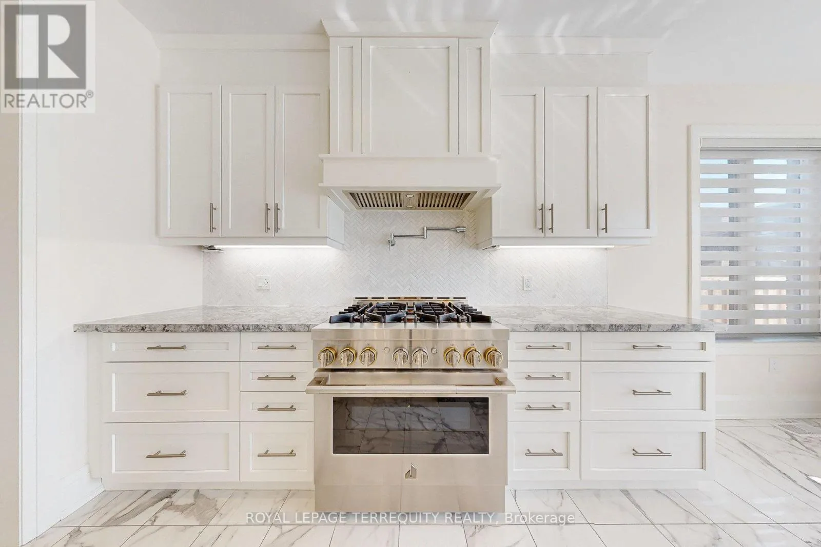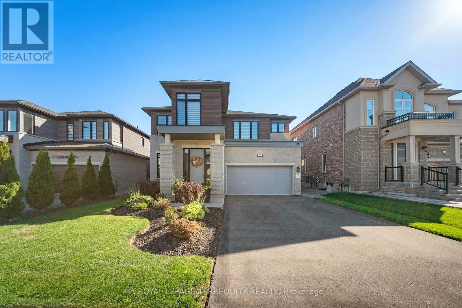 Cross Streets: Stonehenge and Raymond. ** Directions: Take Whittington from Raymond. An exceptional custom home at 52 Lightfeather Place, tucked within the coveted Tiffany Hills enclave of Ancaster is for sale. This sophisticated residence blends high-end finishes with smart-home technology, offering a turnkey experience for the discerning buyer. Step inside to discover 6" baseboards on the main floor, matched with an elegant spindle railing detail. The home is lit throughout by recessed lighting (a $30,000 install) along with decorative pendulum fixtures in hallways, kitchen, and baths. Even the showers boast dedicated ceiling lights + ceiling tile to accentuate your spa-like experience. A complete Louvolite electronic blind system is integrated throughout with blackout blinds in all bedrooms allowing effortless light control at the touch of a button. The open-concept kitchen is nothing short of remarkable: a large marble waterfall island with storage under the breakfast bar, oversized undermount sink. Upgraded backsplash, pot-filler, 12"x24" tile floors, and full suite of Jennair appliances (microwave/convection oven, 6-burner gas range, dishwasher, built-in espresso machine, plus a bar/wine fridge in the servery). A 36" built-in hood is seamlessly integrated into custom cabinetry. The servery also received added upper cabinets as an upgrade. Entertainment is front and centre: surround sound wiring on the main-floor family room, plus a sound system with eight main-floor speakers and one in the primary ensuite bathroom. Hardwood floors in a subtle grey tone drift through the main level, with upgraded tile in bathrooms. The fireplace is crowned by a custom mantle upgrade to elevate the focal point of the great room. Security is robust with six Hikvision hardwired cameras with recording, supplemented by a Ring doorbell. Outdoors, enjoy a beautifully laid interlock patio, professional landscaping, and ambient soffit lighting around the perimeter. (id:27476)