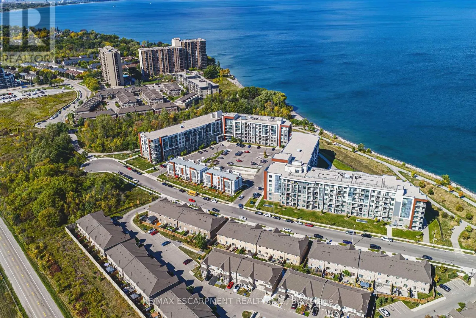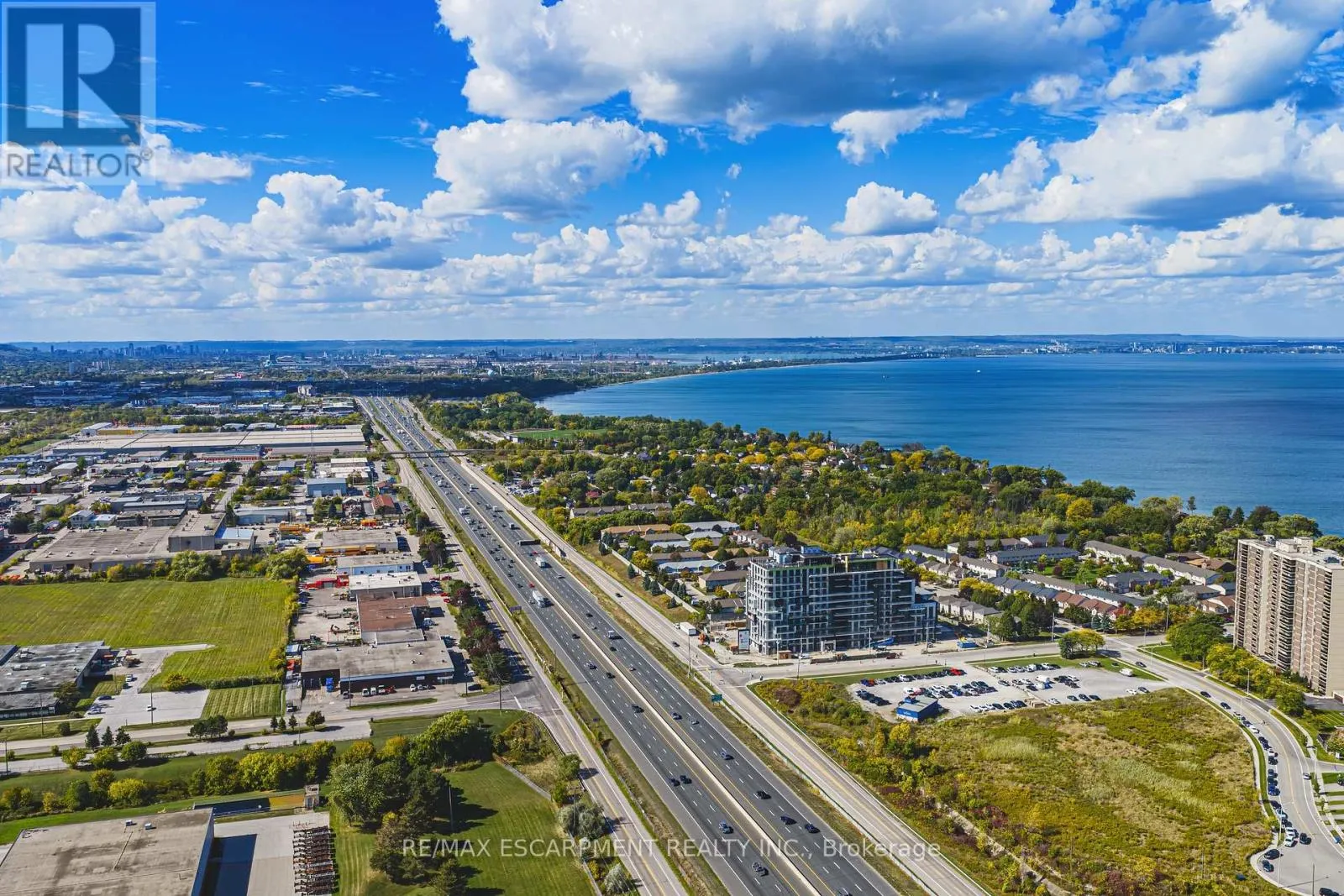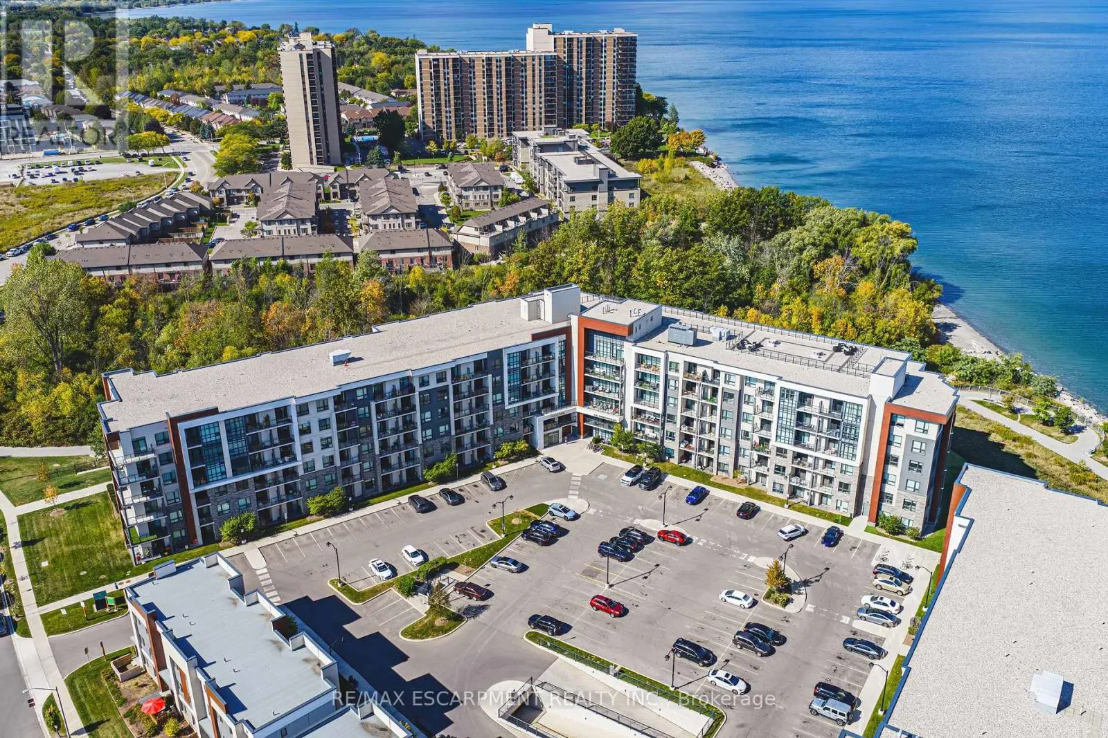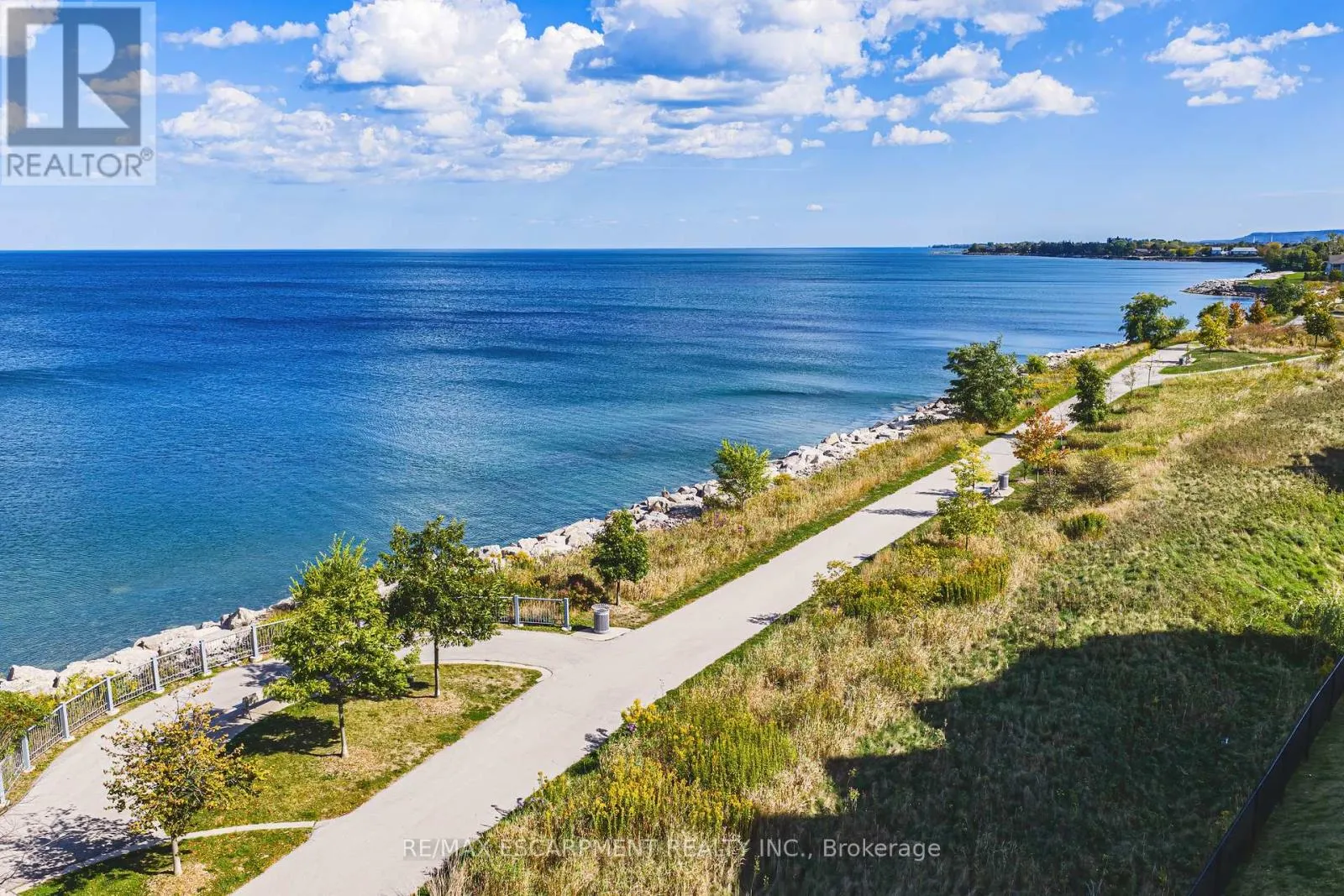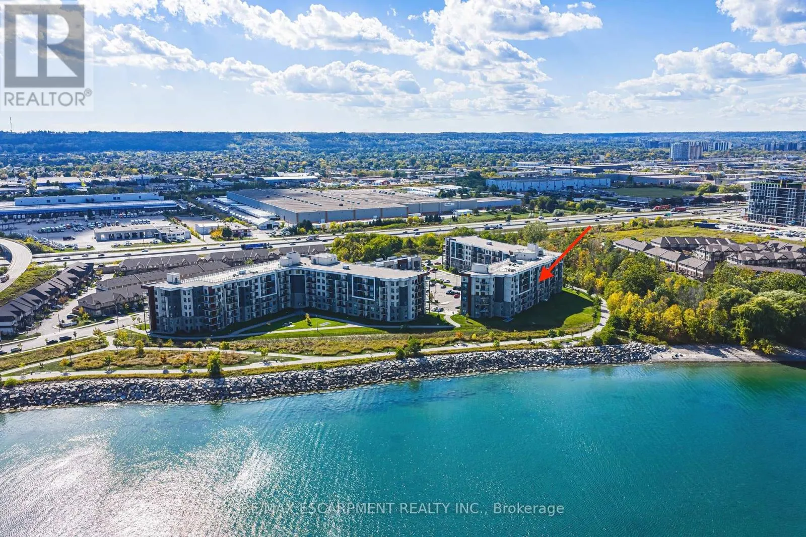 Cross Streets: Millen Road. ** Directions: SHOREVIEW PLACE & MILLED ROAD. This 1 Bed + Den condo offers a modern, open-concept layout with upgrades throughout and an unbeatable spot right along the water. Floor-to-ceiling windows let in tons of natural light and frame stunning views of Lake Ontario, whether you're in the kitchen, living room, or bedroom. The interior is sleek and stylish with a neutral colour scheme, oversized porcelain tile, 9' ceilings, and no carpet just clean, modern finishes like quartz counters, a chevron-tiled backsplash, soft-close cabinets, and stainless steel appliances. The kitchen also includes a large island, deep fridge cabinet, smooth-top stove, and Moen pull-down faucet a solid setup whether you cook a lot or just like the space to entertain. Theres a flexible den space too, perfect for working from home or hosting guests. Step out onto your private balcony to enjoy morning sunrises or an evening glass of wine with nothing but clear lake views ahead. This unit is part of the Sapphire Condos community, backing onto a waterfront trail and private beach that connects to the 8km Hamilton lakeside path ideal for biking, walking, or just getting outside. Amenities include a rooftop patio, gym, party room, secure bike storage, underground parking, and in-suite laundry. Heating and cooling are via energy-efficient geothermal. You're minutes from the QEW, LINC, and the new GO station for easy commuting, and close to local wineries, restaurants, and shopping when you want to unwind. If you're looking for easy, modern living right on the water, this is it! (id:27476)